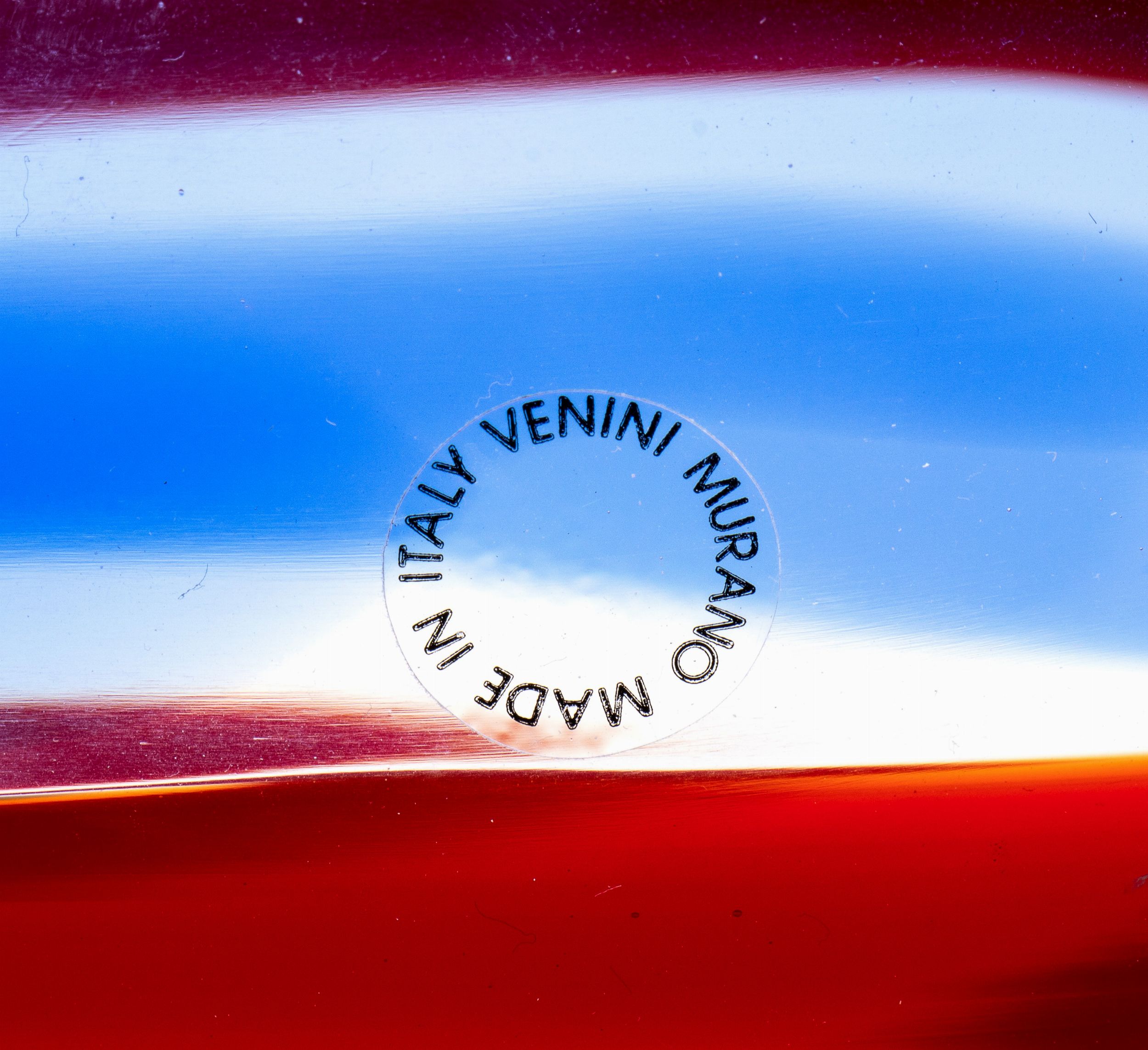Altezza x diametro: 26 x 24 cm. Sul vetro trasparente, prima della soffiatura, sono applicate delle fasce a forma di “anelli” in colore alternato di blu mare e rosso. In vibroincisione con iscrizione: Venini.