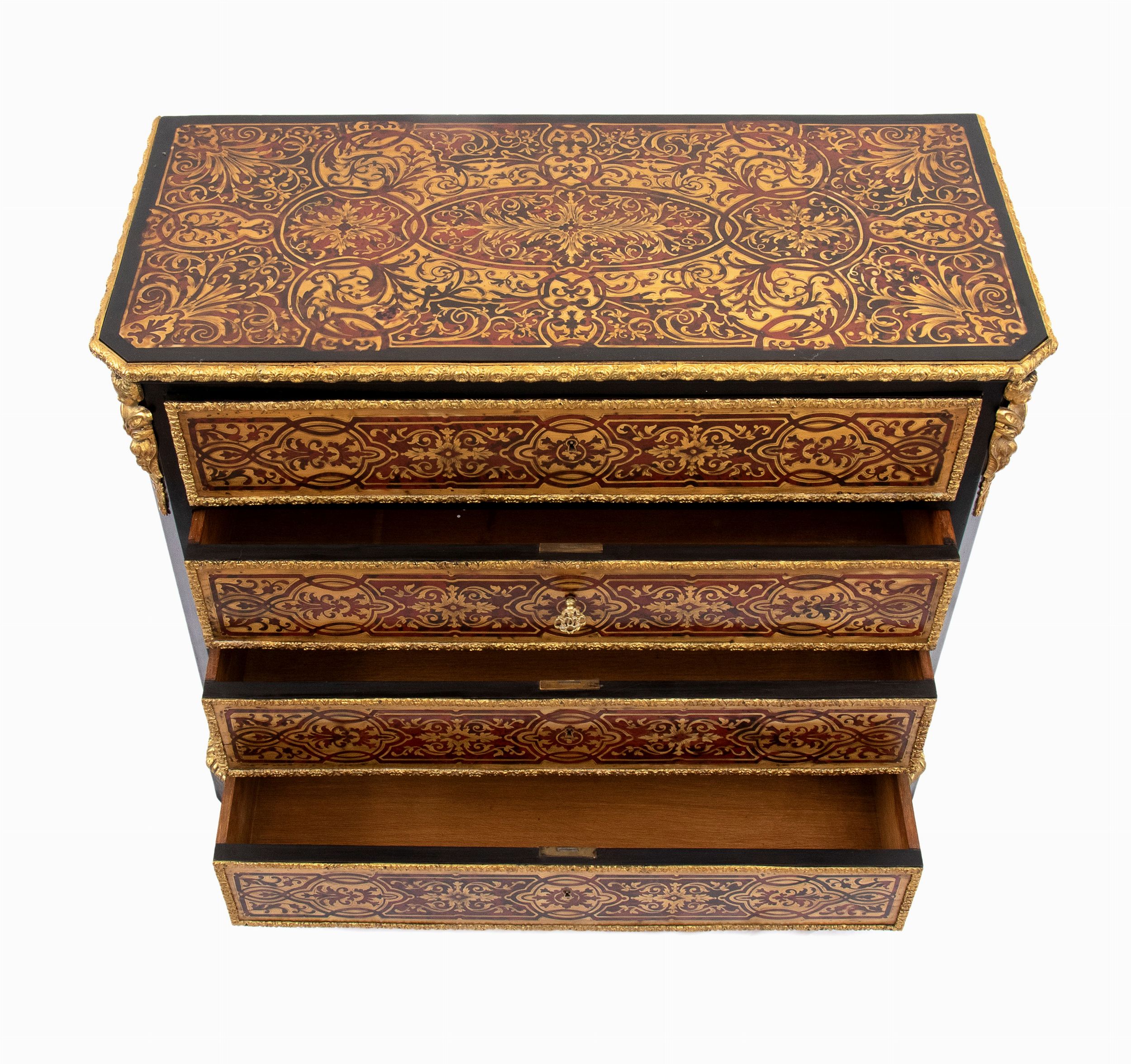 XIX secolo raro cassettone con fronte a quattro cassetti, intarsiato in ottone e tartaruga alla maniera di Charles Boullè, con applicazione in bronzo dorato.