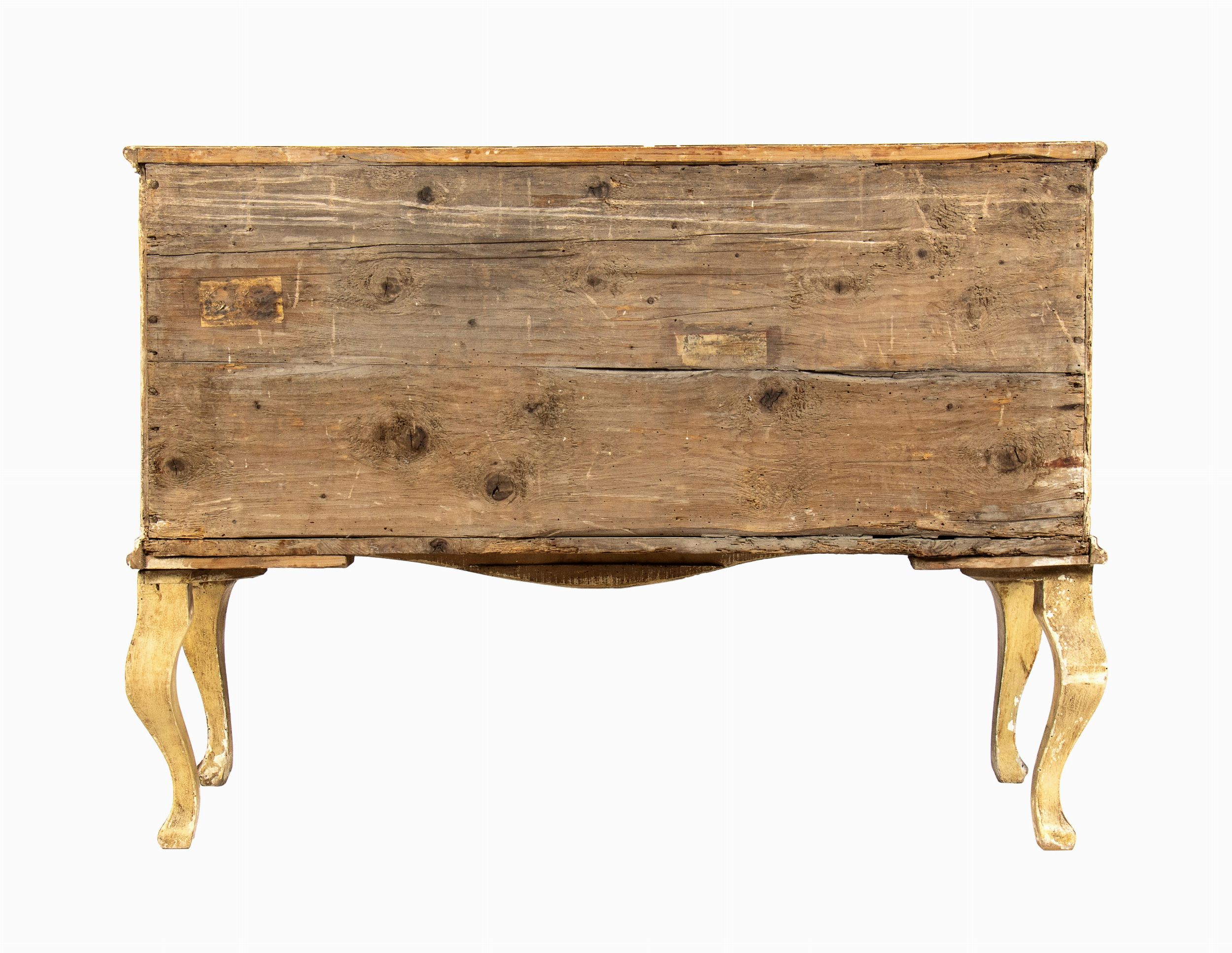 Altezza x larghezza x profondità 91 x 124 x 57 cm. Marche, XVIII secolo in stile Luigi XV con gambe cabriolet e piano a finto marmo, completamente dipinto e su fronte con cassetti con scene di paesaggi marchigiani; i fianchi dipinti a motivi floreali.