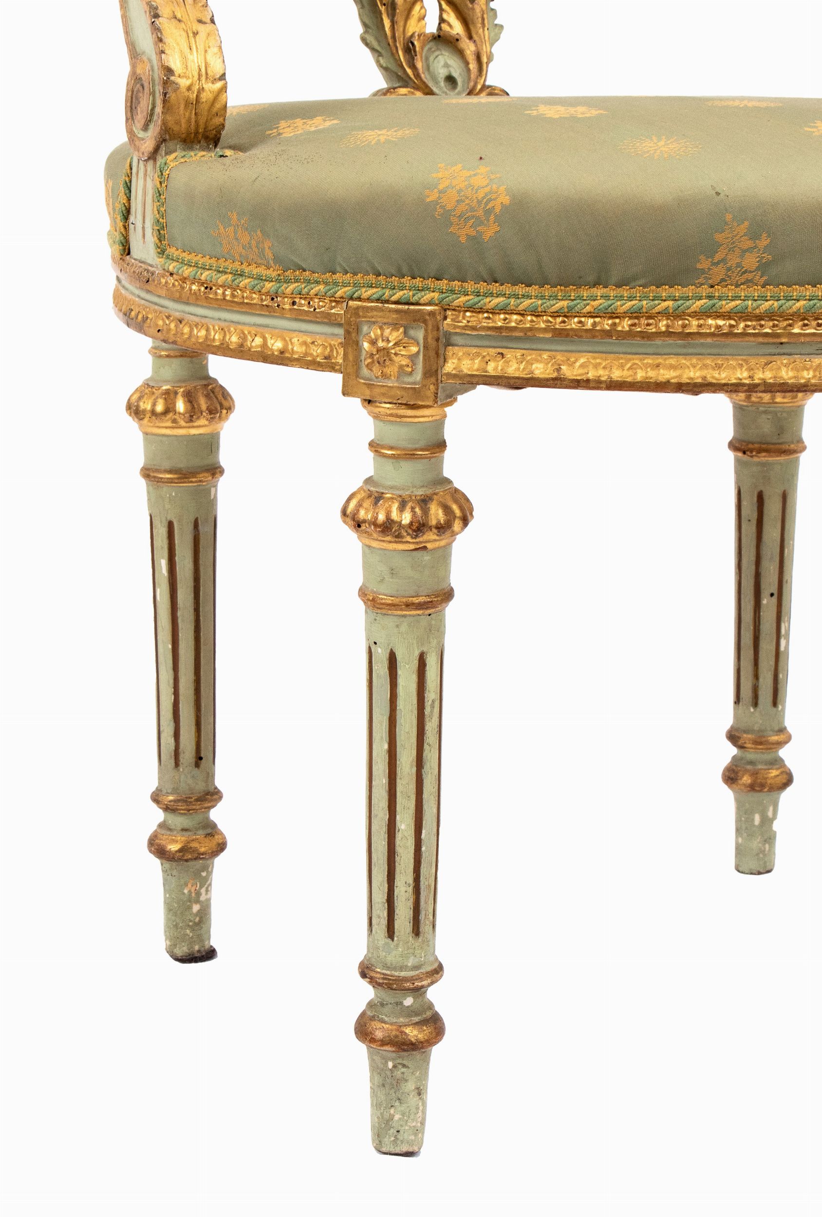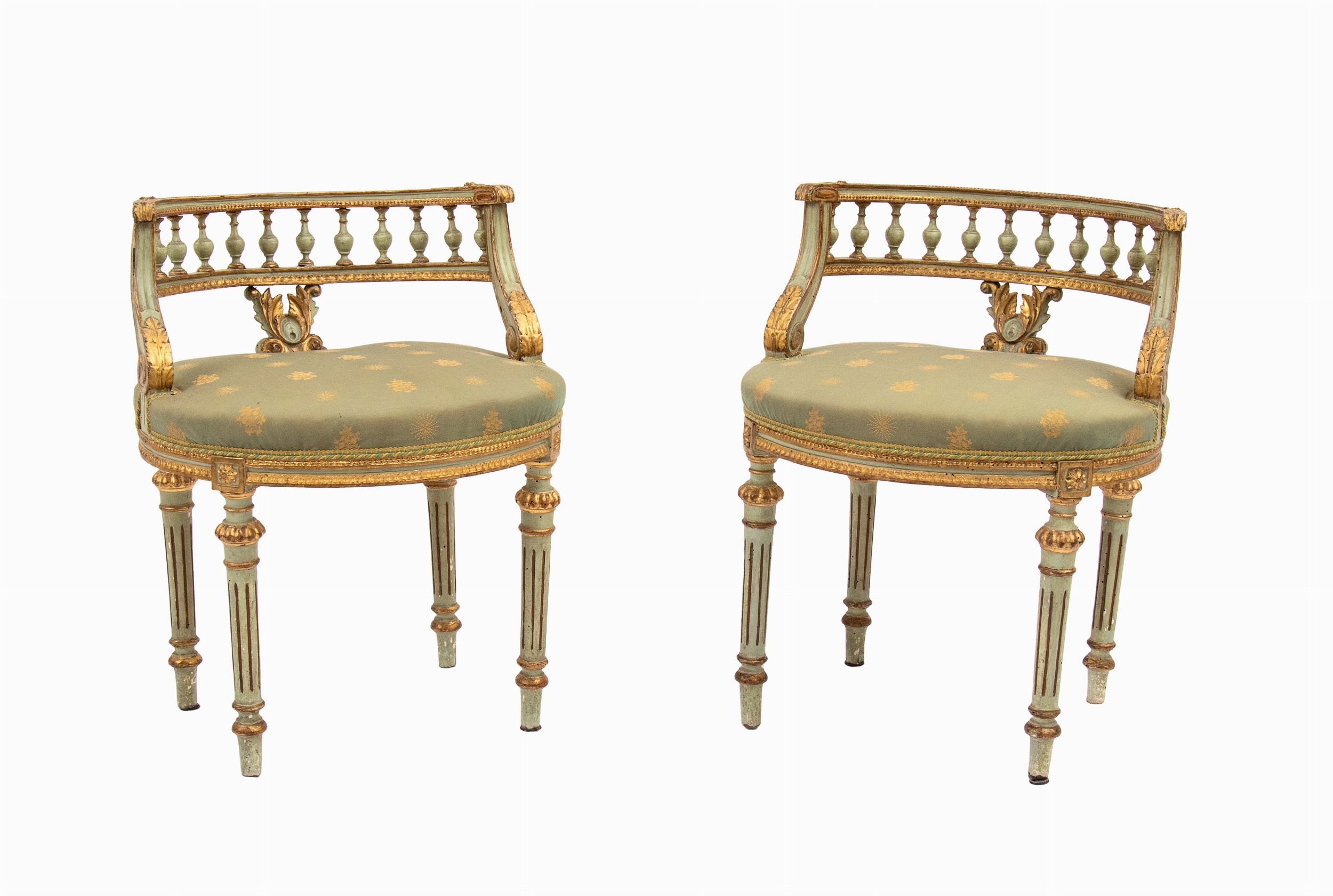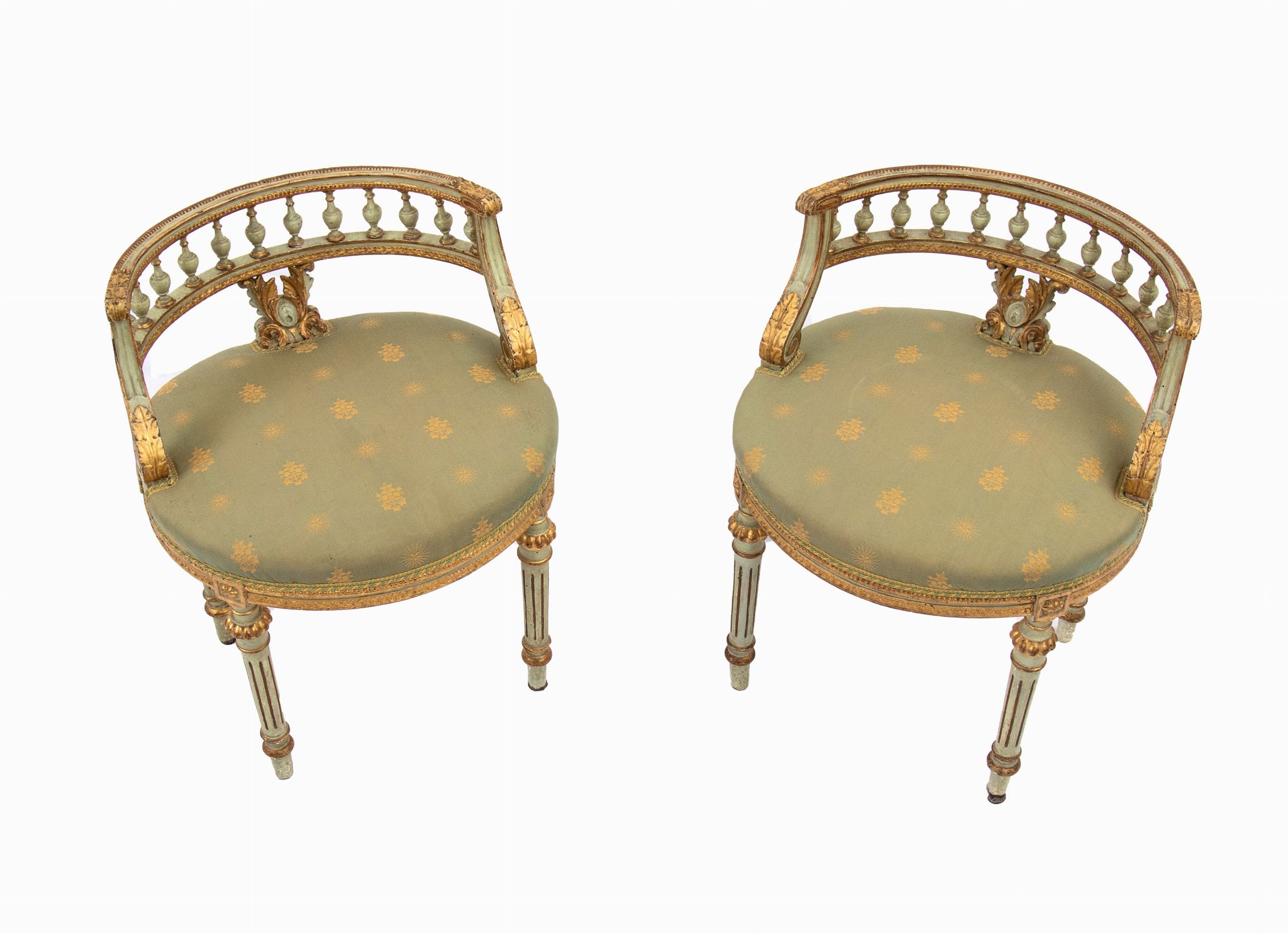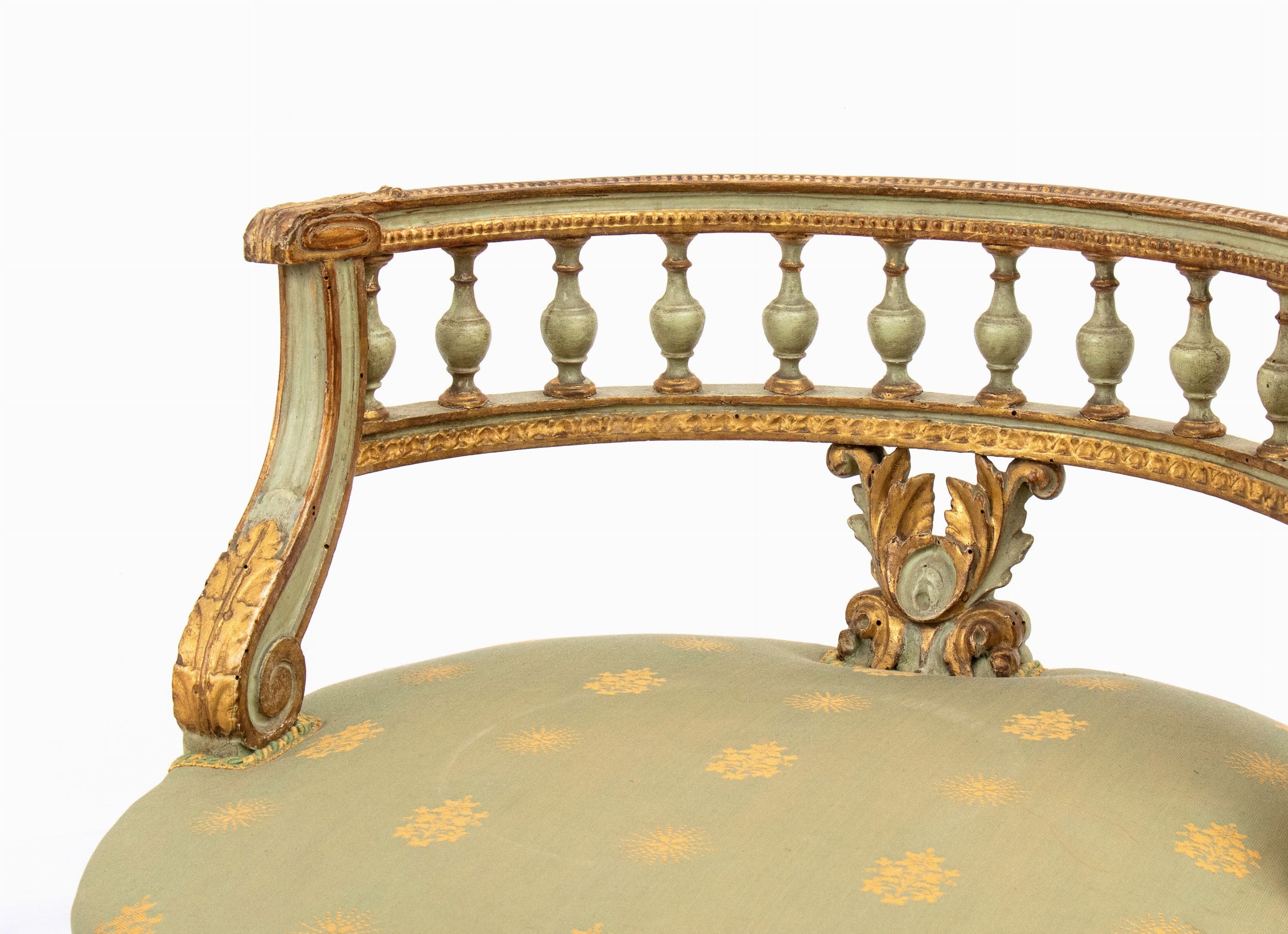 Altezza x larghezza x profondità 78x 107x 46 cm XIX secolo in stile Luigi XVI, le poltroncine in legno intagliato e dorato, la consolle con piano marmorizzato. Altezza x larghezza x profondità poltroncine: 62 x 50 x 43 cm Altezza x larghezza x profondità consolle: 78 x 107x 46 cm