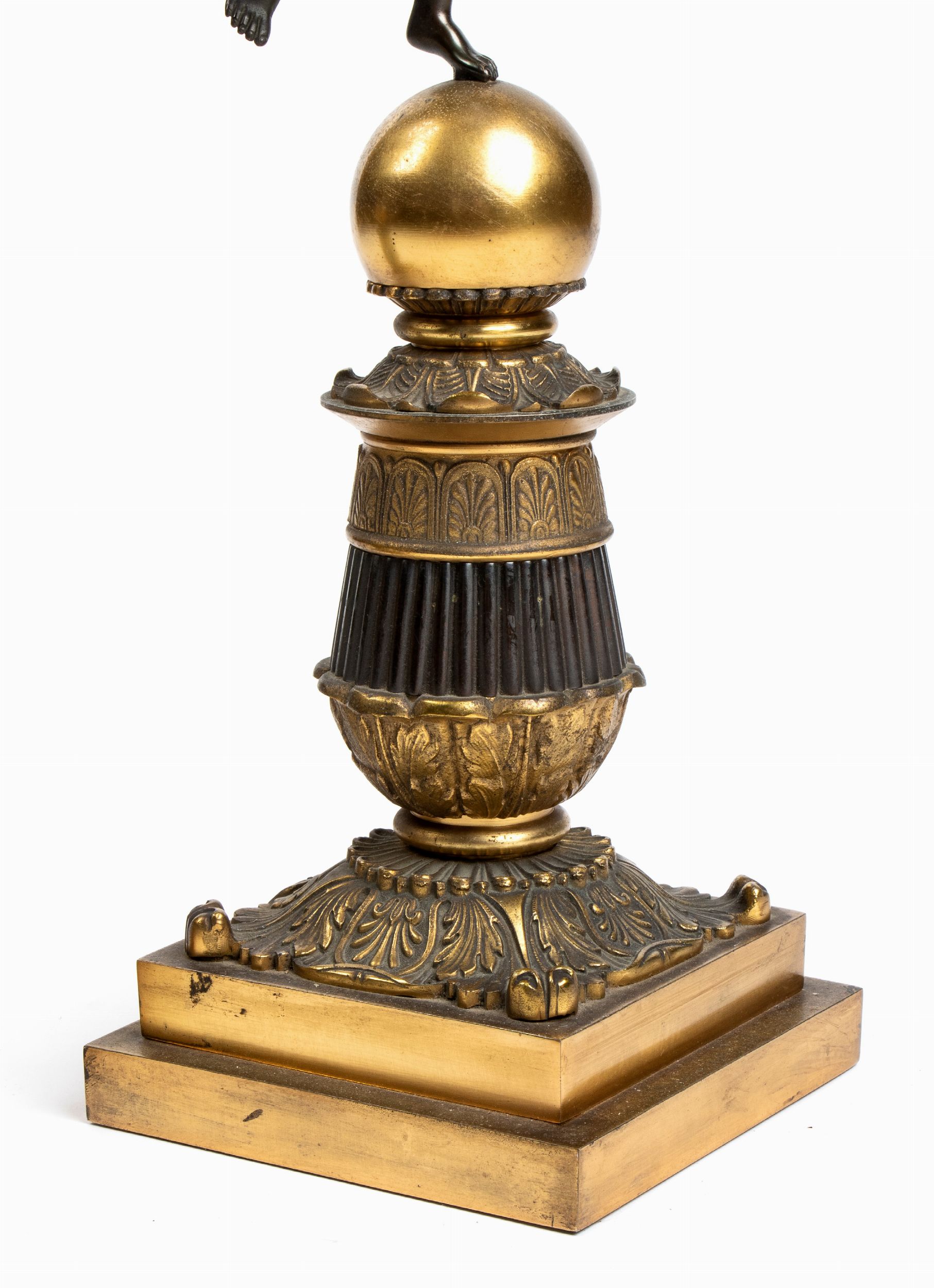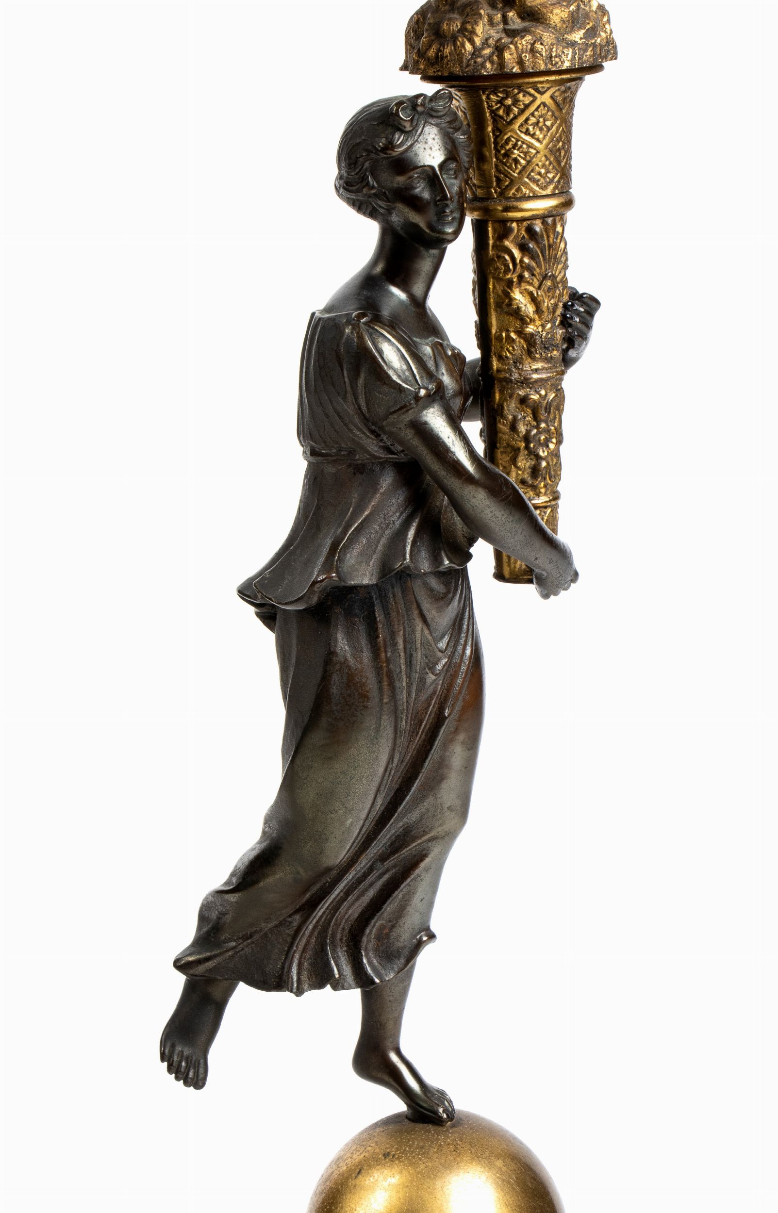 Altezza x larghezza x profondità : 65 x 14 x 14 cm XIX secolo in bronzo dorato e cesellato, con due figure neoclassiche che sorreggono il ceppo centrale da cui si diramano le cinque braccia per le candele. A base quadrata ornata da motivi vegetali in stile neoclassico.