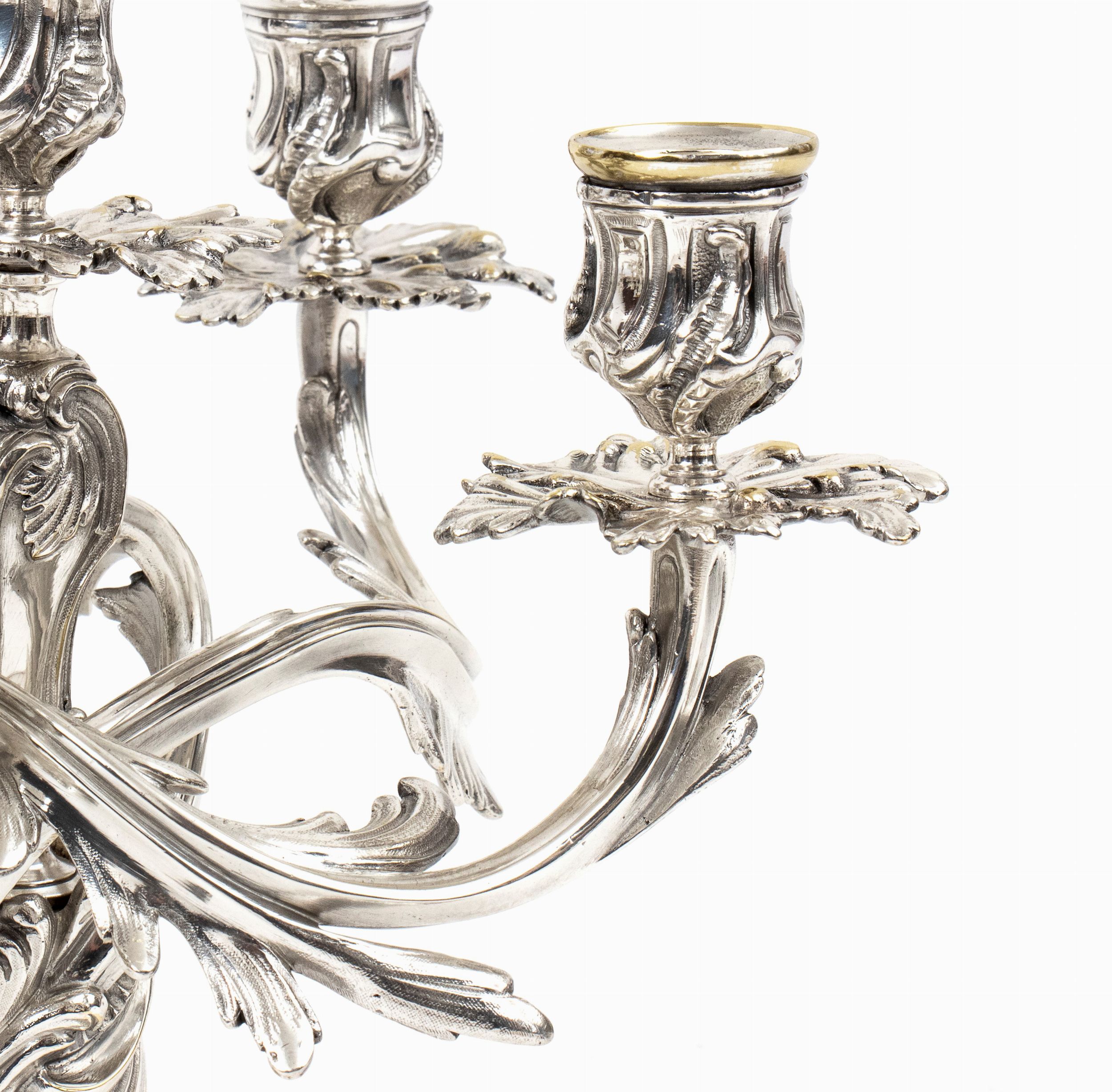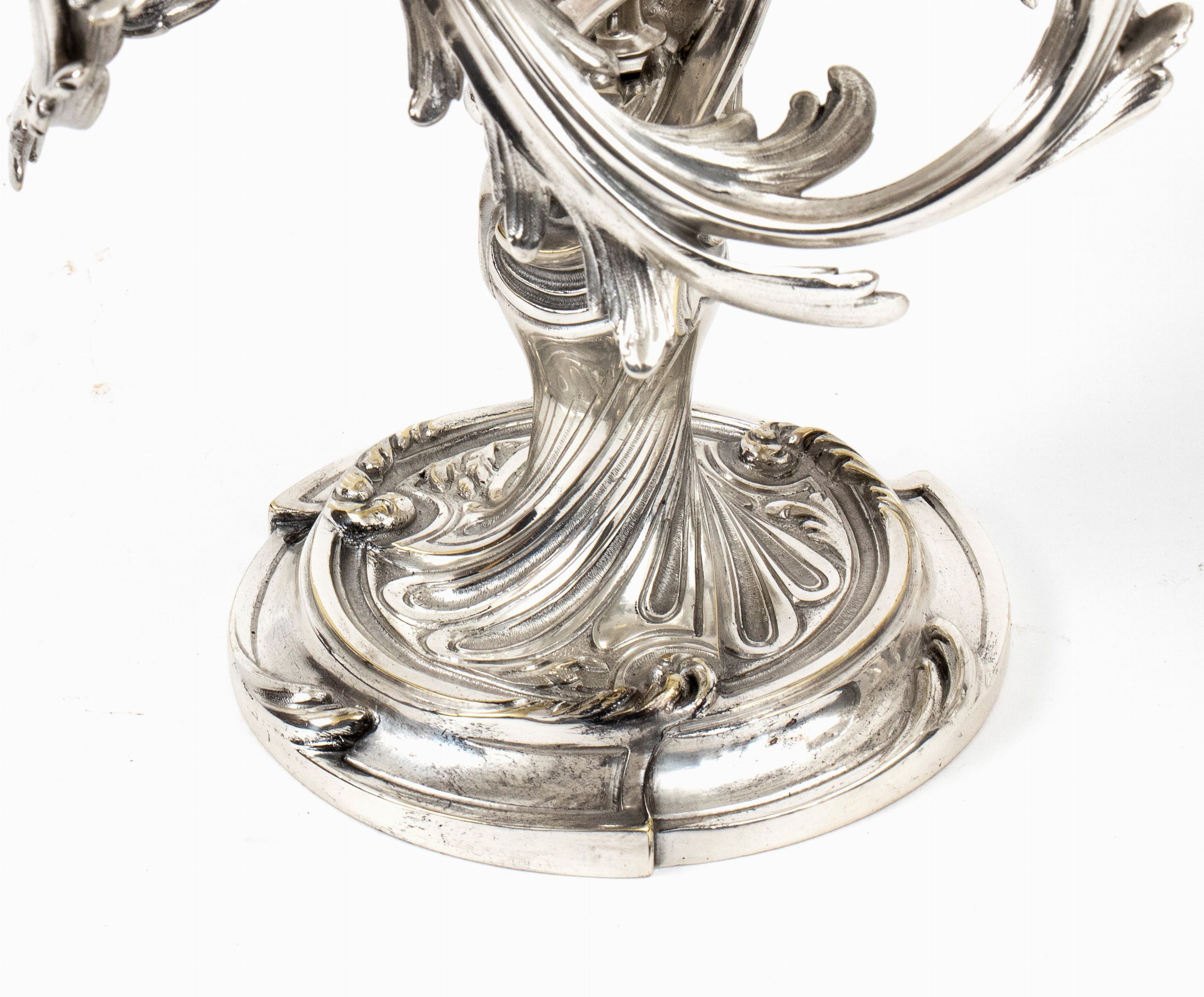 Altezza x larghezza: 27 x 28 cm. Parigi, XX secolo a cinque luci con base modellata e bracci curvilinei che sembrano intrecciarsi tra loro, con dettagli raffinati, impreziositi da foglie e ornamenti floreali. Questi candelabri sono espressione della maestria orafa di Christofle, una delle più prestigiose maison francesi di argenteria, famosa per la sua qualità e innovazione stilistica. Pezzi come questi erano spesso commissionati per case aristocratiche o grandi eventi e rappresentano un perfetto esempio della fusione tra artigianato e arte decorativa. Firmati Christofle, in lega metallica bianca.