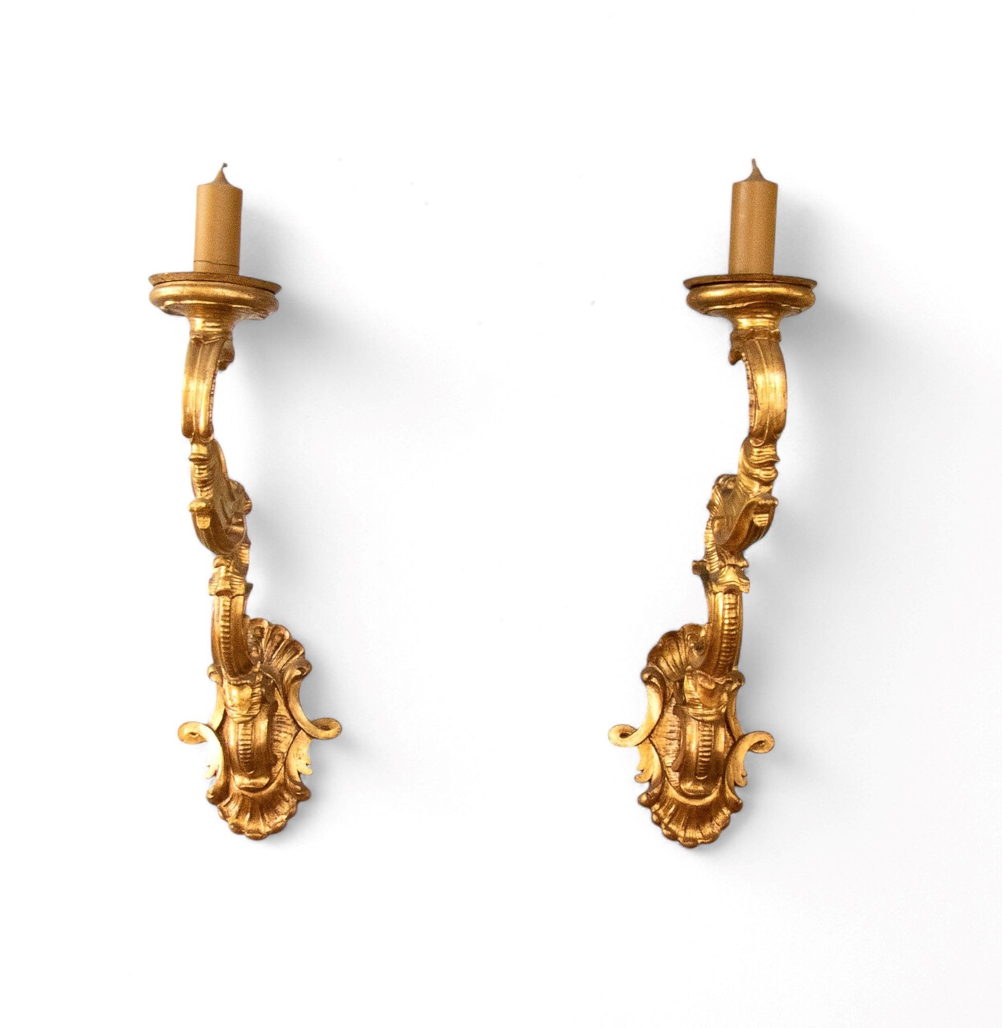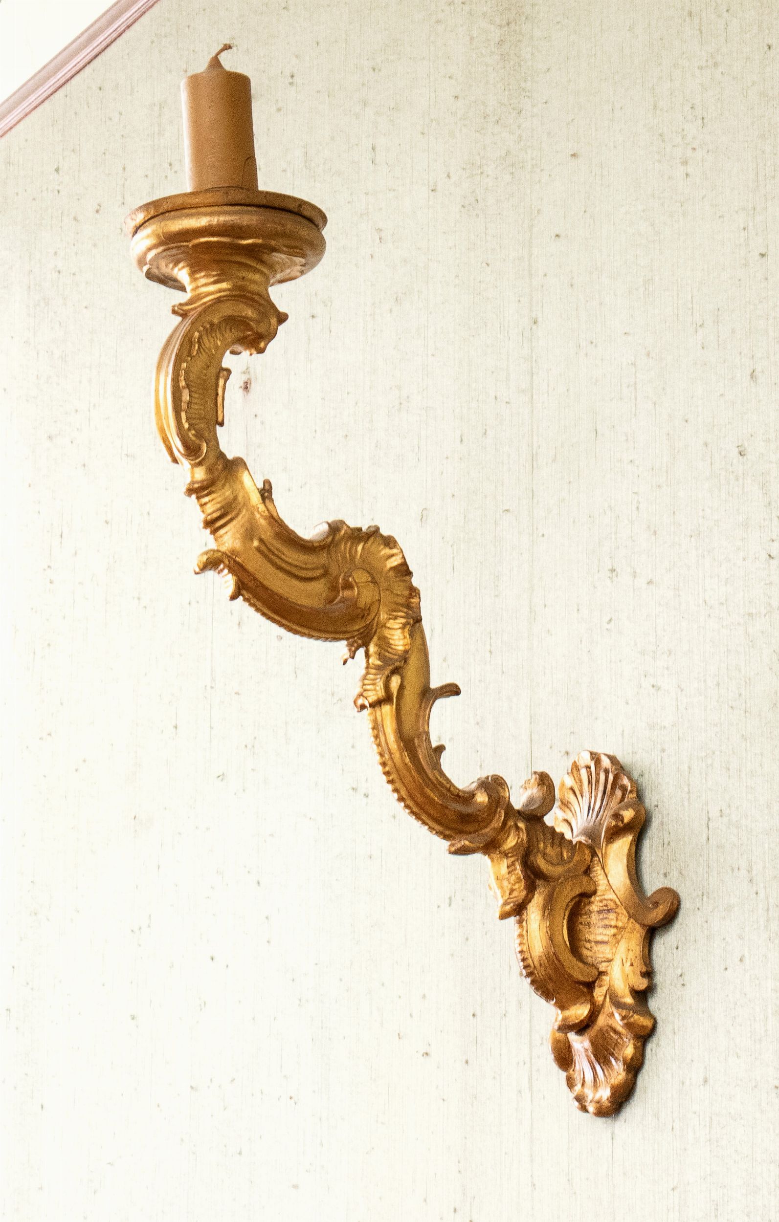 Altezza x larghezza x profondità : 55 x 17 x 30 cm Italia settentrionale, XVIII secolo n legno intagliato e dorato, attacco a muro intagliato a forma di conchiglia concava, bracci intagliati a motivi vegetali che sorreggono il piatto porta candela.