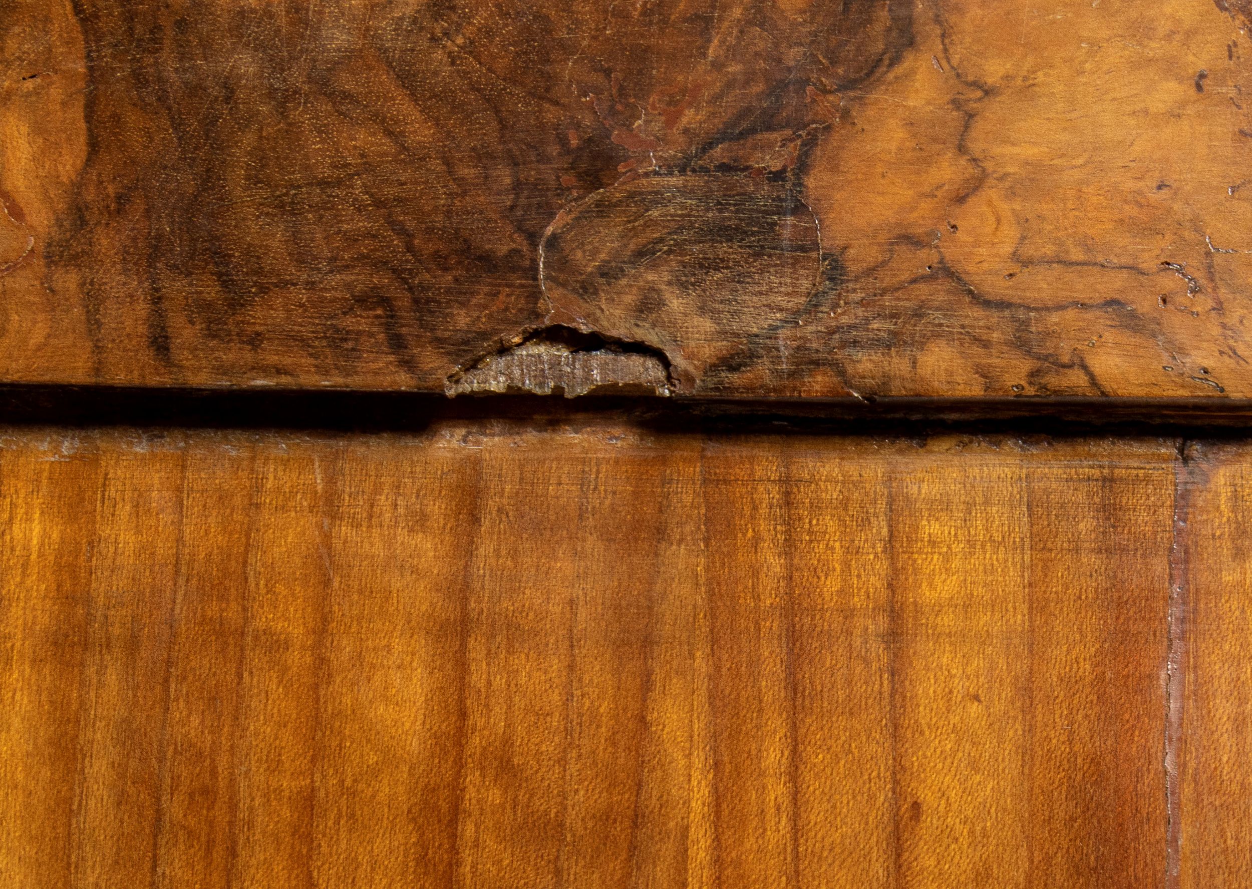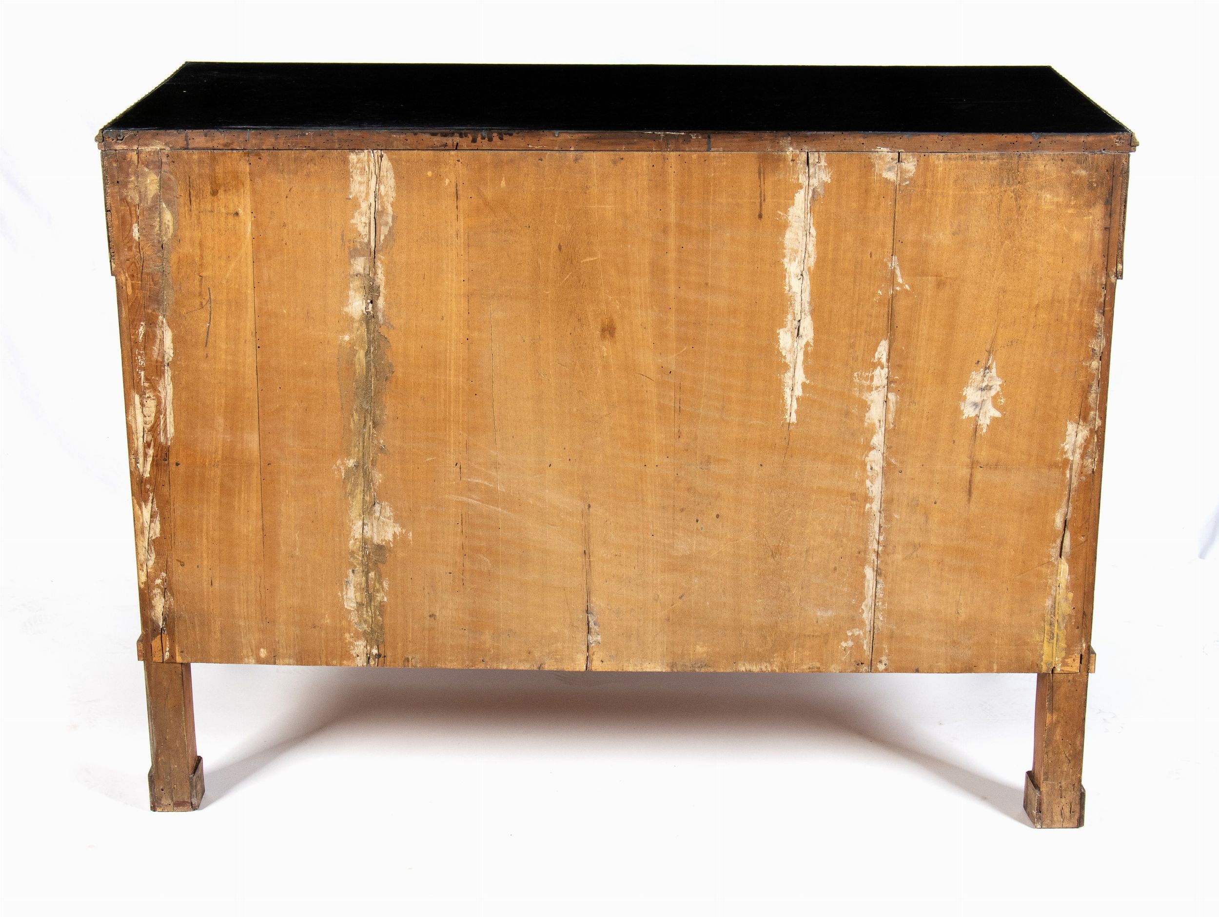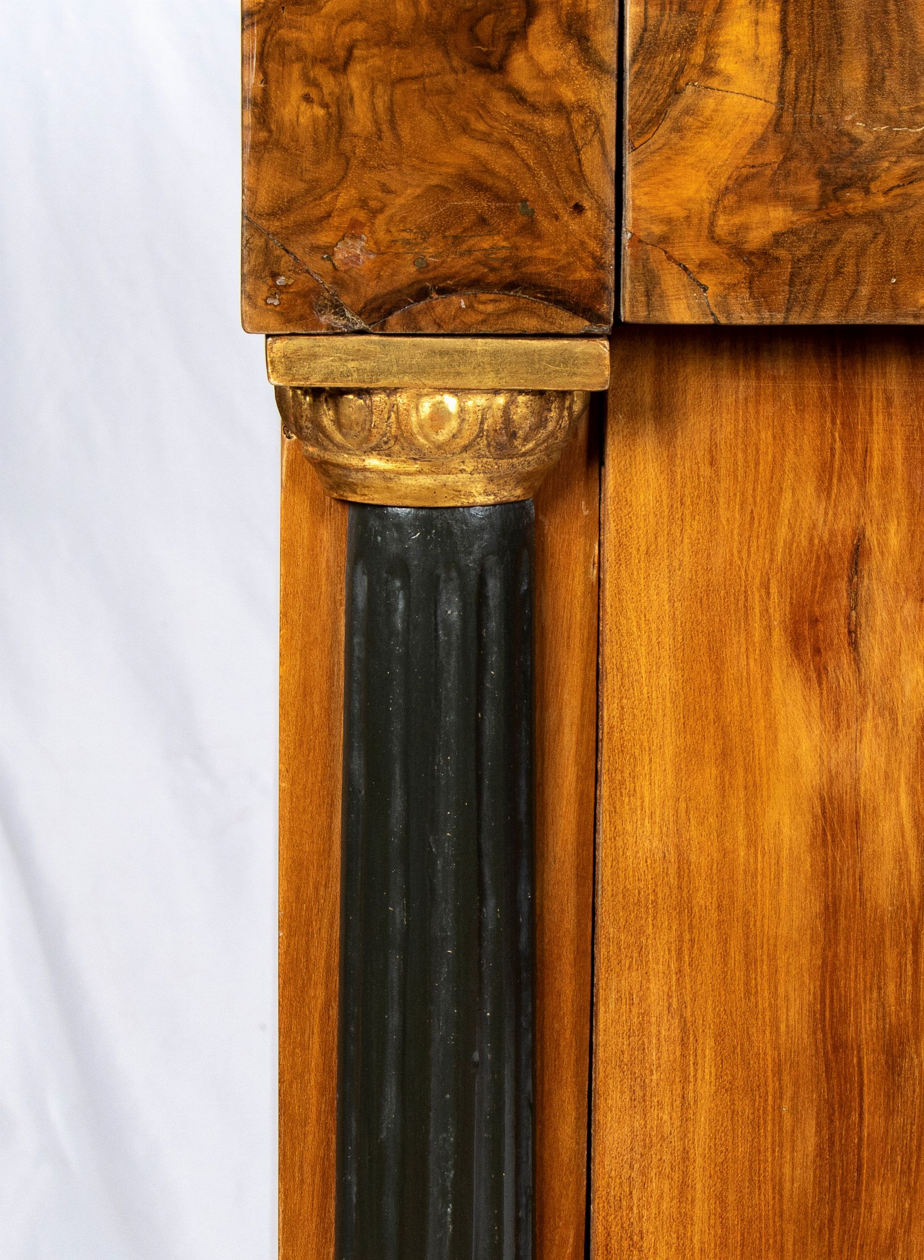 Altezza x larghezza x profondità 137 x 61 x 102 cm. Toscana, inizio XIX secolo lastronato in noce e radica di noce, fronte a tre cassetti con primo cassetto in radica di noce, montanti a colonna con capitelli dorati ed intagliati laccato nero. Piano laccato nero con cornice intagliata e dorata. Piedi a pigna con intaglio a foglia dorata. Maniglie e bocchette in bronzo dorato.