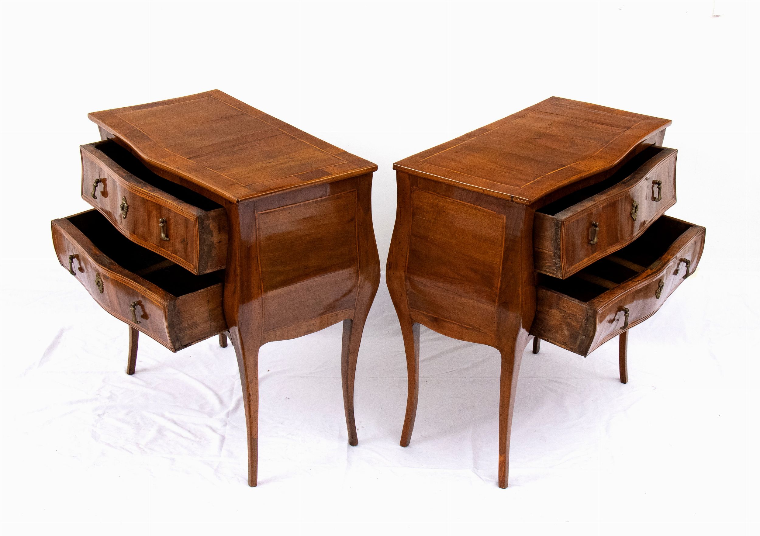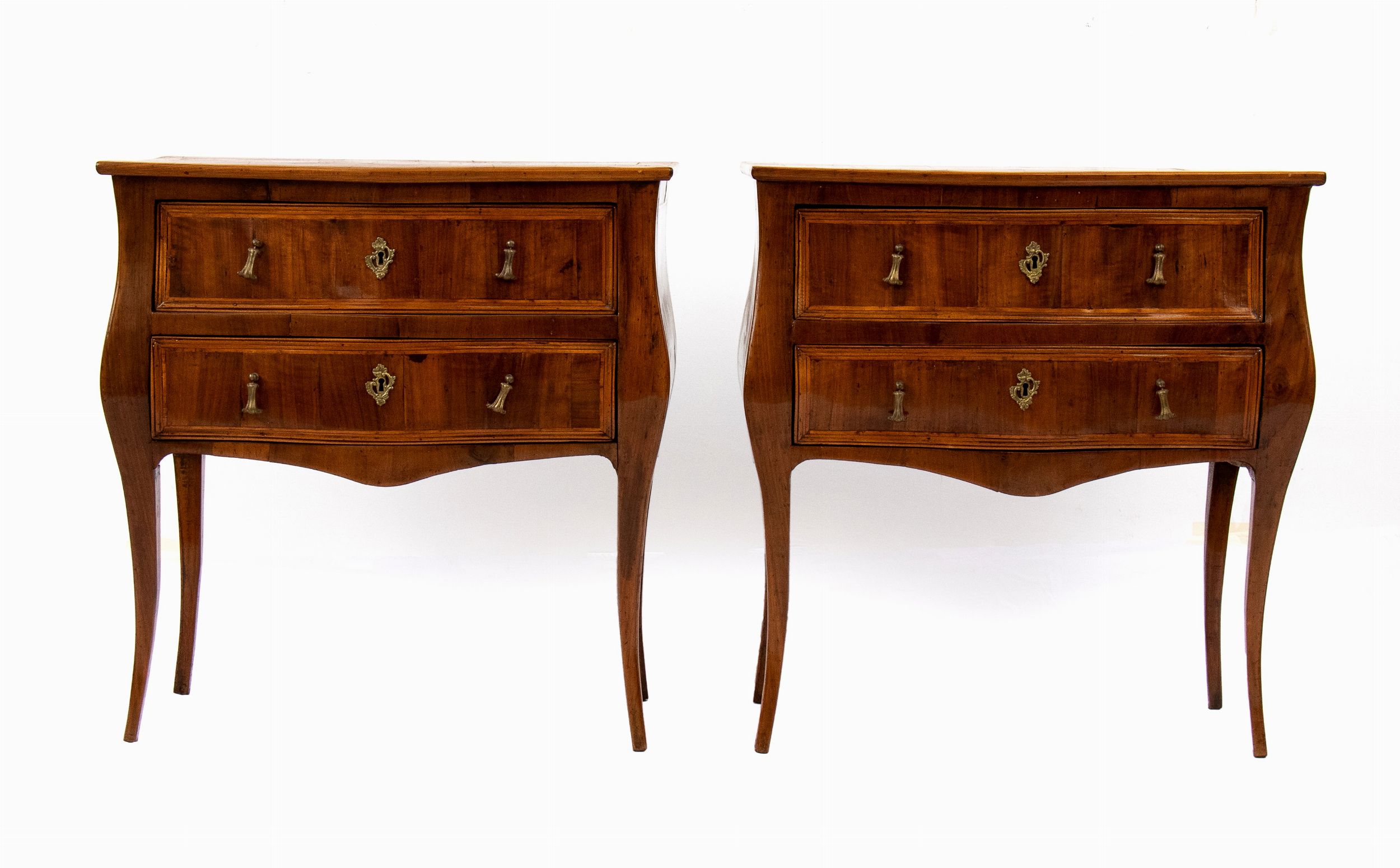 Italia centrale, XVIII secolo in legno di noce con intarsi in legni di frutto, a due cassetti con fronte e fianchi mossi e gambe cabriolet.