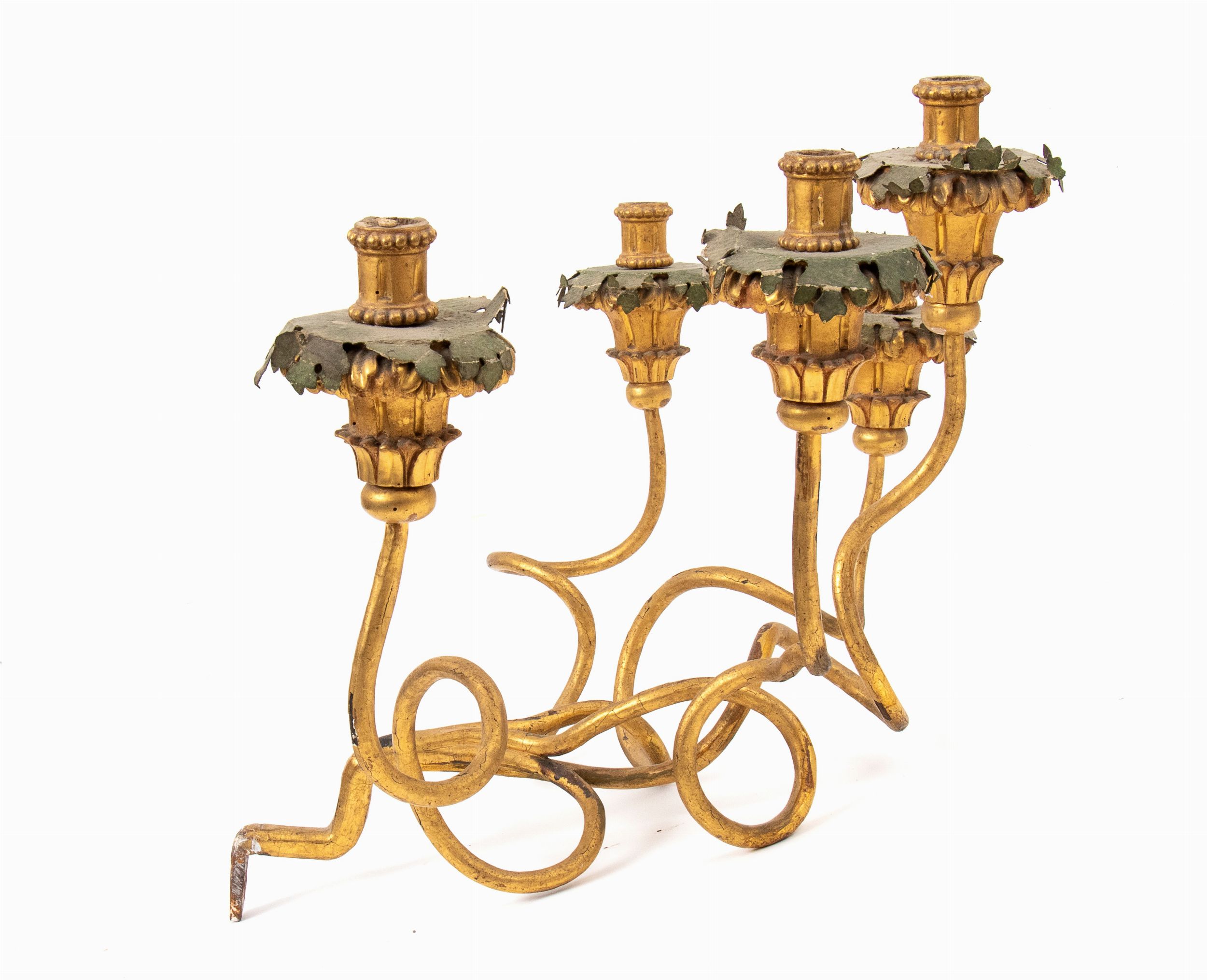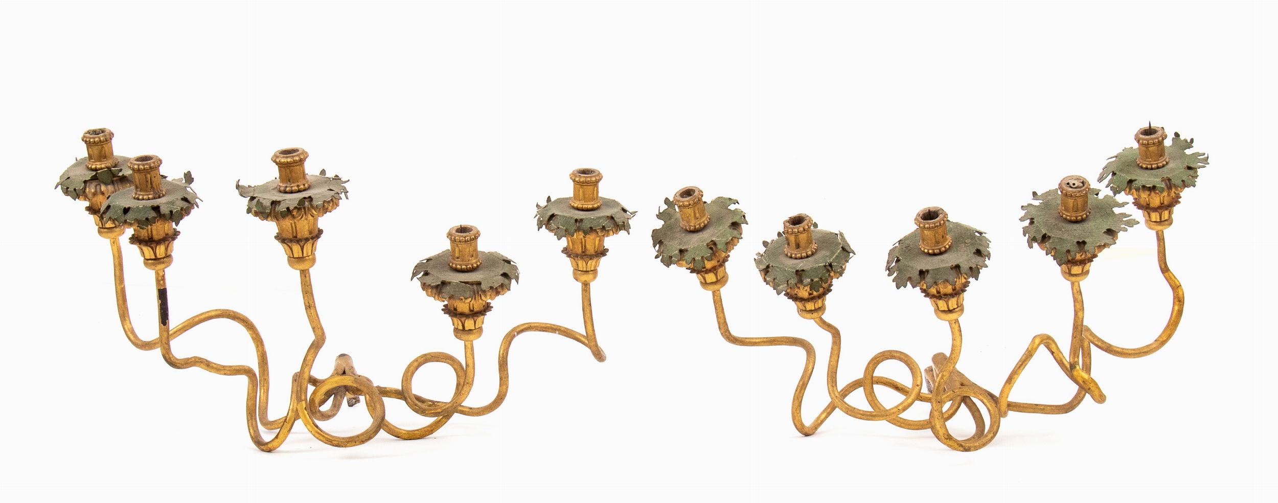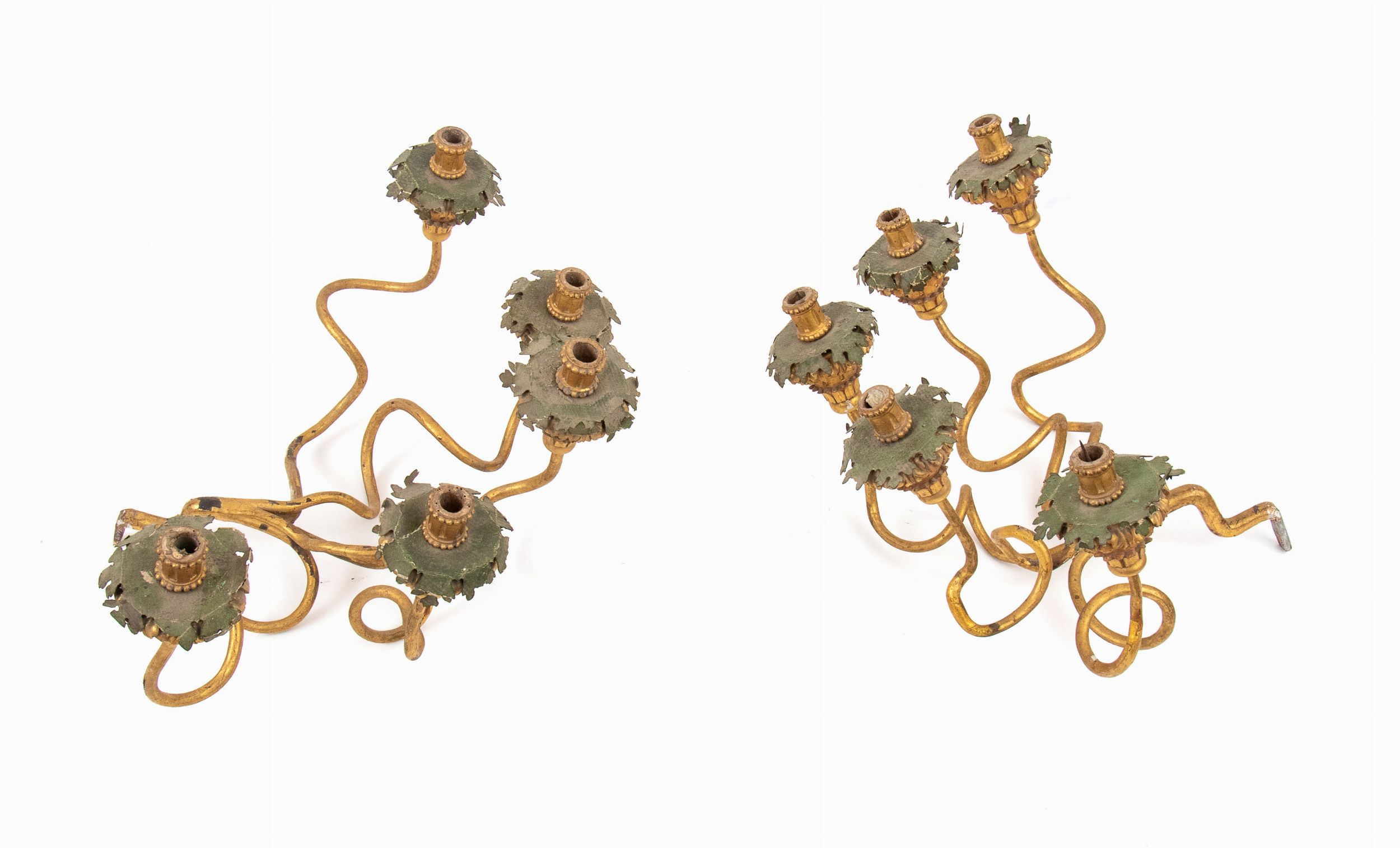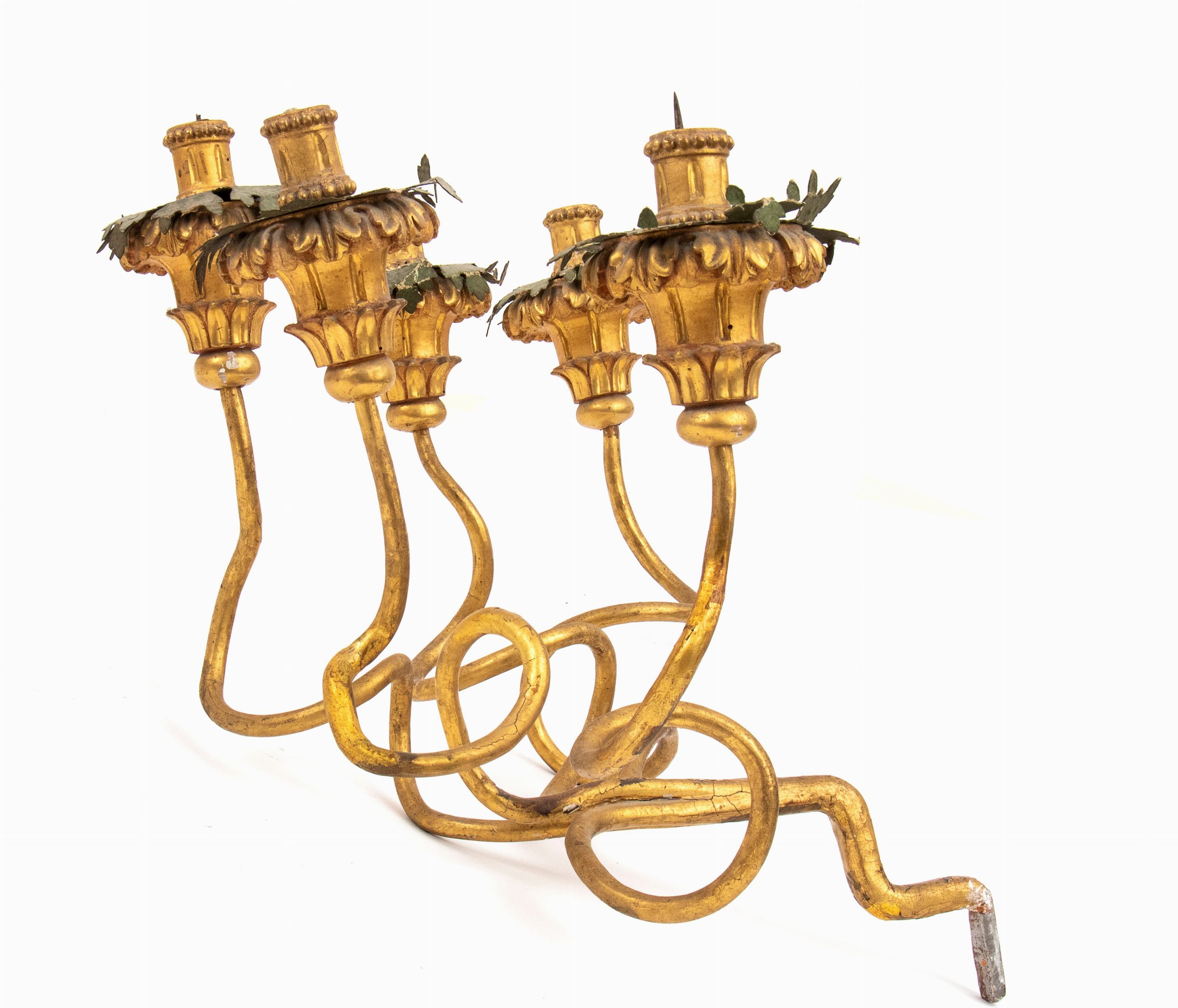 XVIII secolo composti da cinque braccia in ferro dorati e le cinque fiamme in legno intagliato e dorato.