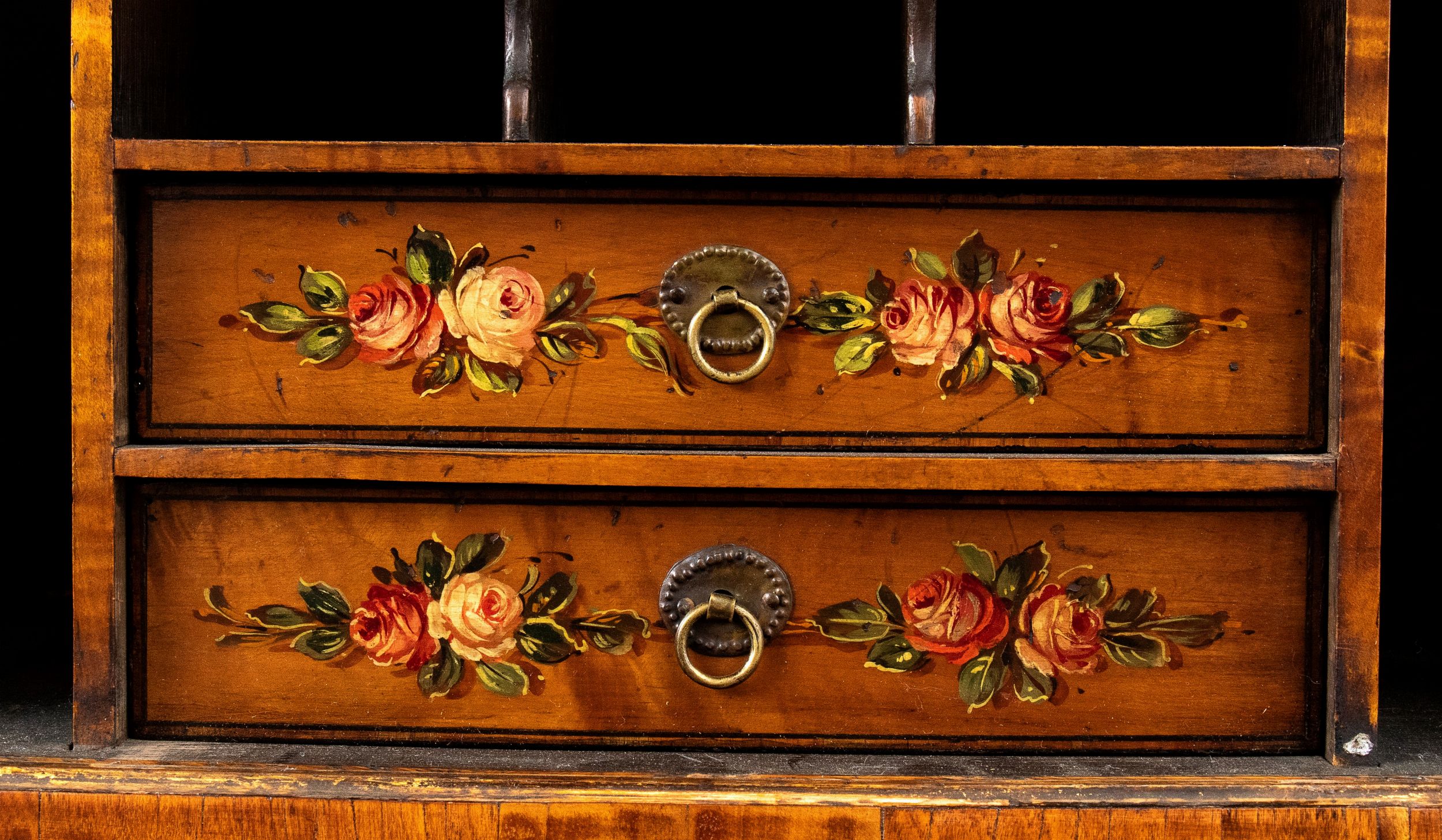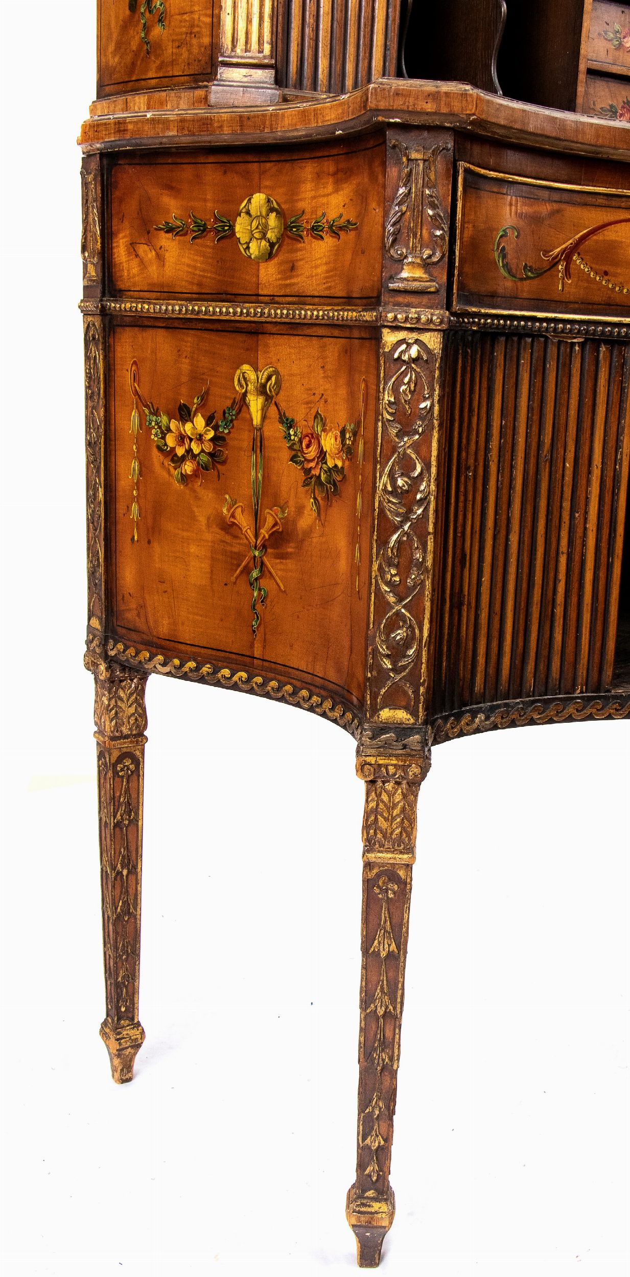 Altezza x larghezza x profondità : 119 x 106 x 46 cm XVIII secolo in legno di satinwood, a due corpi con cassetto sottopiano e apertura delle ante a scomparsa, finemente dipinto alla maniera dei fratelli Adams (Robert Adam (1728–1792) e James Adam (1732–1794), con figure di putti, fiori e richiami neoclassici. Parti intagliate e dorate ad oro zecchino.