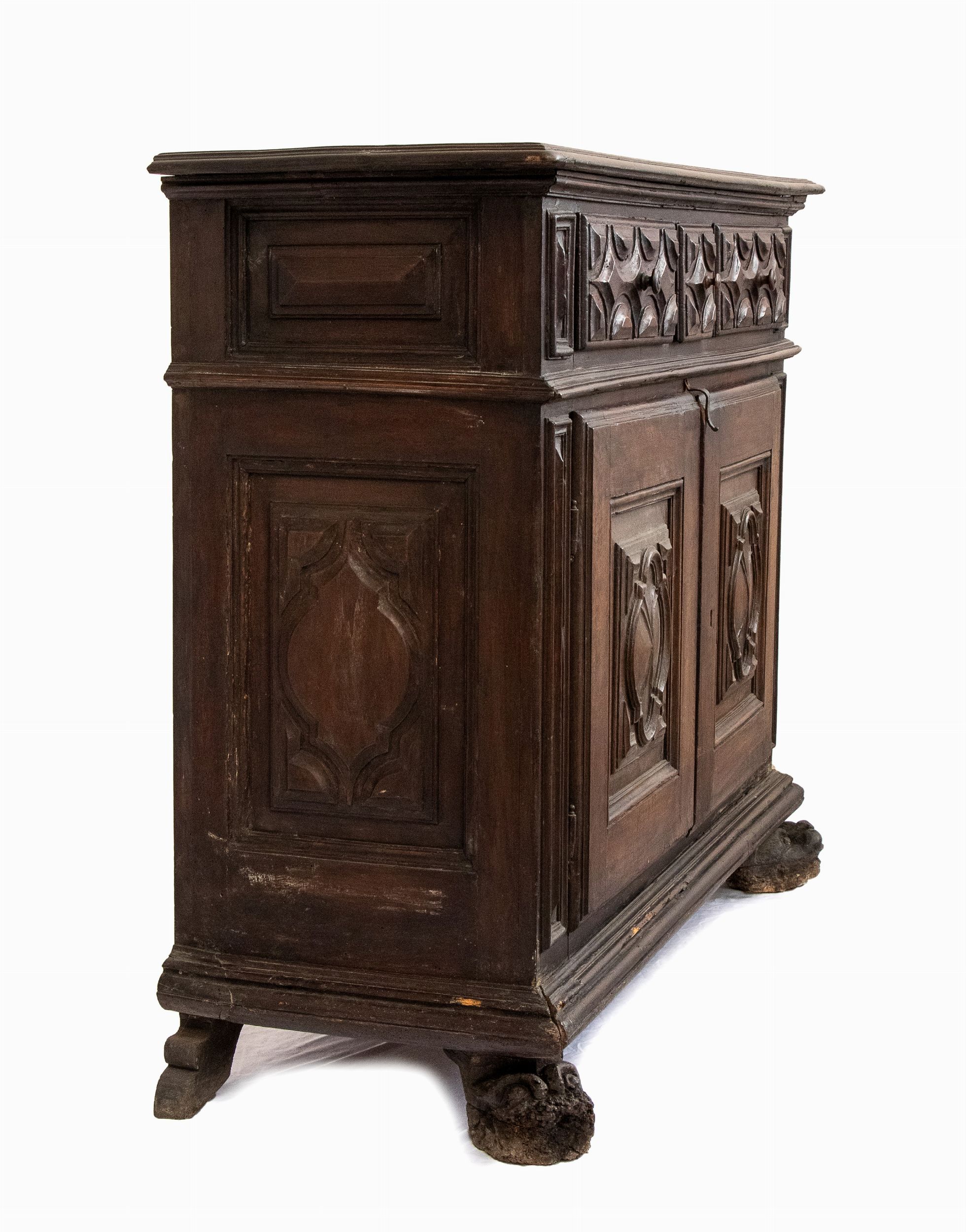 Liguria, XVII secolo in legno di noce con intagli geometrici, sul fronte cassetti, sportelli e fianchi; piedi a forma di drago