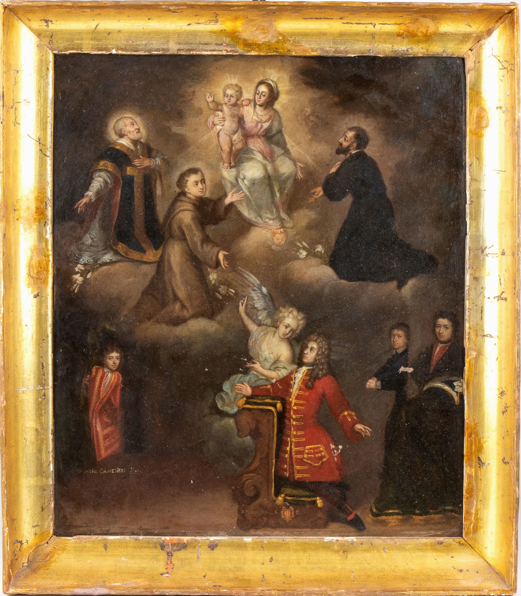 XVII secolo L'opera, in rame dipinto e incorniciato in legno dorato, raffigura un ex-voto, la richiesta da parte del committente di aiuto a Gesù Bambino e la Vergine. Il committente è raffigurato inginocchiato su un inginocchiatoio al centro e indossa eleganti abiti del tempo. Egli si rivolge a Gesù Bambino e la Vergine che compaiono nella parte alta di questo gran teatrino (terminologia che nasce dalla grande struttura architettonica che si trova nella parte superiore del palcoscenico e aveva funzione acustica e delimitava lo spazio, incorniciando il palcoscenico e separandolo dalla platea), esattamente al centro. Intorno, numerosi santi compaiono in aiuto del committente e anch'essi, su un livello inferiore rispetto a Maria è Gesù, si rivolgono a loro amplificando la richiesta di aiuto o di ringraziamento. Al verso una scritta non identificata. Gli ex-voto sono manufatti artigianali che rappresentano testimonianze di devozione e religiosità legati spesso a eventi miracolosi o richieste di miracolo, spesso collocabili tra storia e leggenda. I temi rappresentati sono solitamente Madonne, Santi o categorie di voti come guarigioni, incidenti e calamità naturali e i loro committenti spaziano tra le classi sociali.