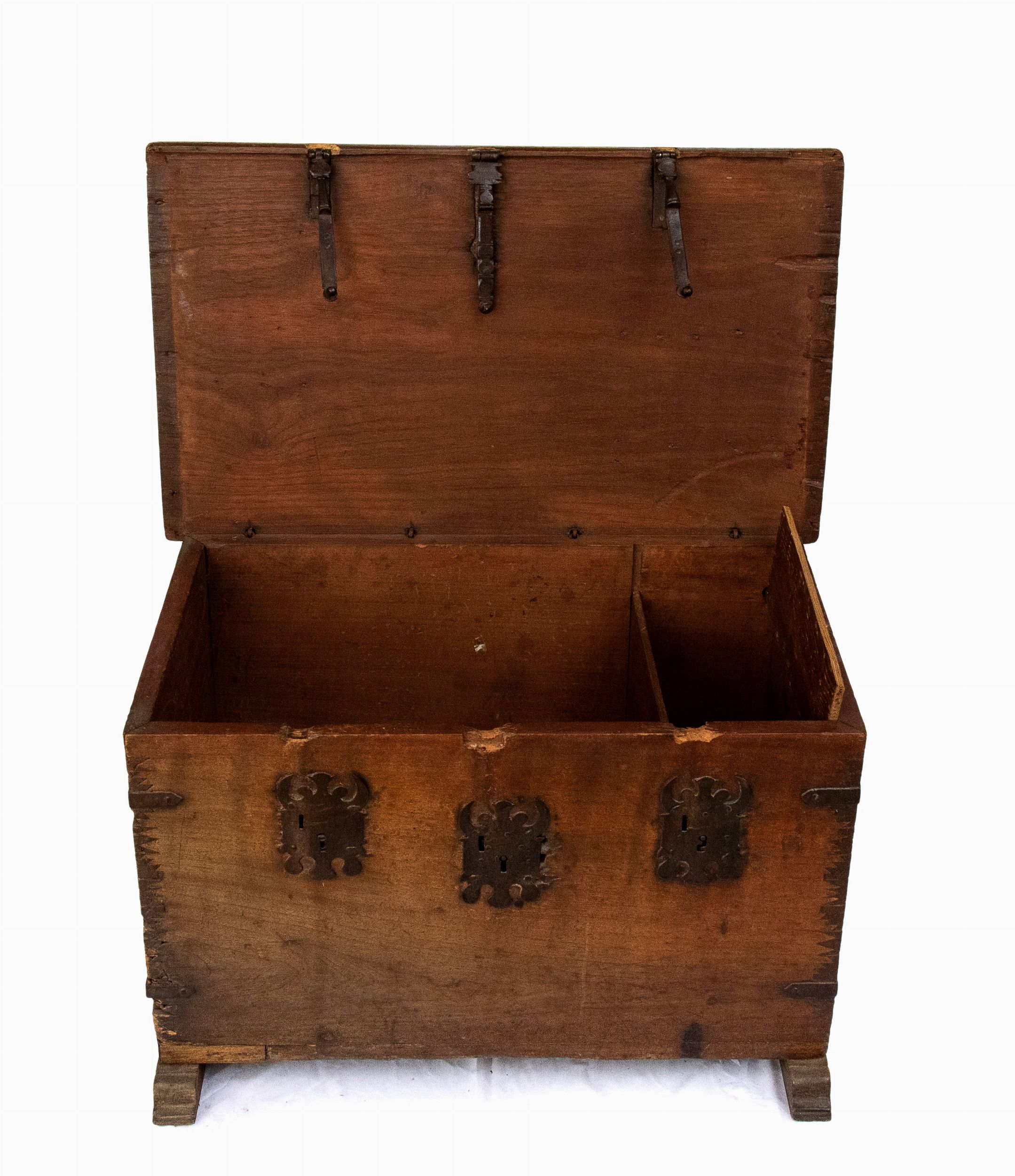 XVIII secolo in legno di noce, con rinforzi in ferro laterali e chiusura a tre serrature.