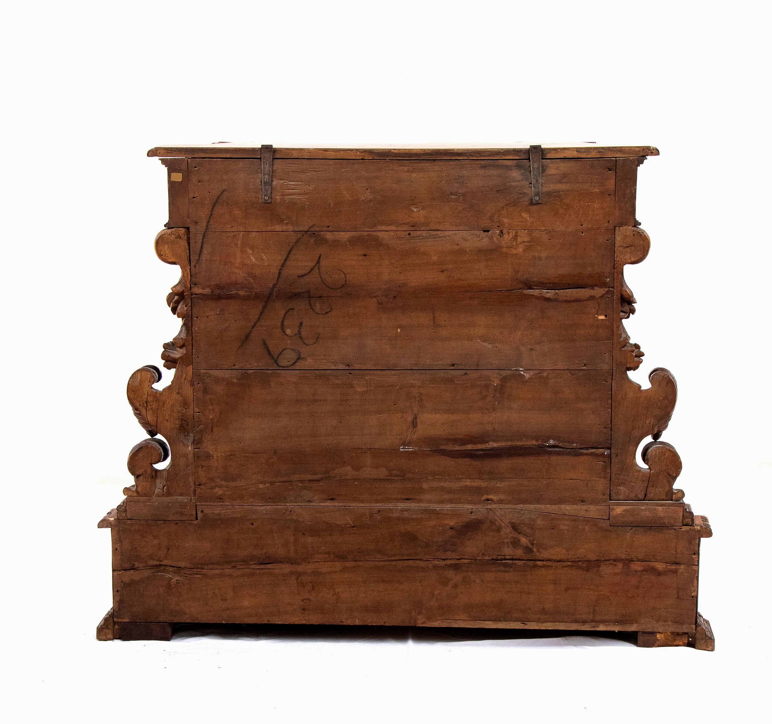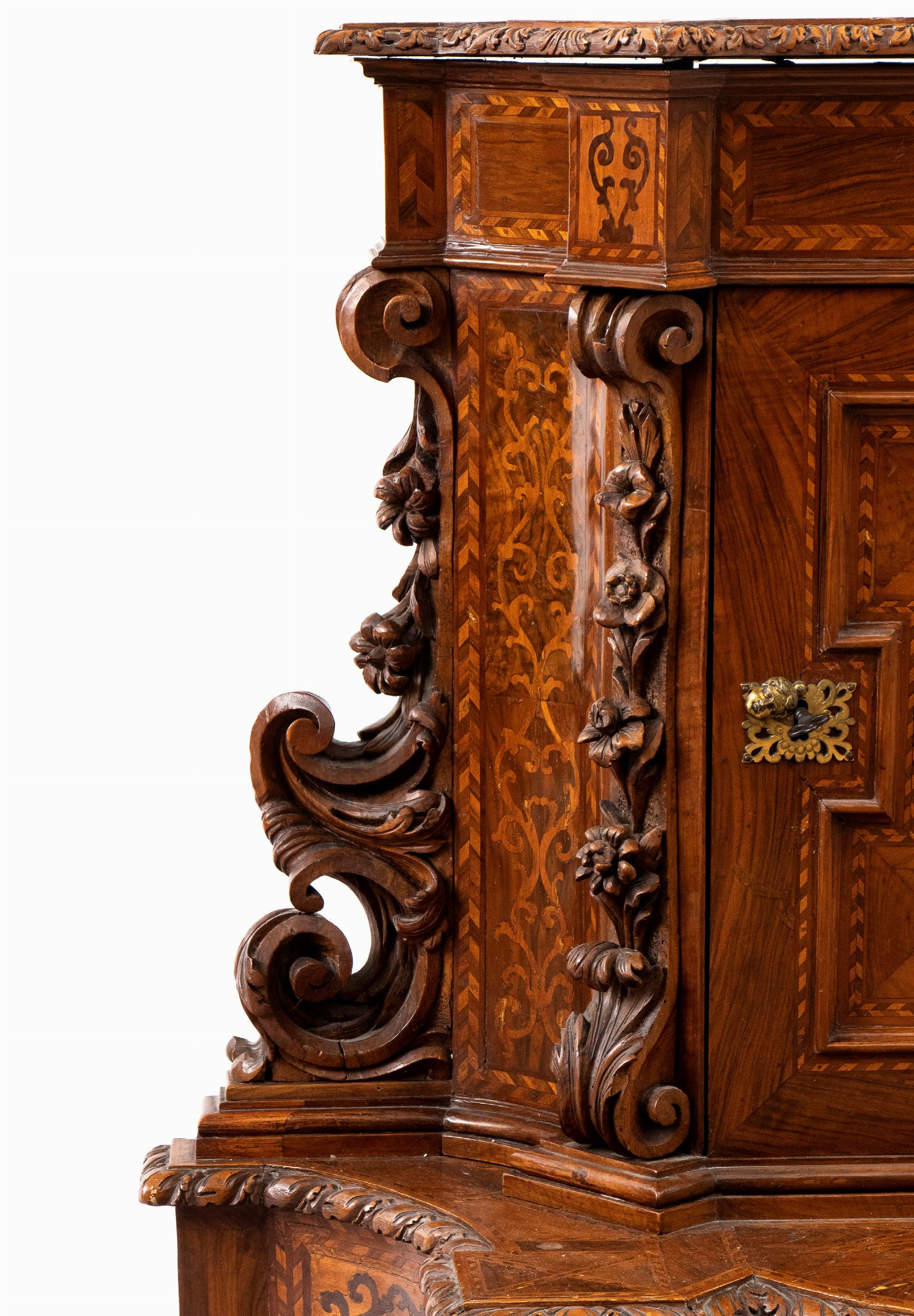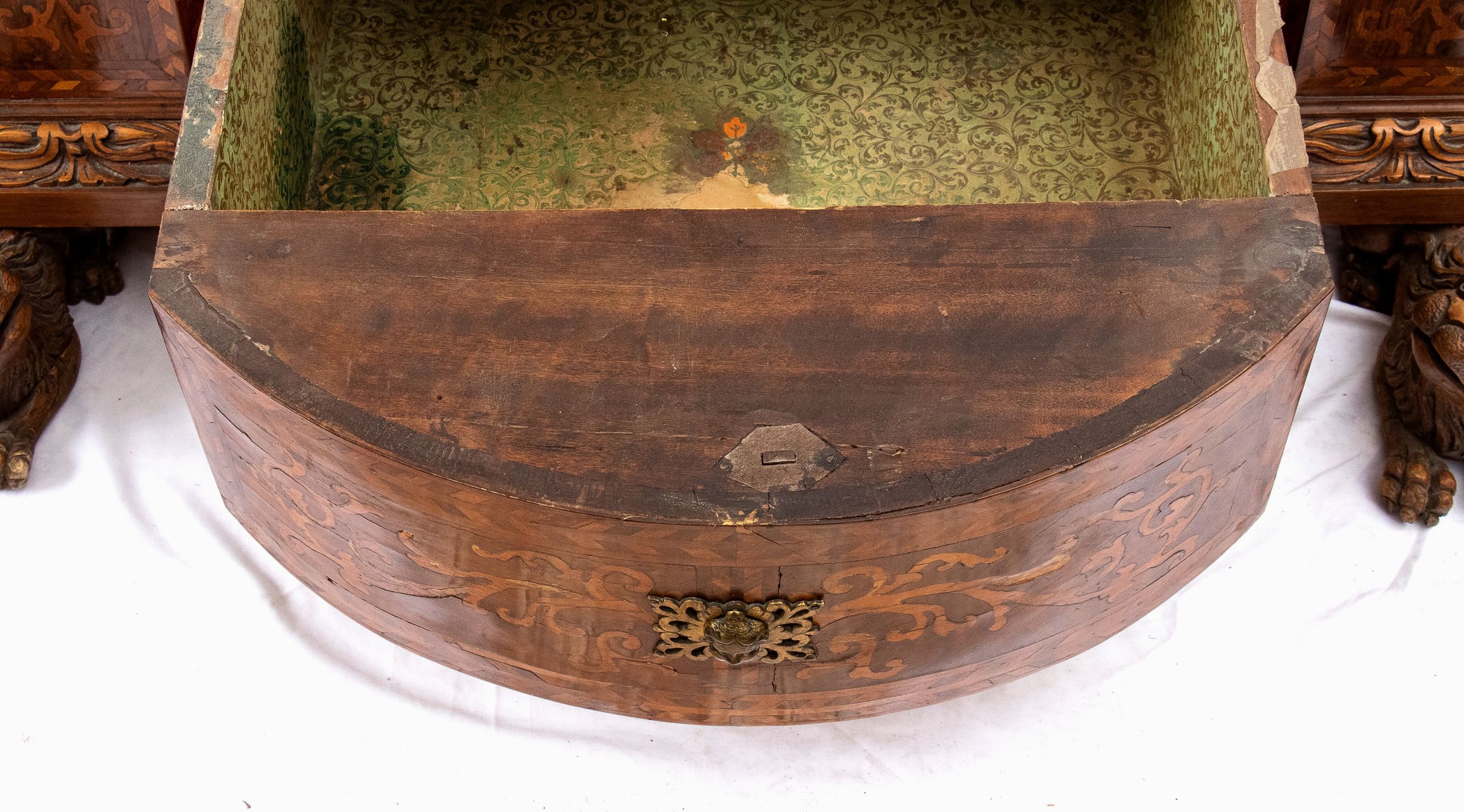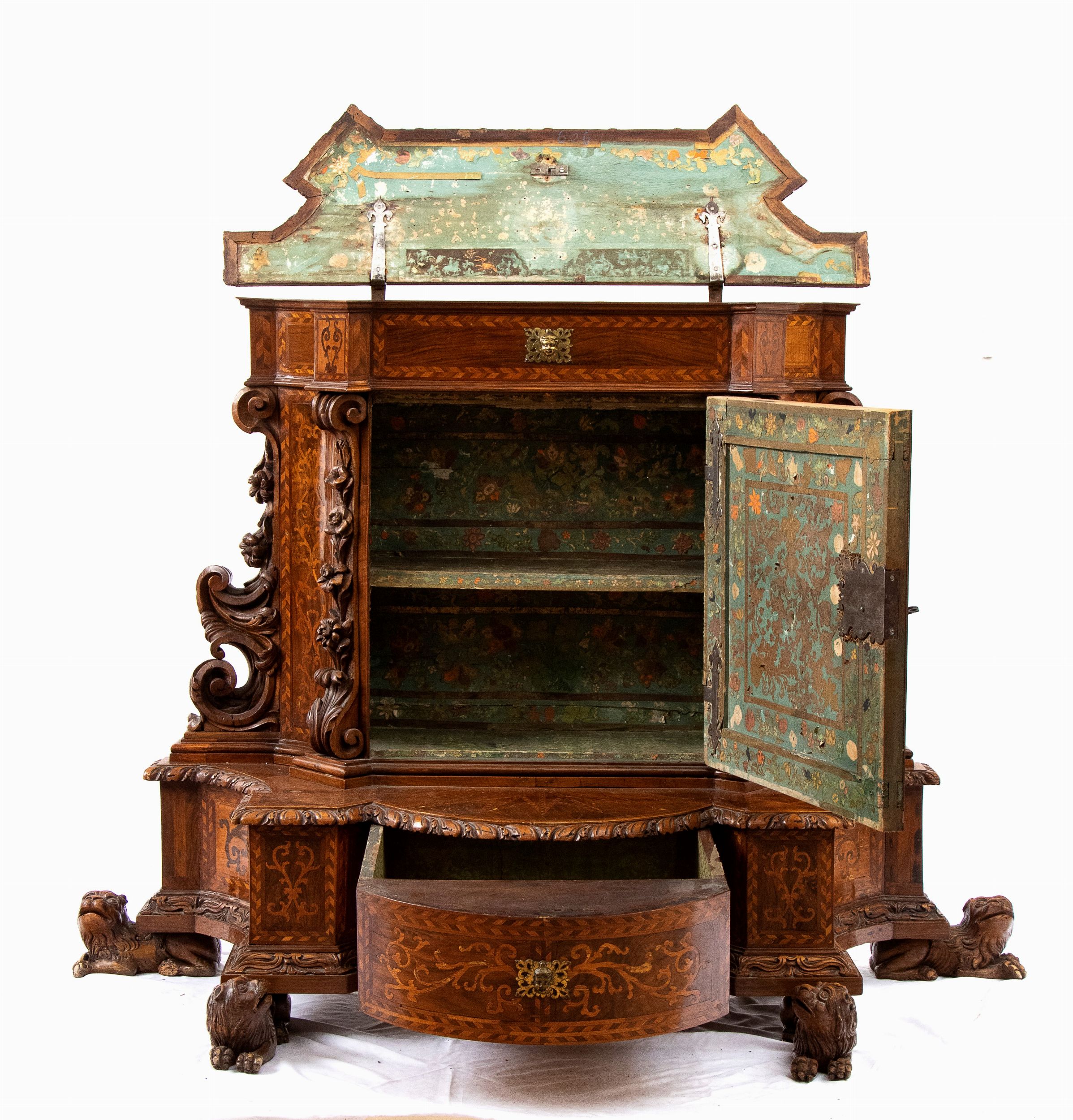 XVIII secolo Italia settentrionale, finemente intarsiato in legno di frutto a motivi geometrici; la base sorretta da quattro leoni intagliati, ferramenta e chiavi coevi.