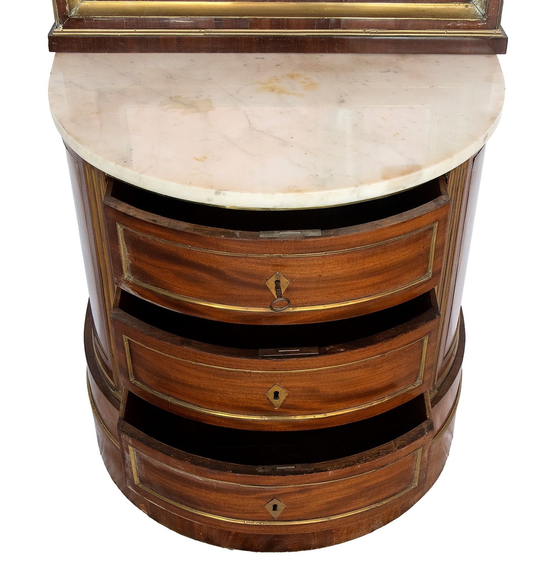 Altezza x larghezza x profondità : 265 x 77 x 55 cm. Russia, inizio XIX secolo in piuma di mogano a forma di mezzaluna, a tre cassetti con specchiera superiore. Piano in marmo bianco di Carrara, bronzi dorati lungo i bordi dei cassetti e sul bordo del piano.