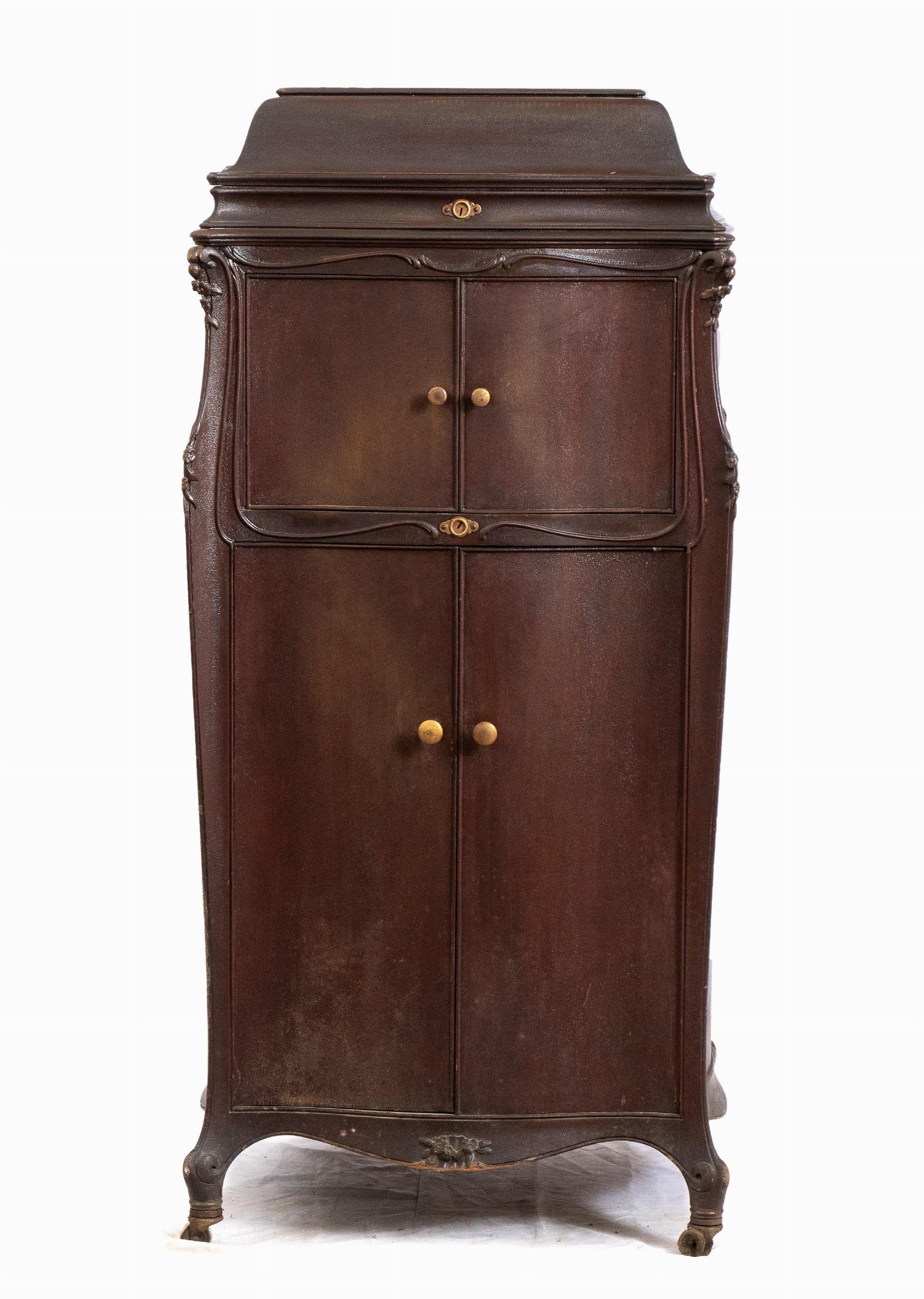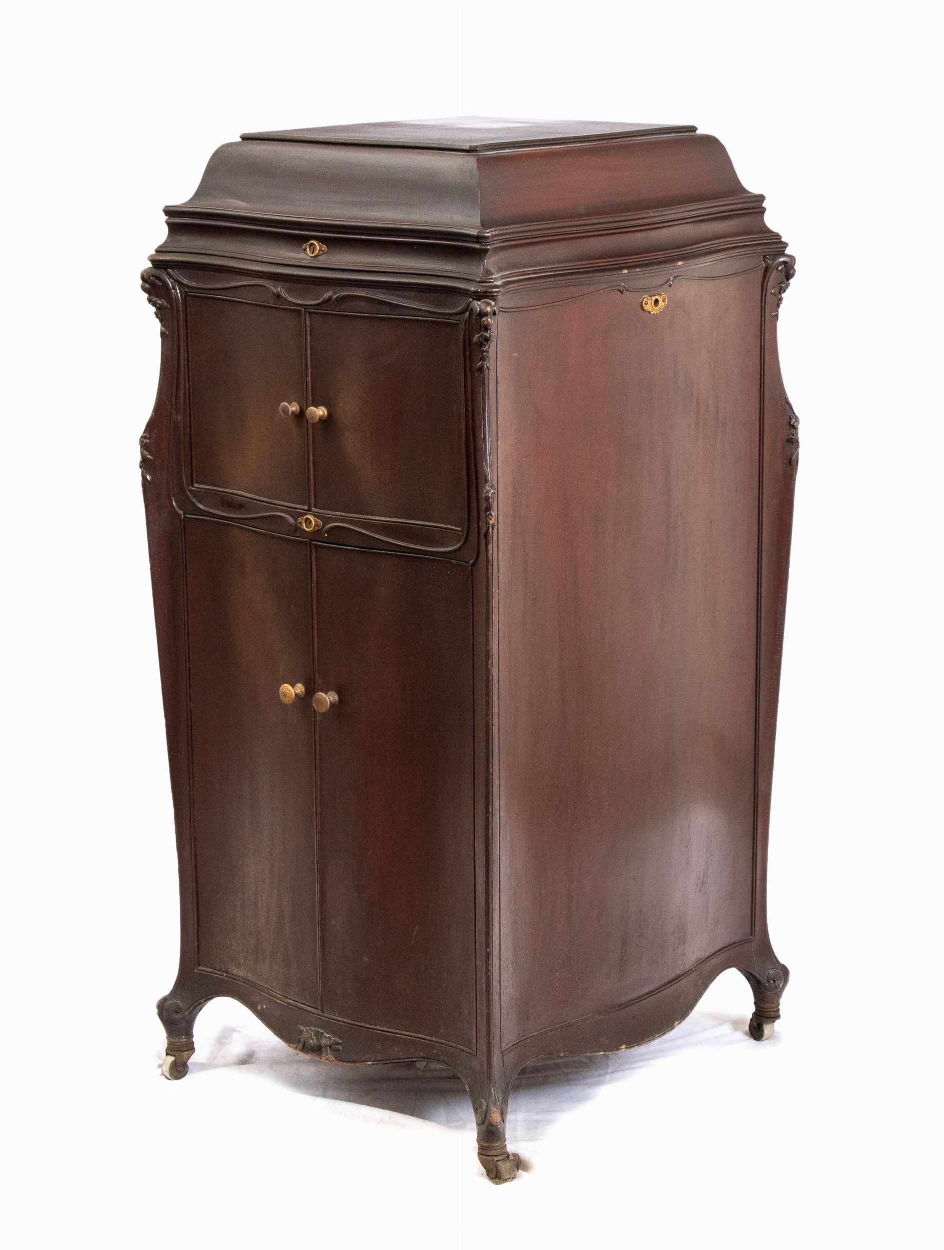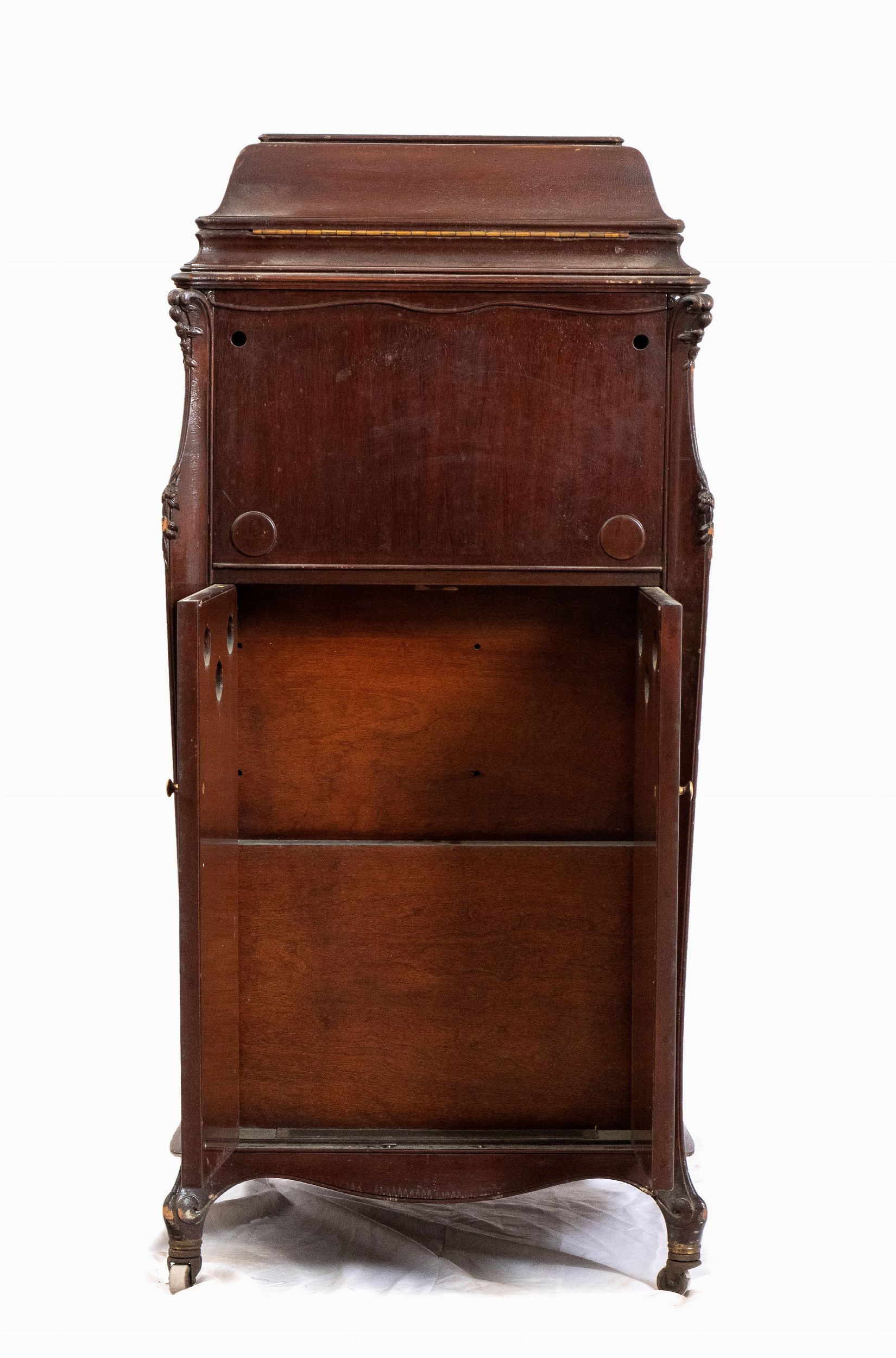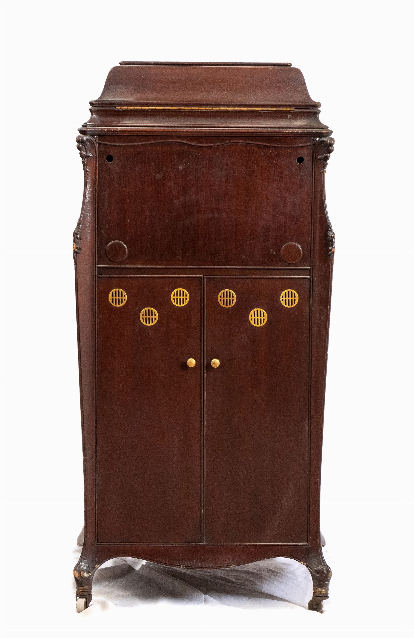 Italia, XX secolo mobile portadischi in legno di mogano con aperture per l'amplificazione del volume.