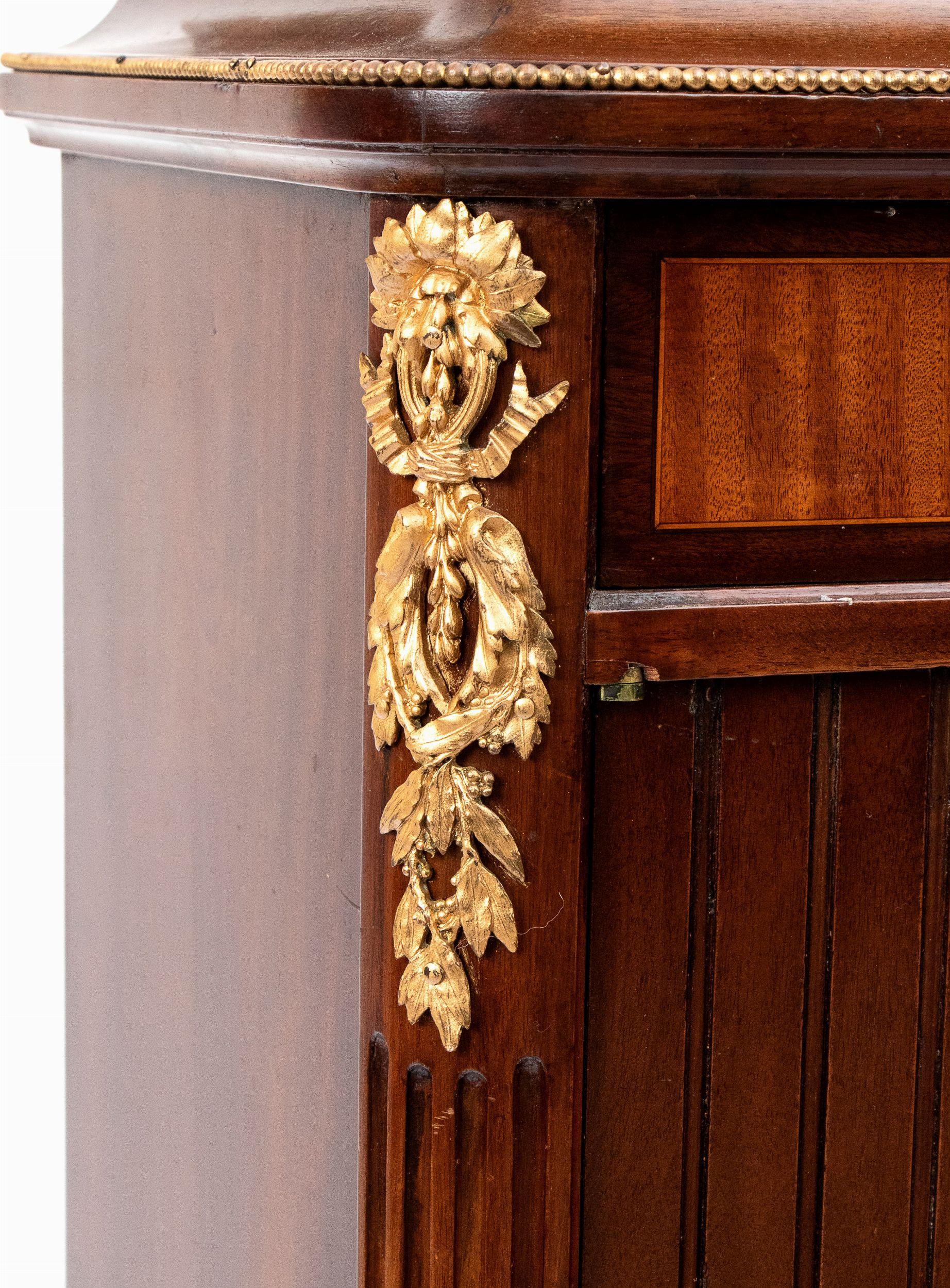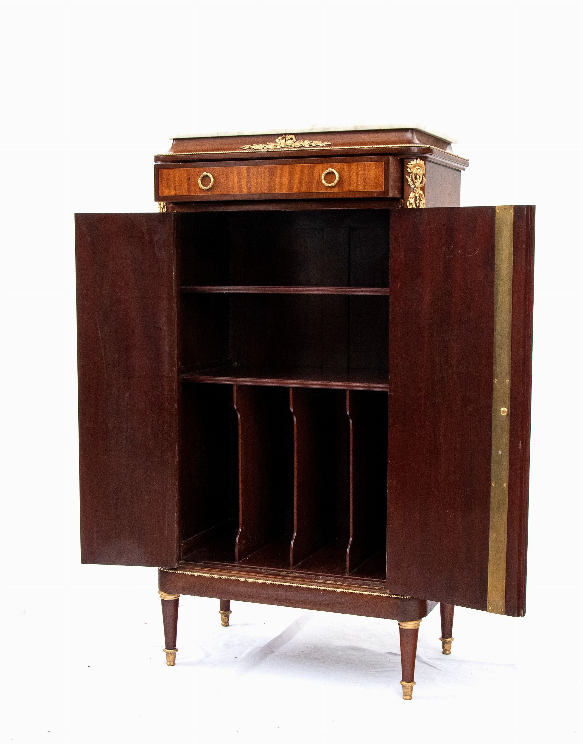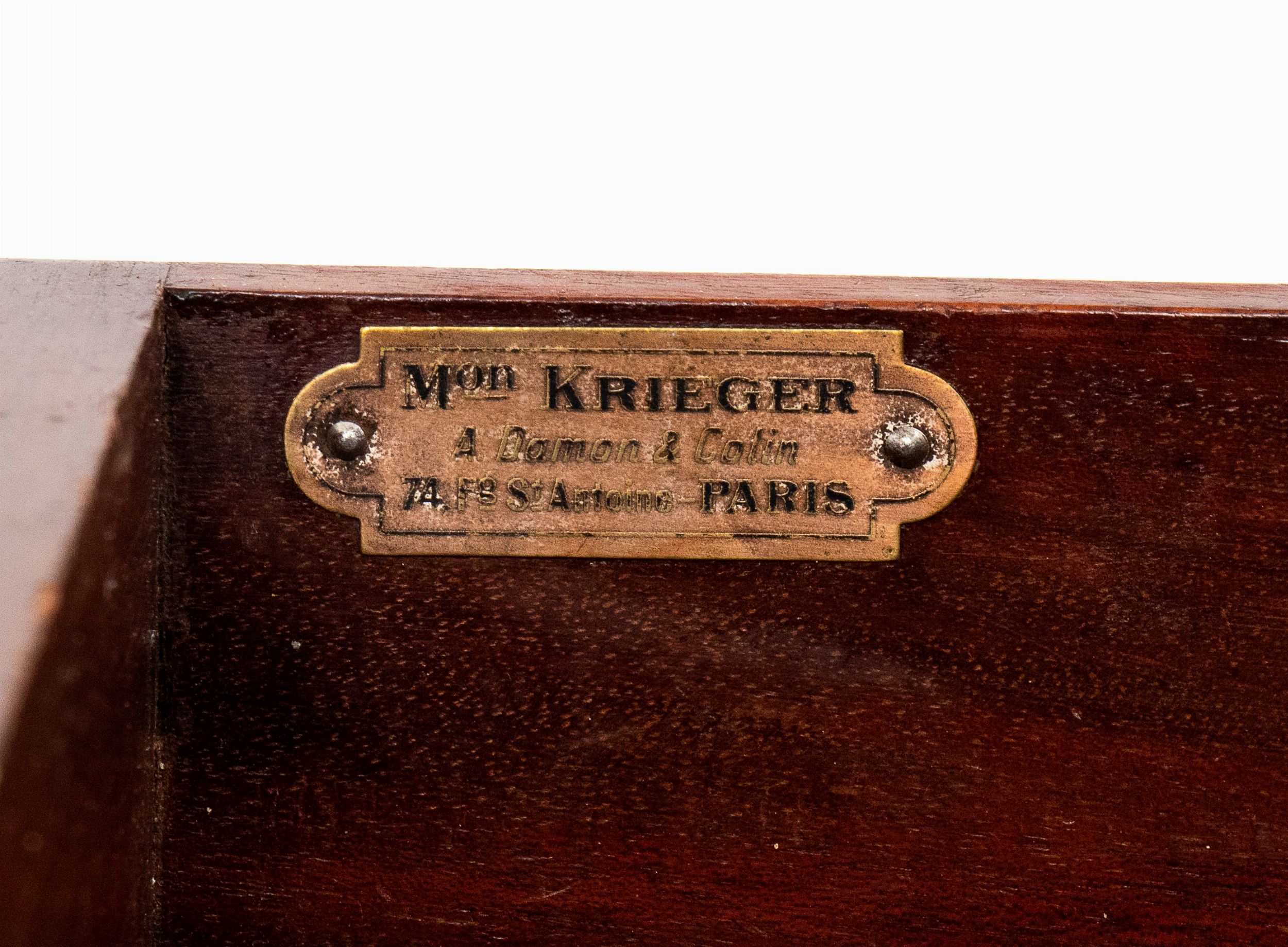 Altezza x larghezza x profondità 115x60x37 cm XIX secolo interamente impiallacciato in mogano con applicazioni in bronzo dorato; fronte a due ante con cassetto sottopiano, piano in marmo rimovibile a celare un vano segreto. Firmate M.on KRIEGER, A. Damon & Colin.
