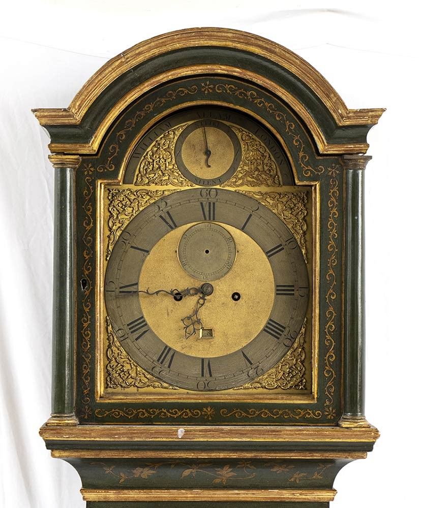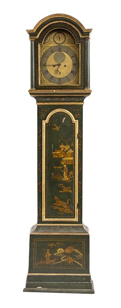 Altezza x larghezza x profondità : 210 x 50 x 27 cm. Londra, XVIII secolo laccato verde a chinoserie, quadrante circolare dorato con numeri arabi e romani, datario e secondi. Movimento con regolatore a pendolo e suoneria delle ore e delle mezze su campana firmato William Allam London.
