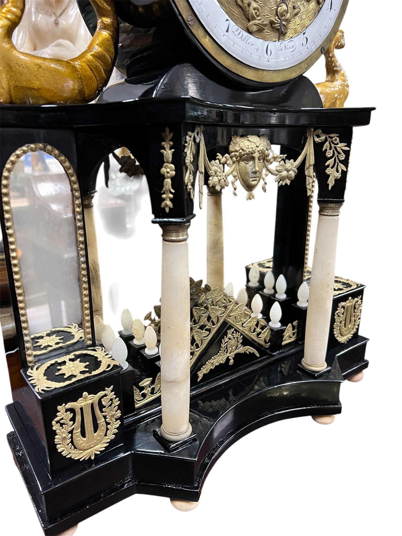 1820 circa movimento a molla, suoneria viennese a 4/4 ore su bobine di suoneria, automa a quadrante mobile “Fabbro e arrotino”, interruttore di spegnimento della suoneria, funzione di ripetizione, anello del quadrante smaltato, l cassa architettonica in legno policromo, tre pannelli a specchio, colonne e piedi in alabastro, terminali intagliati dipinti in oro, lambrequins, applicazioni figurative in ottone.