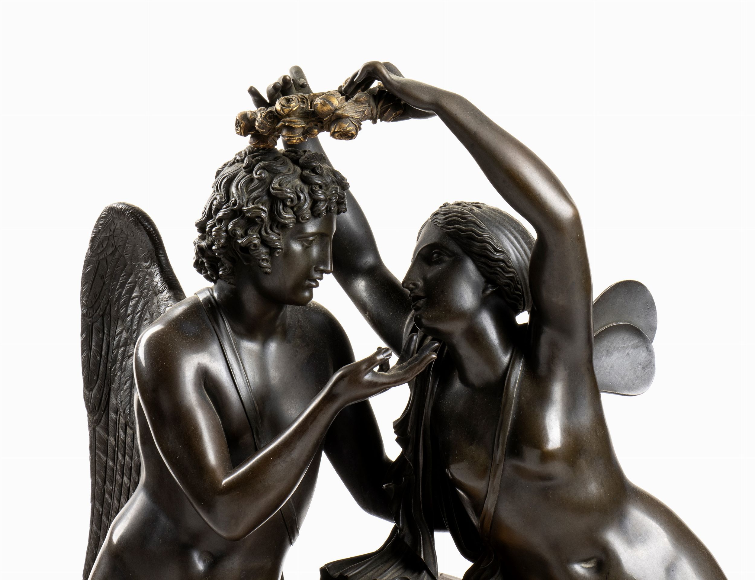 Fine XVIII, inizio XIX secolo cassa con basamento in marmo giallo di Siena e bronzo dorato, sormontata dalla figura Psiche nell'atto di incoronare Amore in bronzo patinato, iconografia ripresa sul modello di Claude Michallon (1751-1799); quadrante circolare con numeri romani firmato 'Ledure Bronzier Hémon', movimento con sospensione a filo, regolatore a pendolo e suoneria delle ore e delle mezze su campana. Laude Hémone e Pierre Victore Ledure, furono attivi entrambi a Parigi tra la fine del XVIII secolo e la prima metà del XIX secolo.