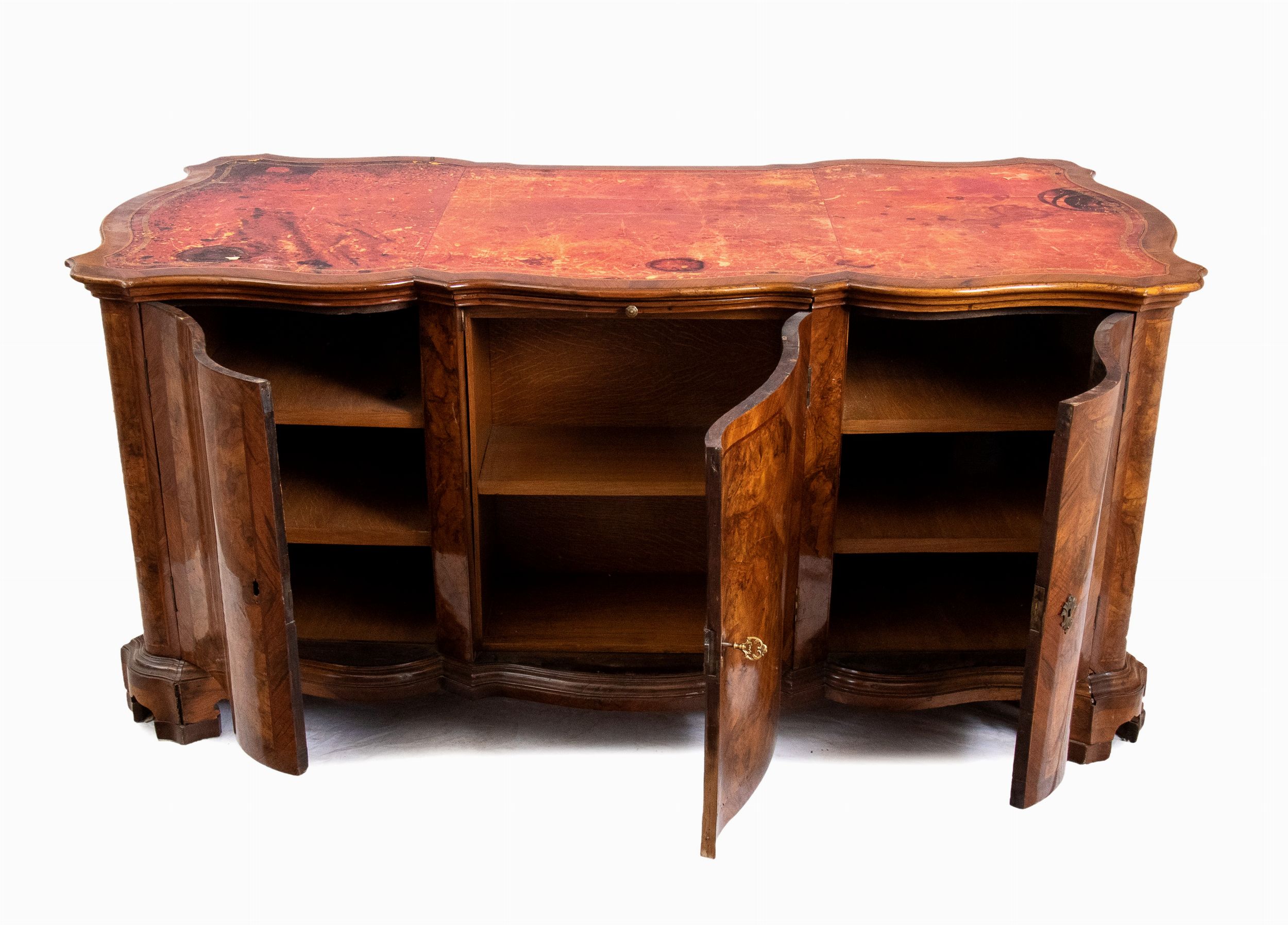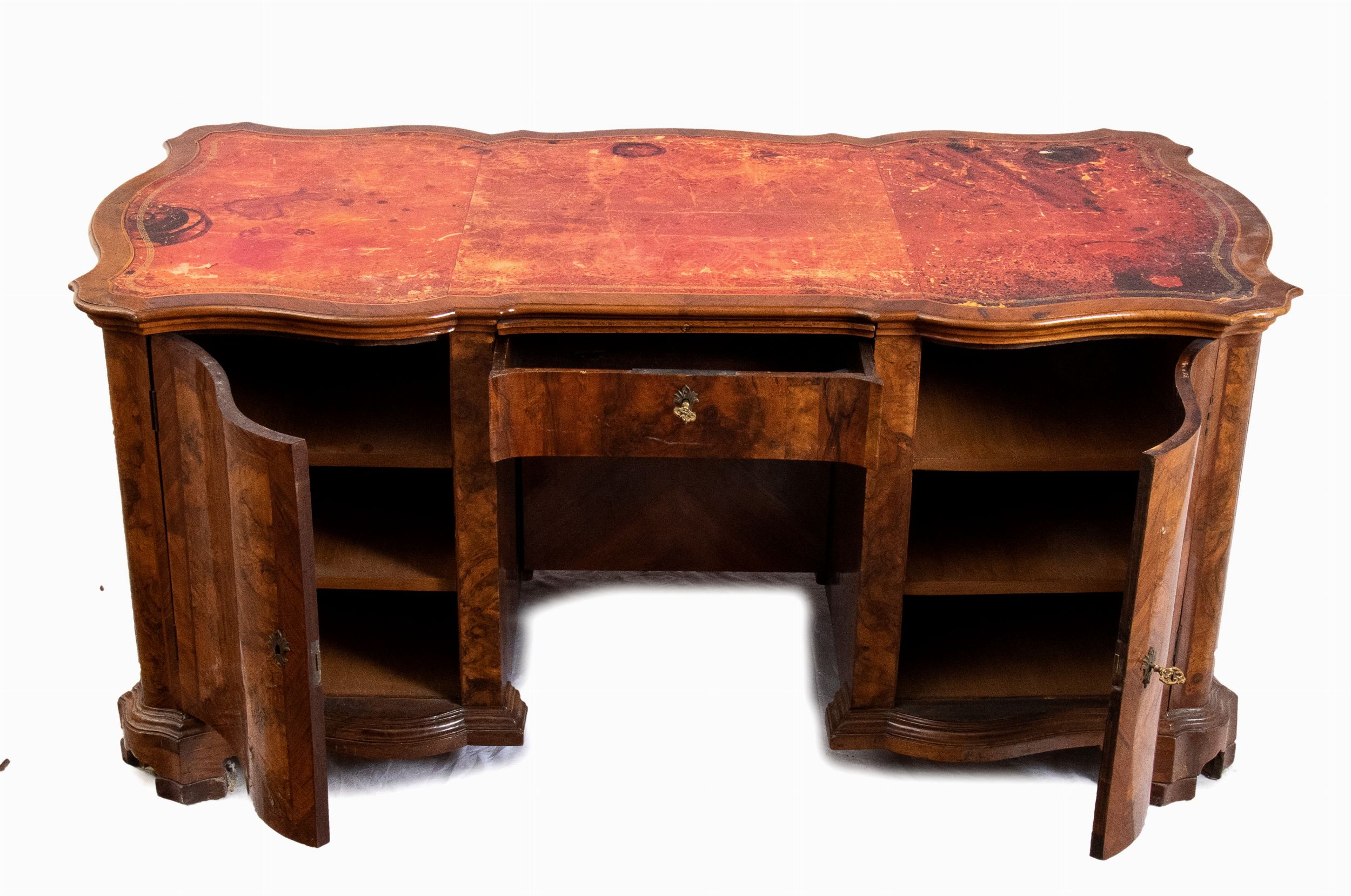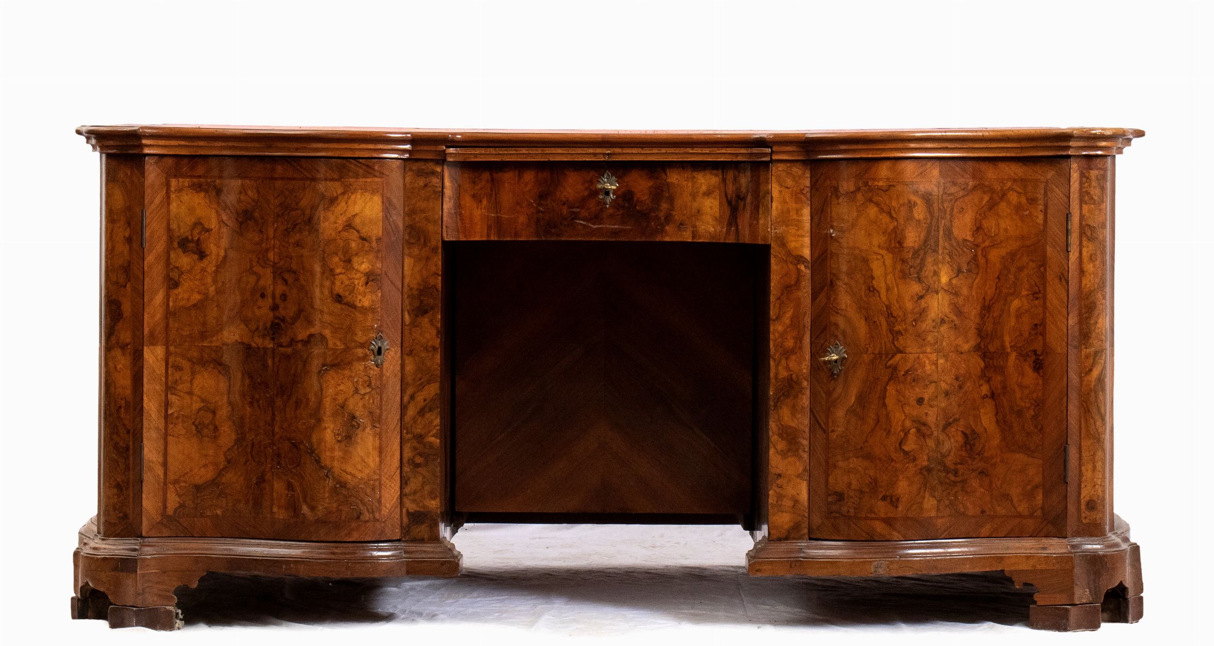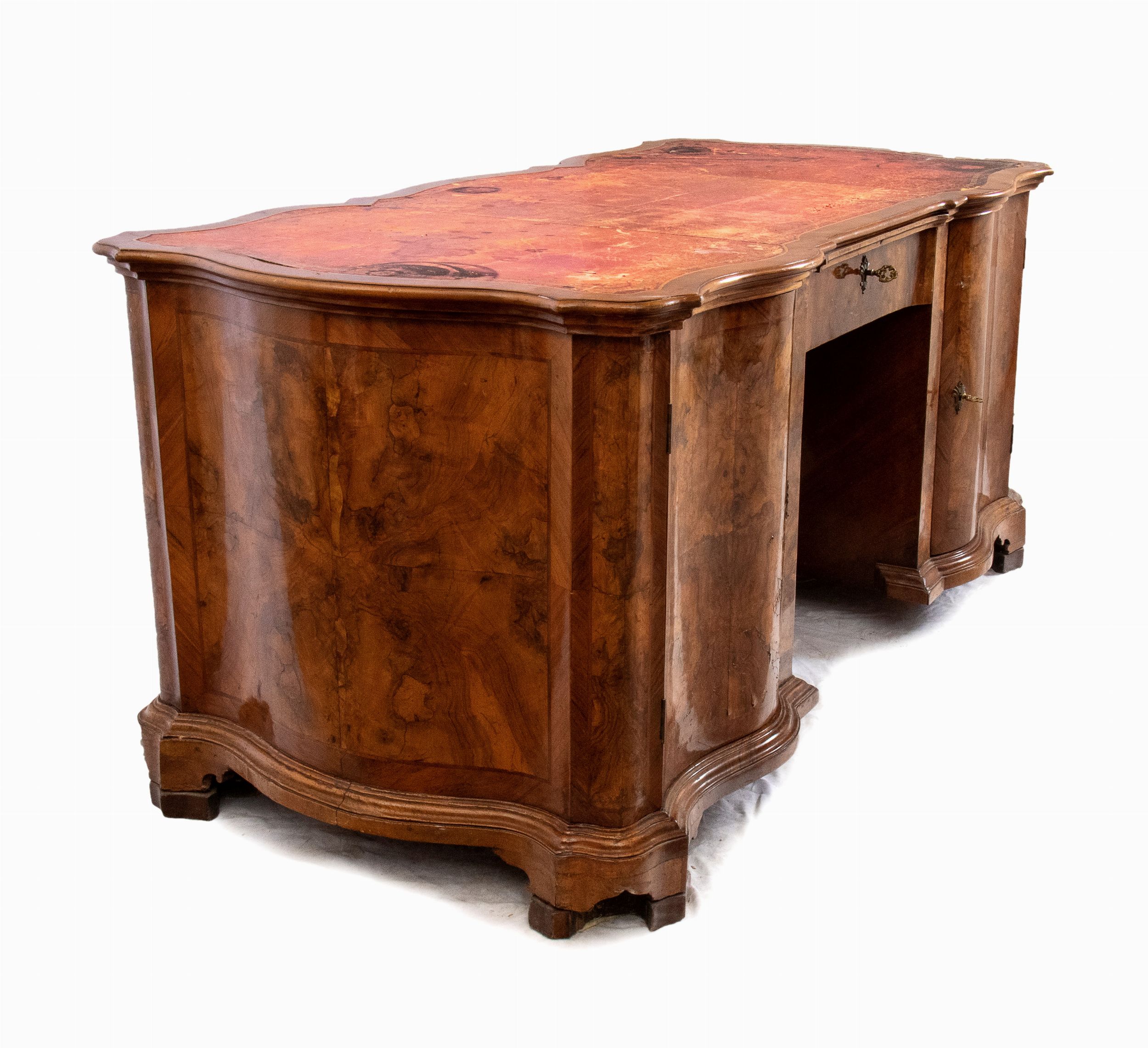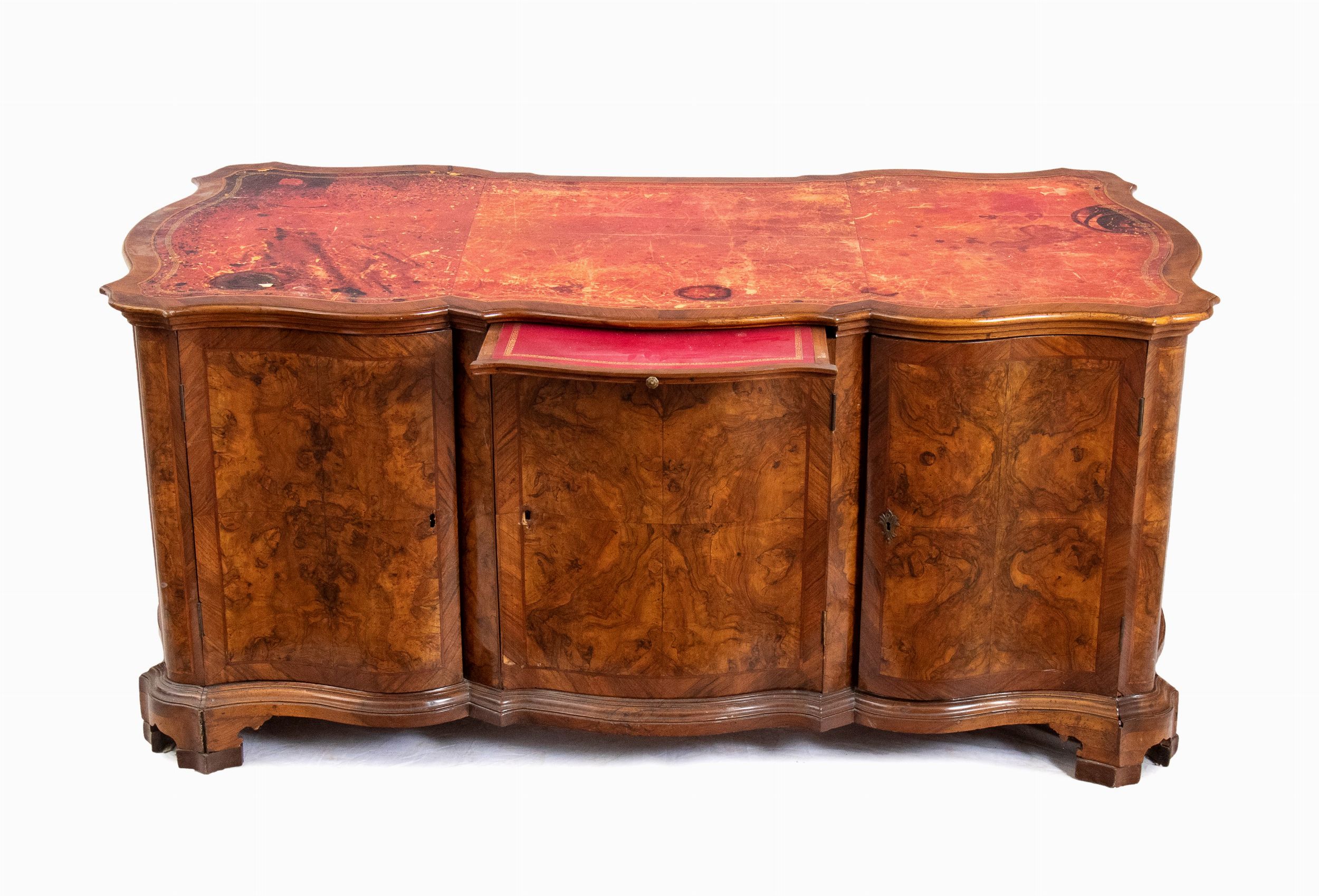 Verona, XVIII secolo di linea mossa interamente lastronata in radica di noce, piano in pelle con tiretto estraibile centrale.