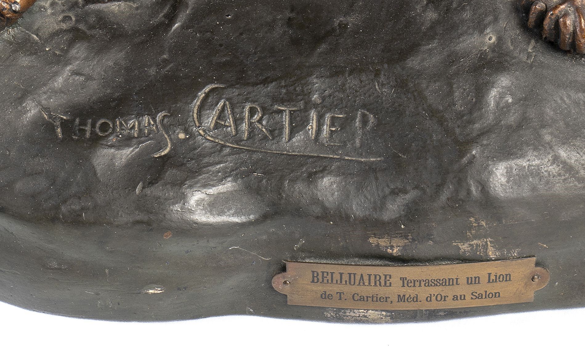 XX secolo intitolata 'Belluaire terrassant un lion', in bronzo patinato. Firmata Thomas Cartier.