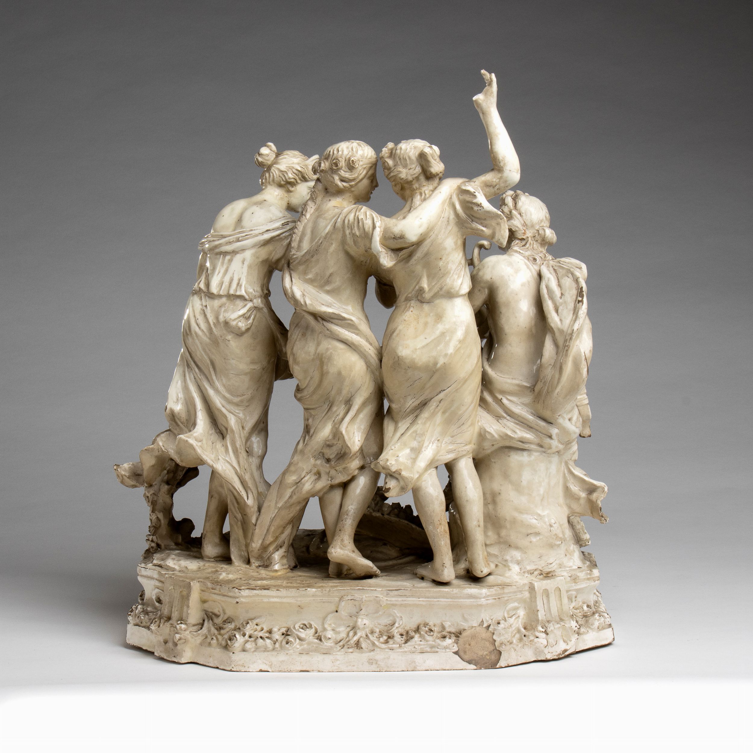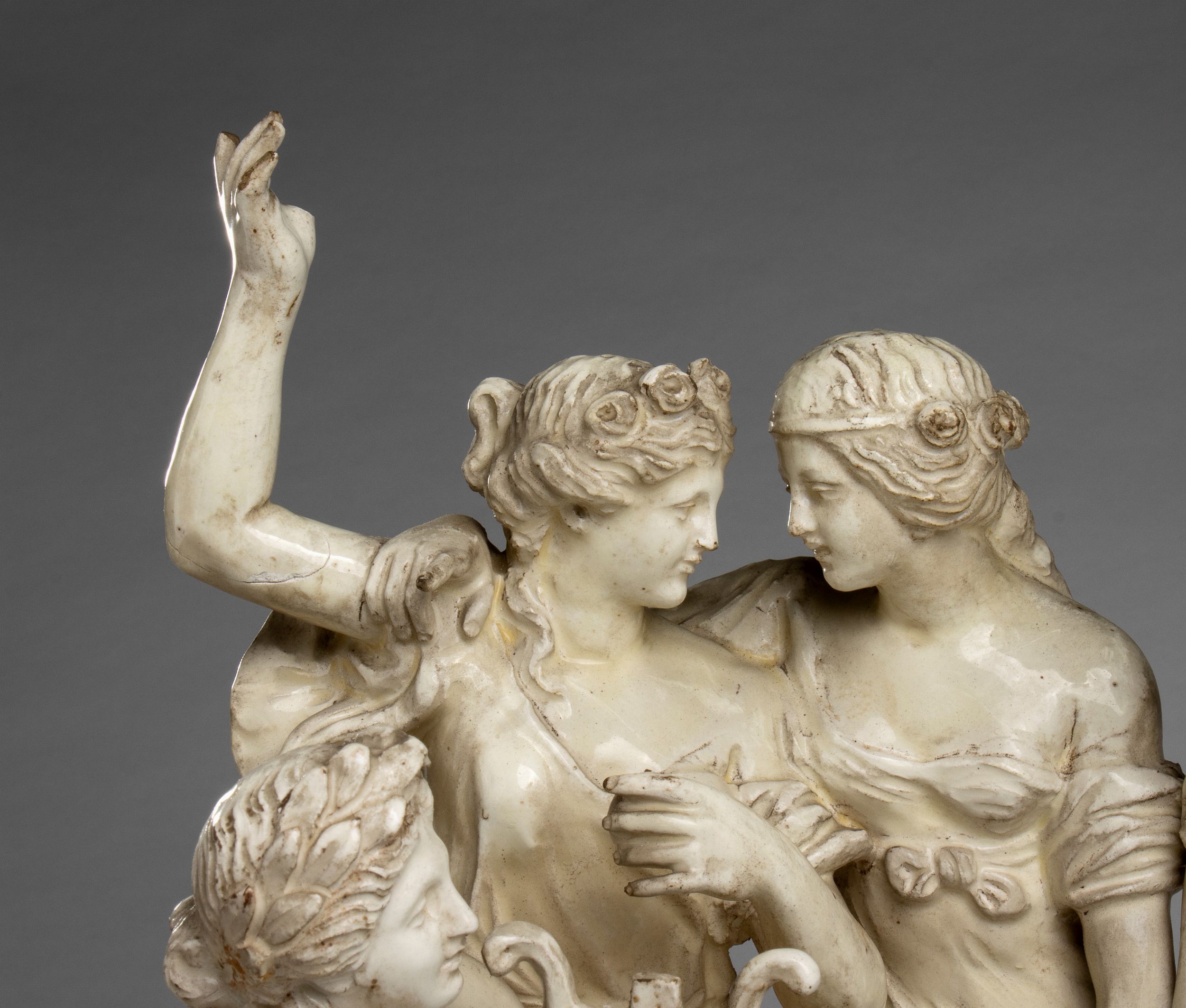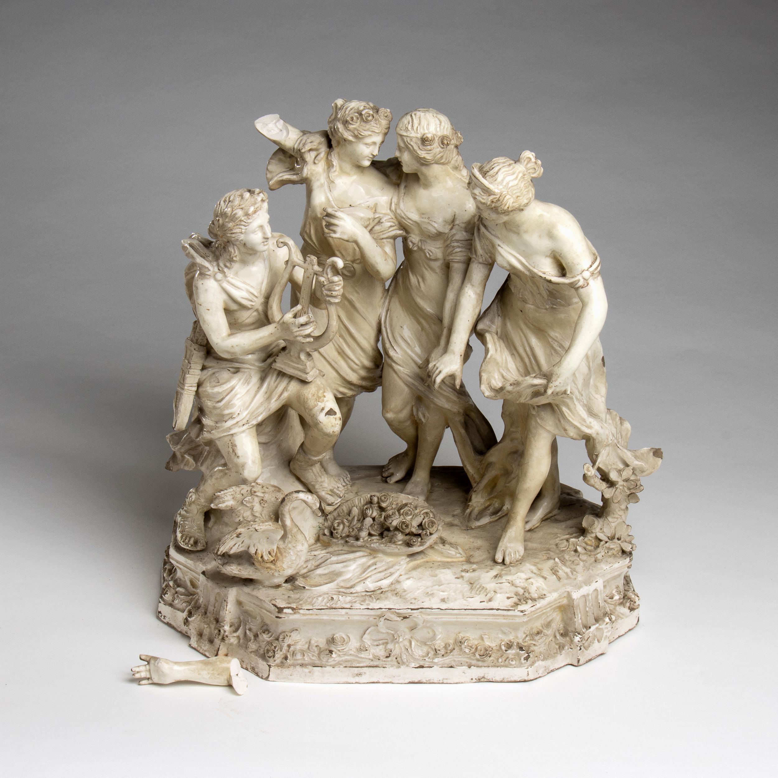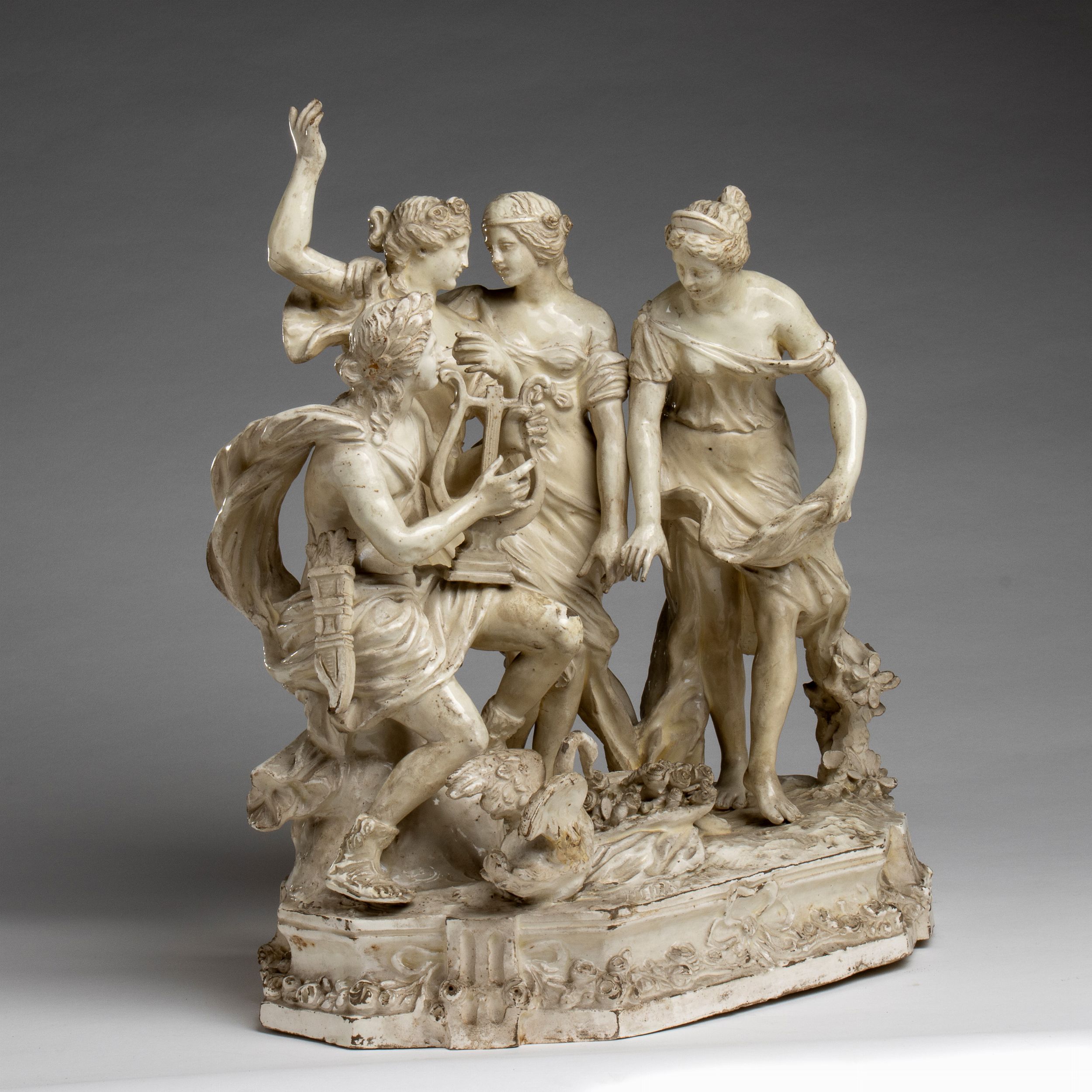 Inizio XX secolo gruppo scultoreo in ceramica raffigurante il dio Apollo e le Tre Grazie.