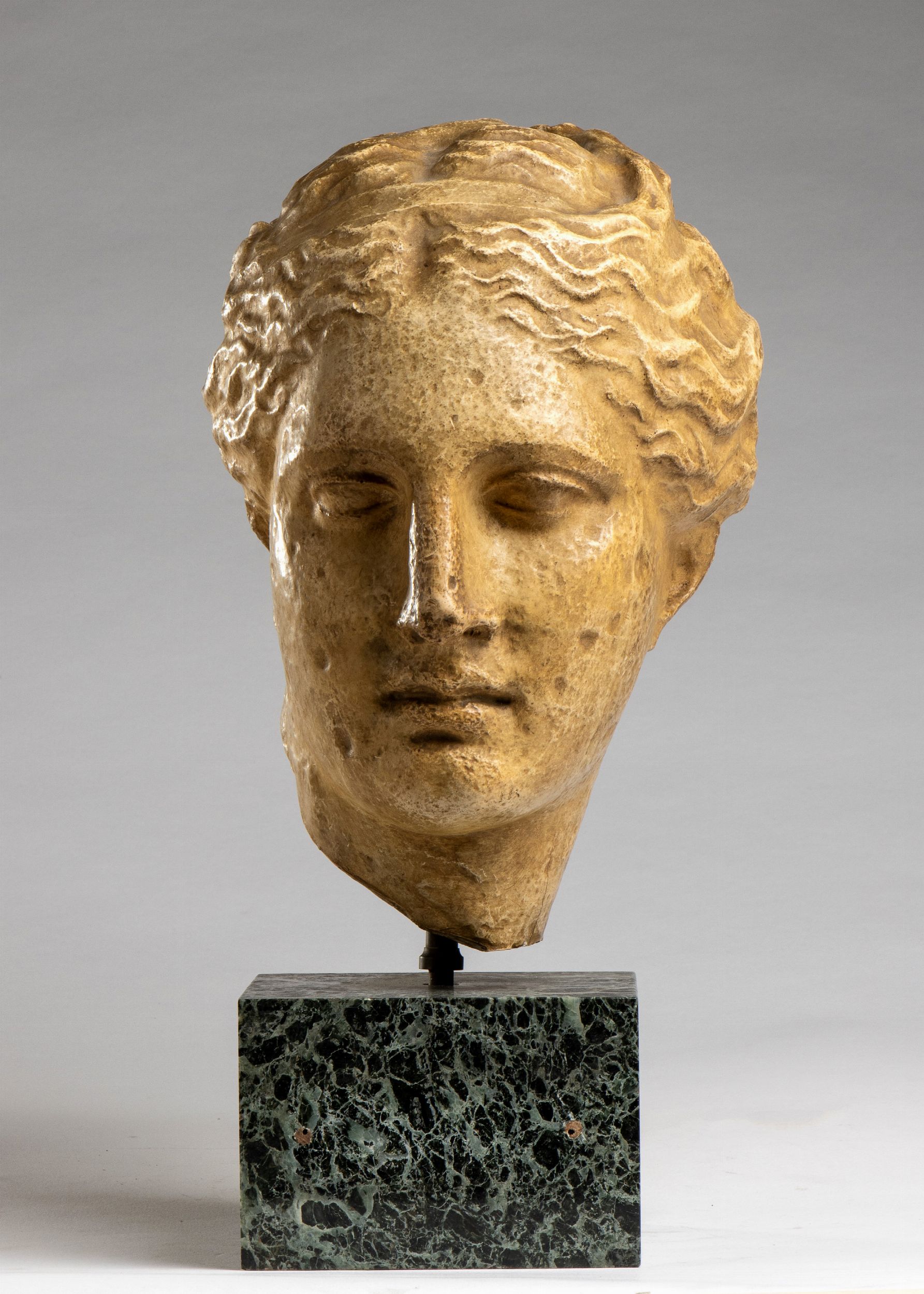 XX secolo la testa in gesso e poggiata su di un  basamento di marmo verde quadrato. Igea è la dea della salute e dell'igiene.
