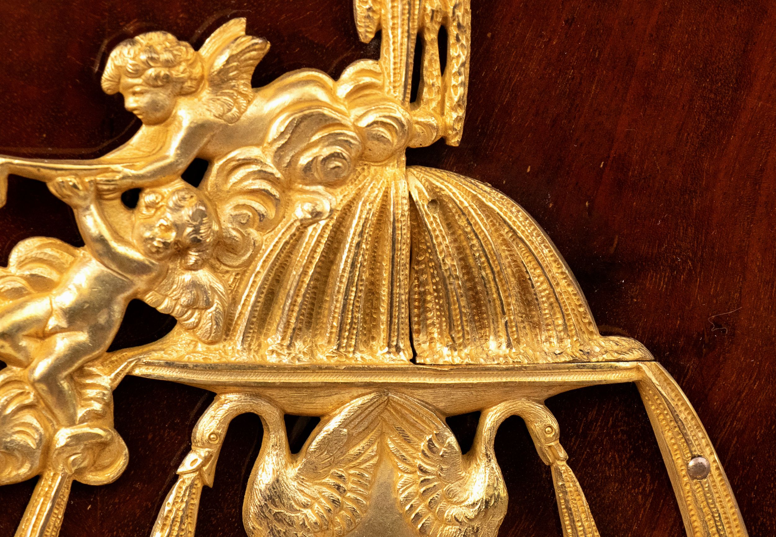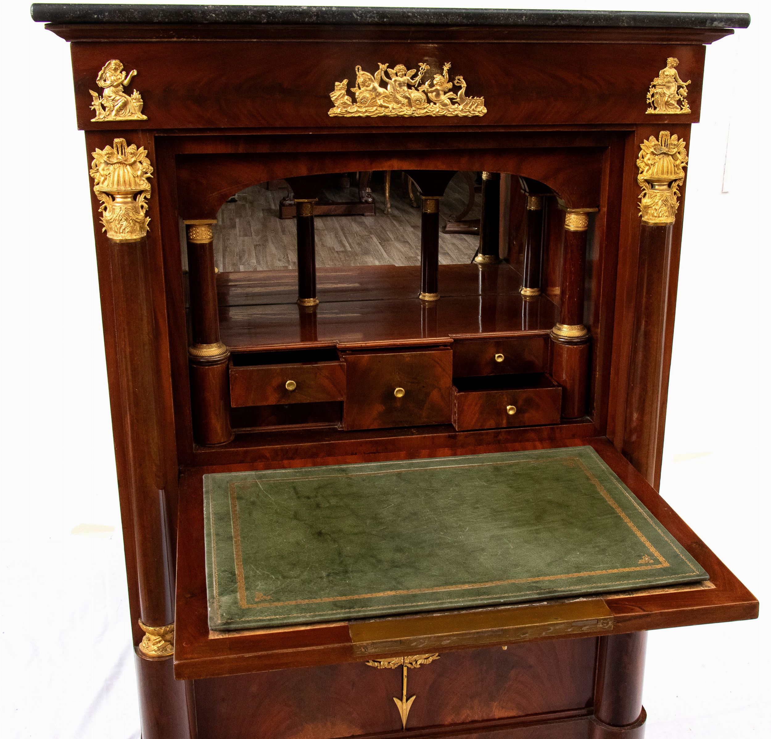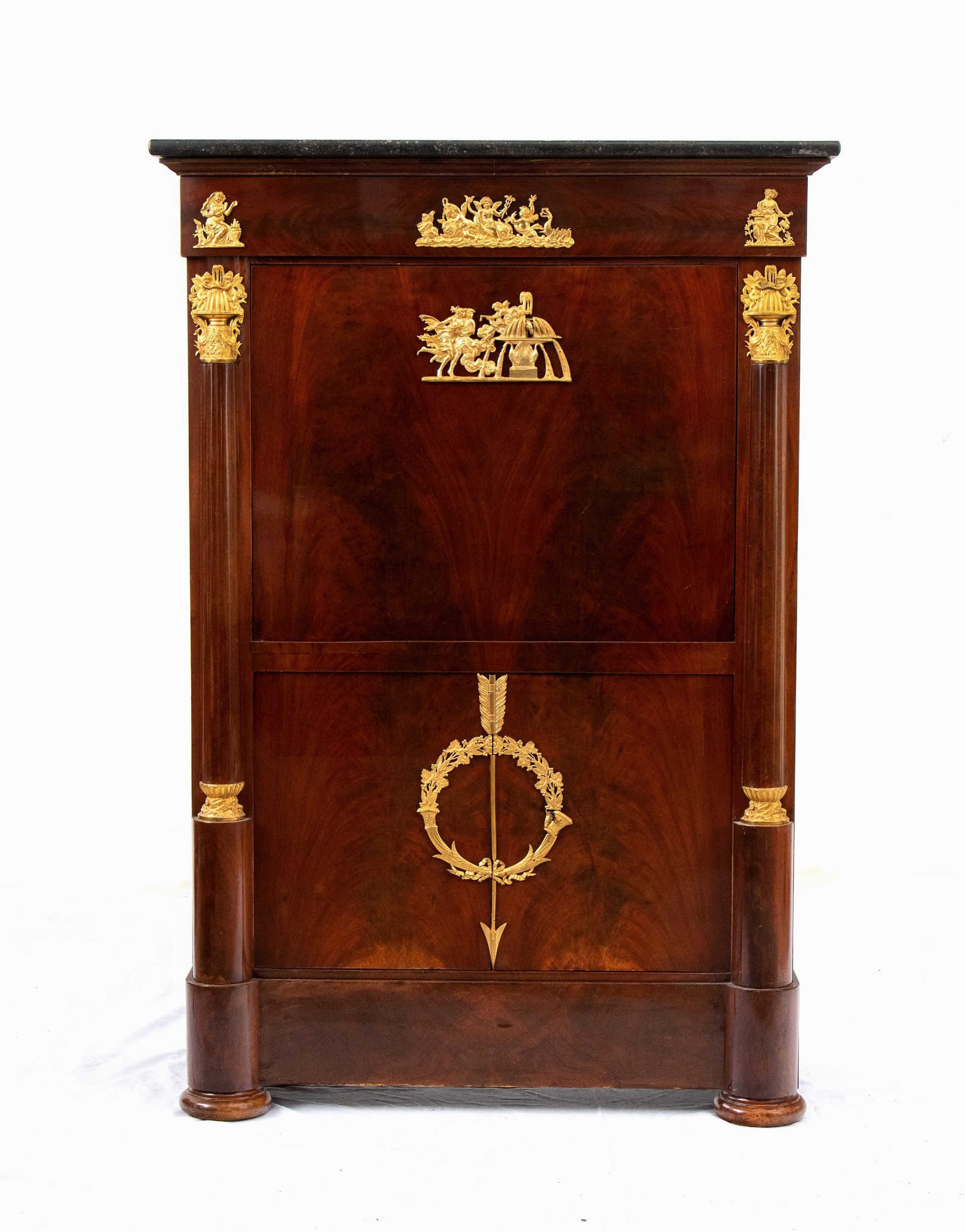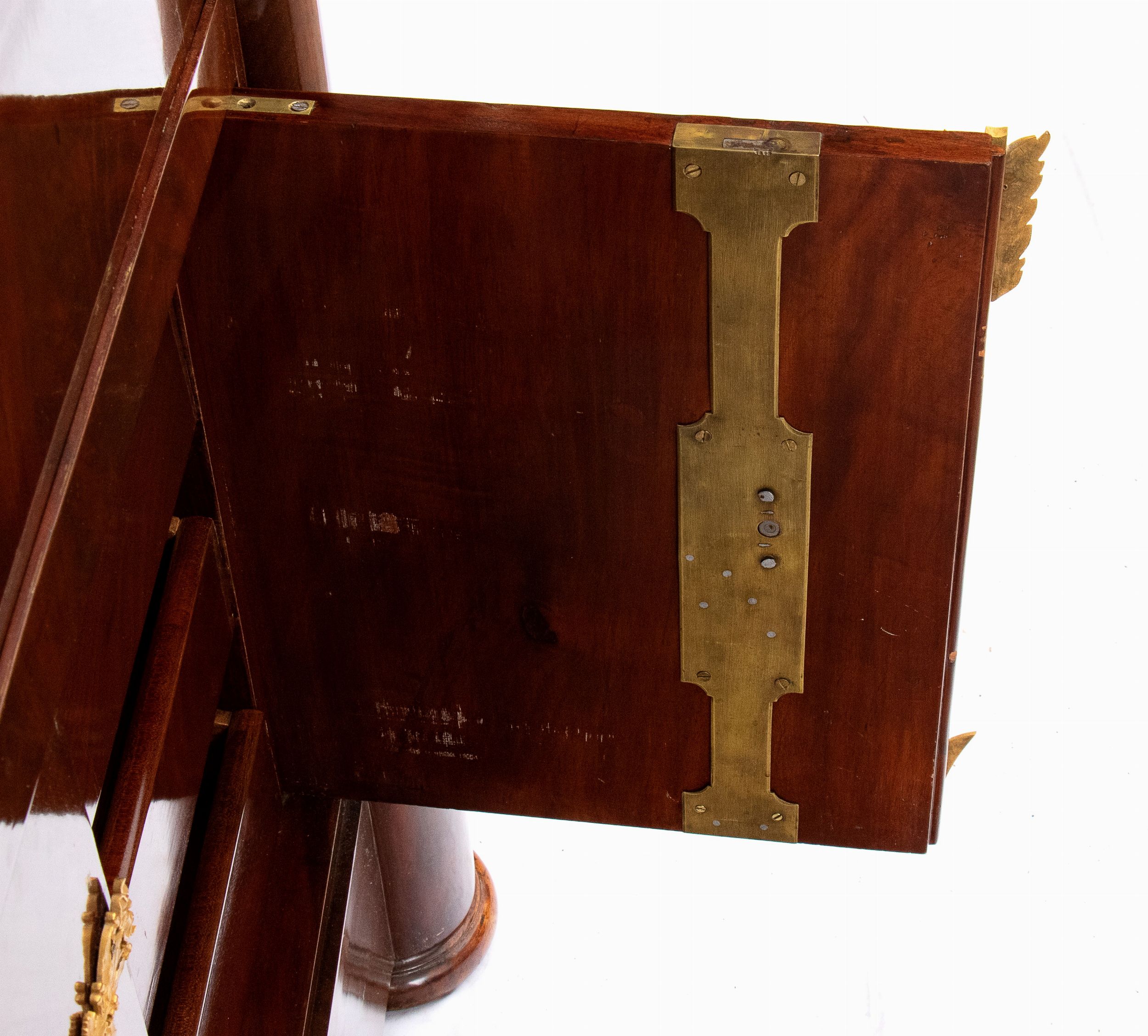 XIX secolo in piuma di mogano, adornato da applicazioni in bronzo raffiguranti scene neoclassiche, piano in marmo nero del Belgio