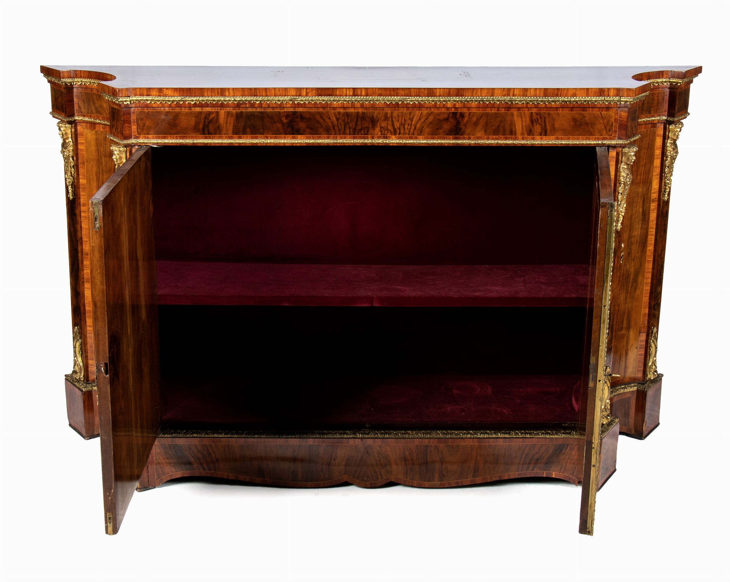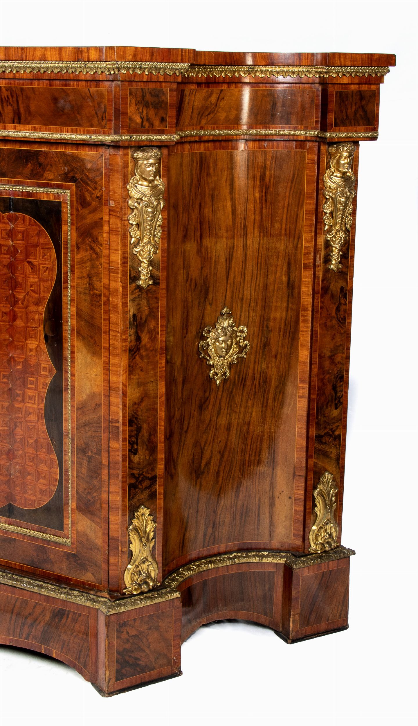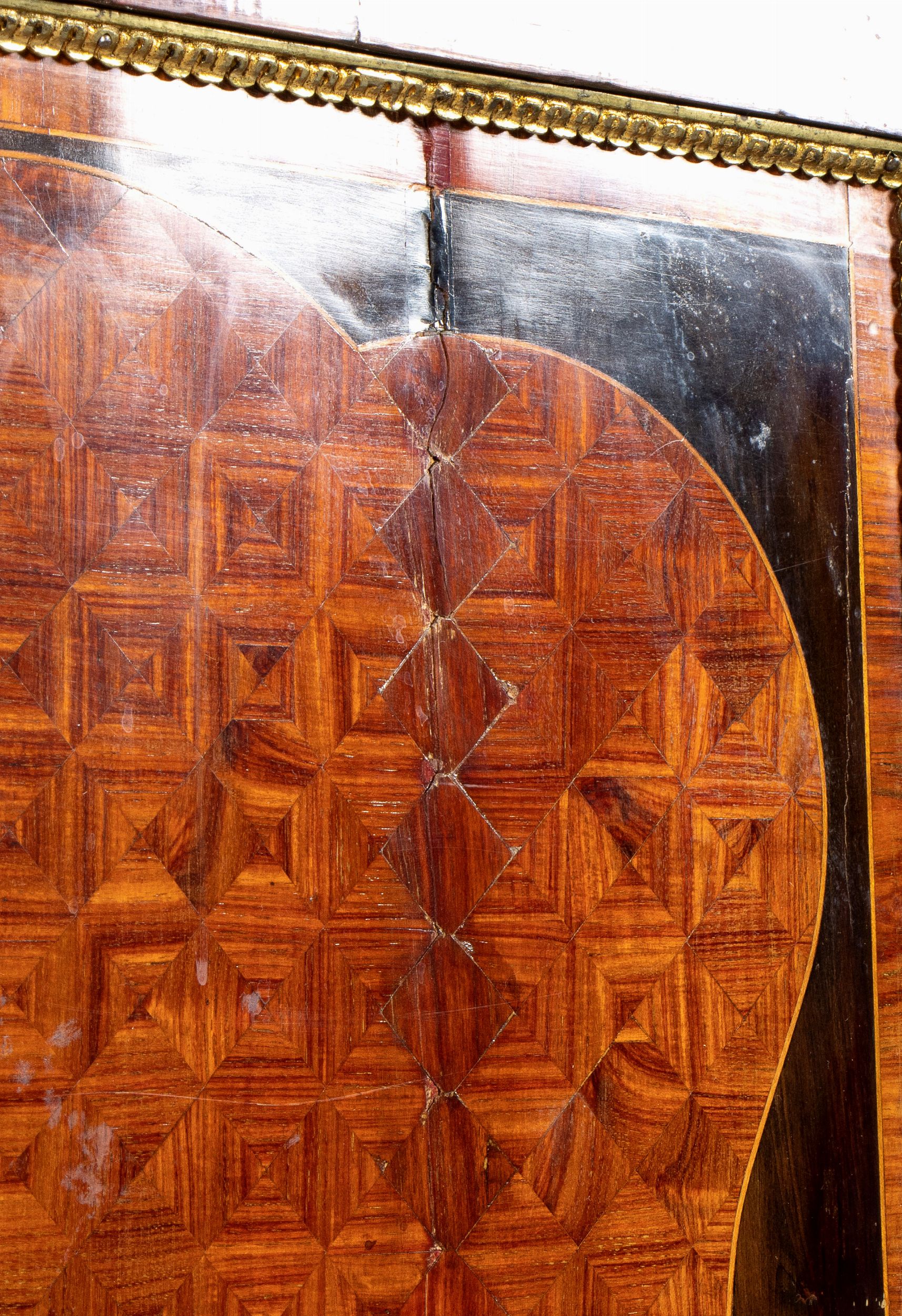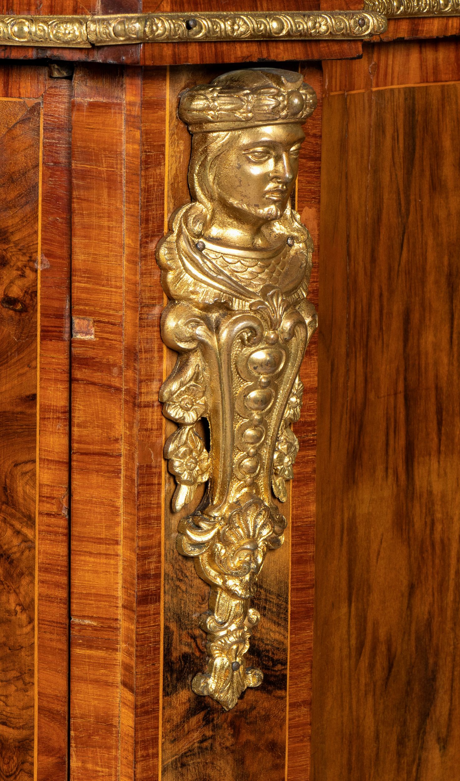 XIX secolo in legno di noce, con intarsi in ebano viola e applicazioni in bronzo dorato, sui pannelli intarsio a marqueterie.