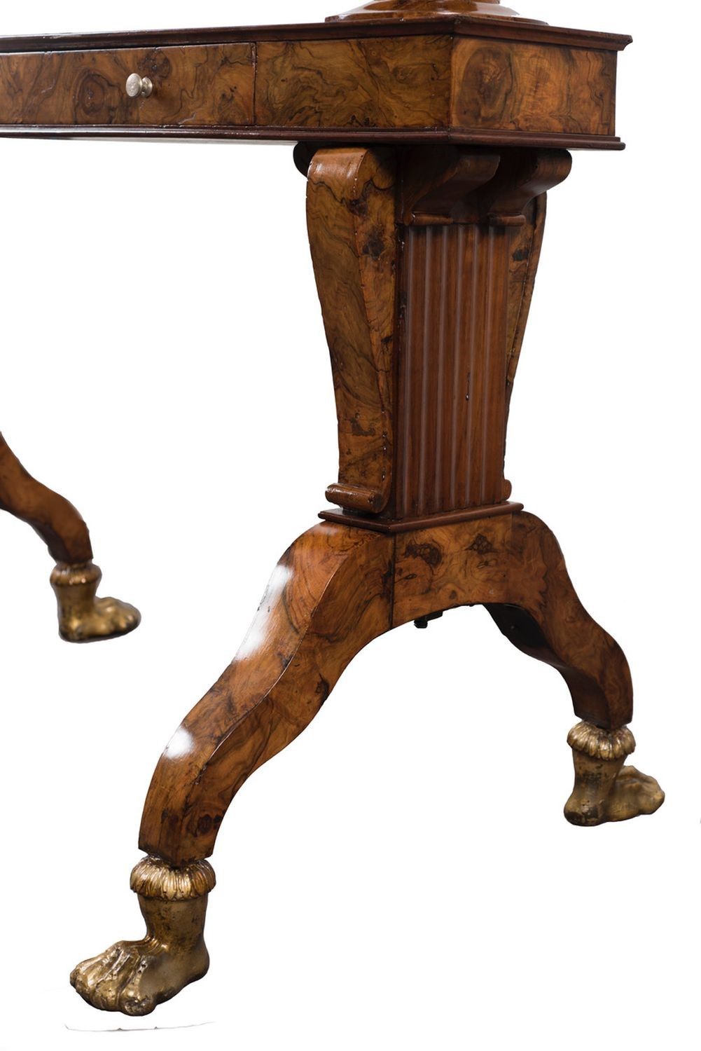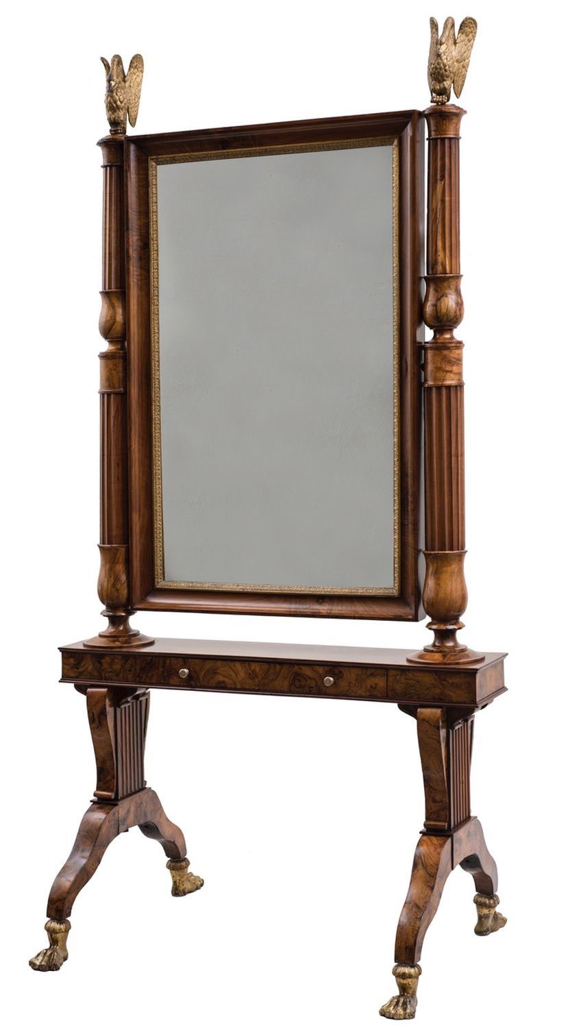 Dimensioni: 70x110x215 cm. XIX secolo in noce e radica di ulivo. La cornice dello specchio è decorata con volantini Impero. I supporti dello specchio sono colonne scanalate sormontate da due aquile in legno intagliato e dorato. Nella zona centrale lo specchio ha un cassetto. Supporti alla base con base a lira con gambe divaricate in un piede ferino con legno intagliato e dorato.