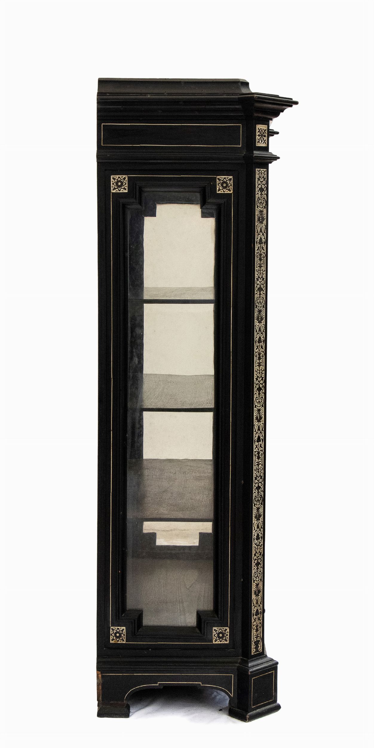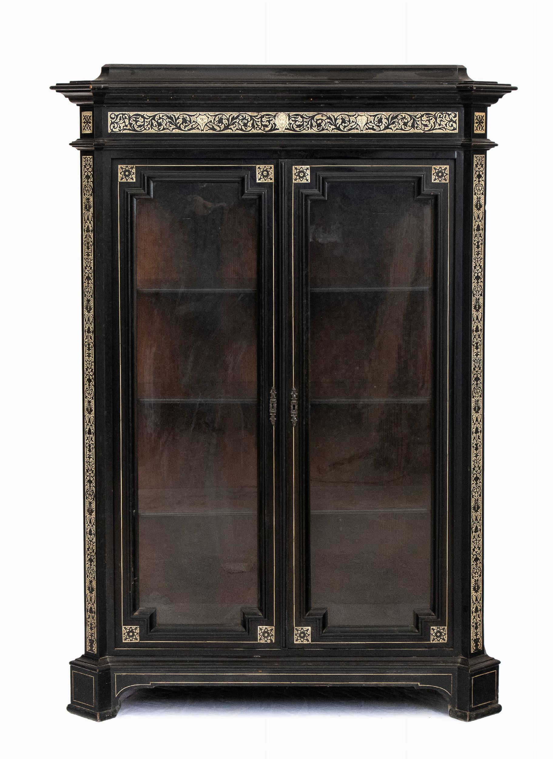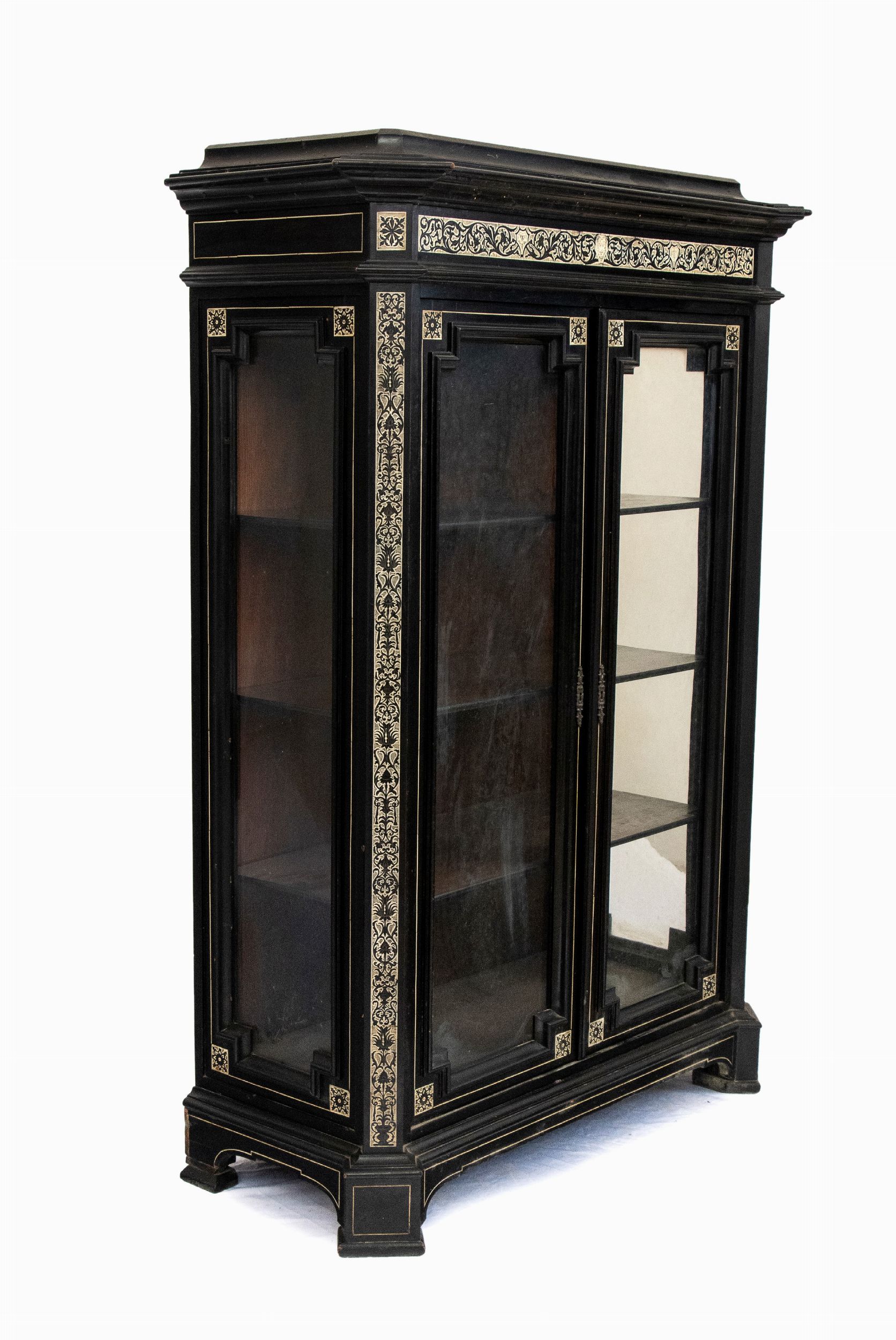 XIX secolo Questo elegante stipo rappresenta un esempio significativo della raffinata ebanisteria lombarda della seconda metà del XIX secolo. Realizzato in legno ebanizzato, è impreziosito da intarsi in avorio di elefante (Elephas maximus Linnaeus, 1758 o Loxodonta africana Blumenbach, 1797) incisi a graffio e ripassati a china con motivi che riproducono motivi decorativi vegetali e geometrici, tipici del gusto eclettico dell'epoca. La struttura è sobria ed equilibrata, con una cornice superiore leggermente aggettante e piedini sagomati che ne conferiscono leggerezza. Le ante, con inserti in vetro, rivelano all'interno una suddivisione a scaffali, pensata per esporre oggetti o libri. Il mobile rientra nella tipologia di opere realizzate nella bottega dell'ebanista milanese Ferdinando Pogliani (Milano 1832 - 1899). Attivo per la ricca borghesia milanese ebbe bottega prima in Porta Vittoria e poi in Montenapoleone. L'artista si distingue per la qualità eccezionale degli intarsi in avorio e per la complessità delle decorazioni figurative, ispirate al gusto neorinascimentale. Durante il XIX secolo, Milano era un centro importante per l'ebanisteria di alta qualità , con artigiani godevano di una reputazione internazionale. Pogliani e i suoi figli erano noti non solo per creare mobili di lusso, ma anche per restaurare e riprodurre fedelmente arredi storici. Lo stile di questo stipo riflette proprio la fusione tra classicismo rinascimentale e l'eclettismo ottocentesco.