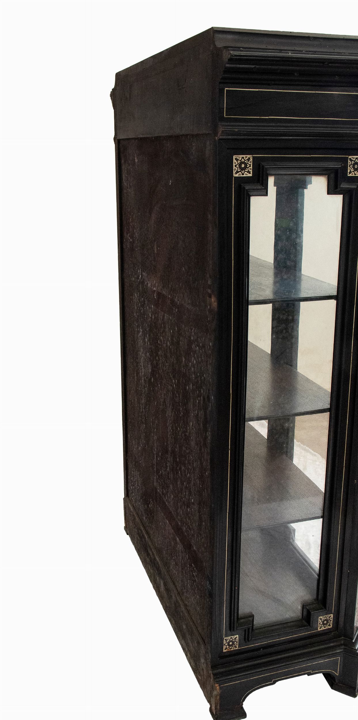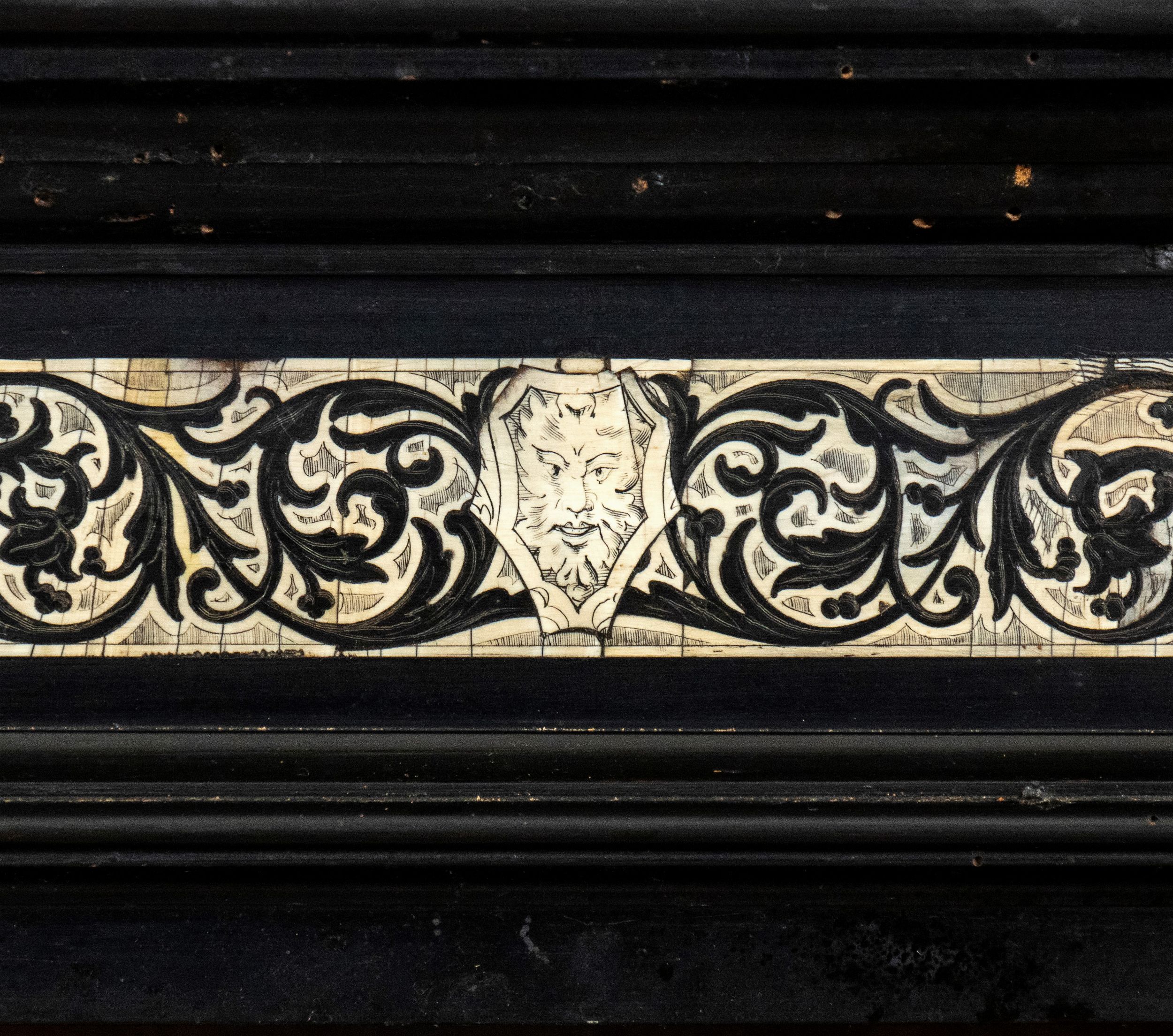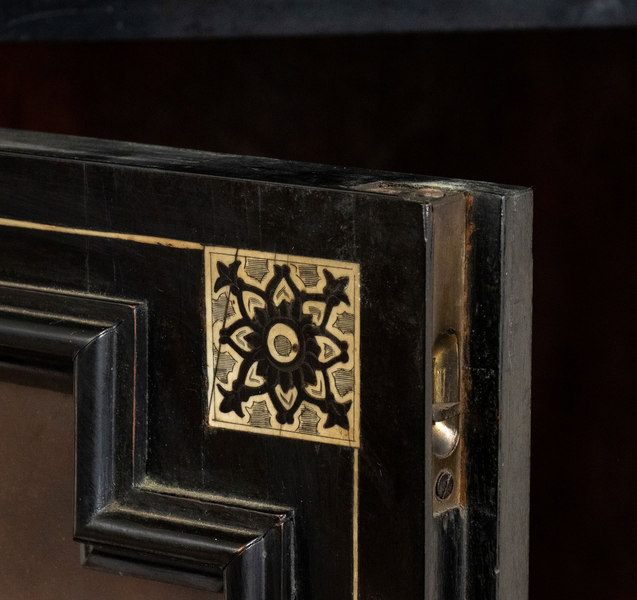 XIX secolo Questo elegante stipo rappresenta un esempio significativo della raffinata ebanisteria lombarda della seconda metà del XIX secolo. Realizzato in legno ebanizzato, è impreziosito da intarsi in avorio di elefante (Elephas maximus Linnaeus, 1758 o Loxodonta africana Blumenbach, 1797) incisi a graffio e ripassati a china con motivi che riproducono motivi decorativi vegetali e geometrici, tipici del gusto eclettico dell'epoca. La struttura è sobria ed equilibrata, con una cornice superiore leggermente aggettante e piedini sagomati che ne conferiscono leggerezza. Le ante, con inserti in vetro, rivelano all'interno una suddivisione a scaffali, pensata per esporre oggetti o libri. Il mobile rientra nella tipologia di opere realizzate nella bottega dell'ebanista milanese Ferdinando Pogliani (Milano 1832 - 1899). Attivo per la ricca borghesia milanese ebbe bottega prima in Porta Vittoria e poi in Montenapoleone. L'artista si distingue per la qualità eccezionale degli intarsi in avorio e per la complessità delle decorazioni figurative, ispirate al gusto neorinascimentale. Durante il XIX secolo, Milano era un centro importante per l'ebanisteria di alta qualità , con artigiani godevano di una reputazione internazionale. Pogliani e i suoi figli erano noti non solo per creare mobili di lusso, ma anche per restaurare e riprodurre fedelmente arredi storici. Lo stile di questo stipo riflette proprio la fusione tra classicismo rinascimentale e l'eclettismo ottocentesco.
