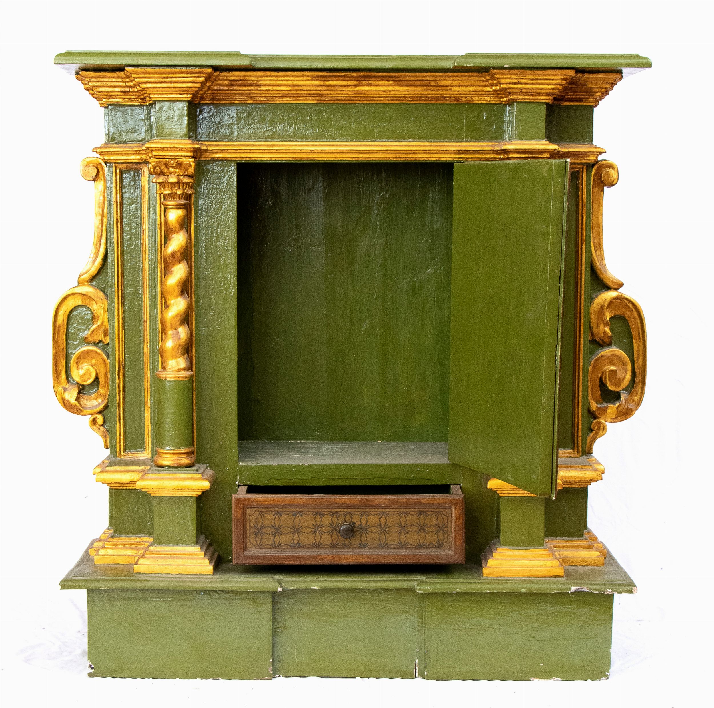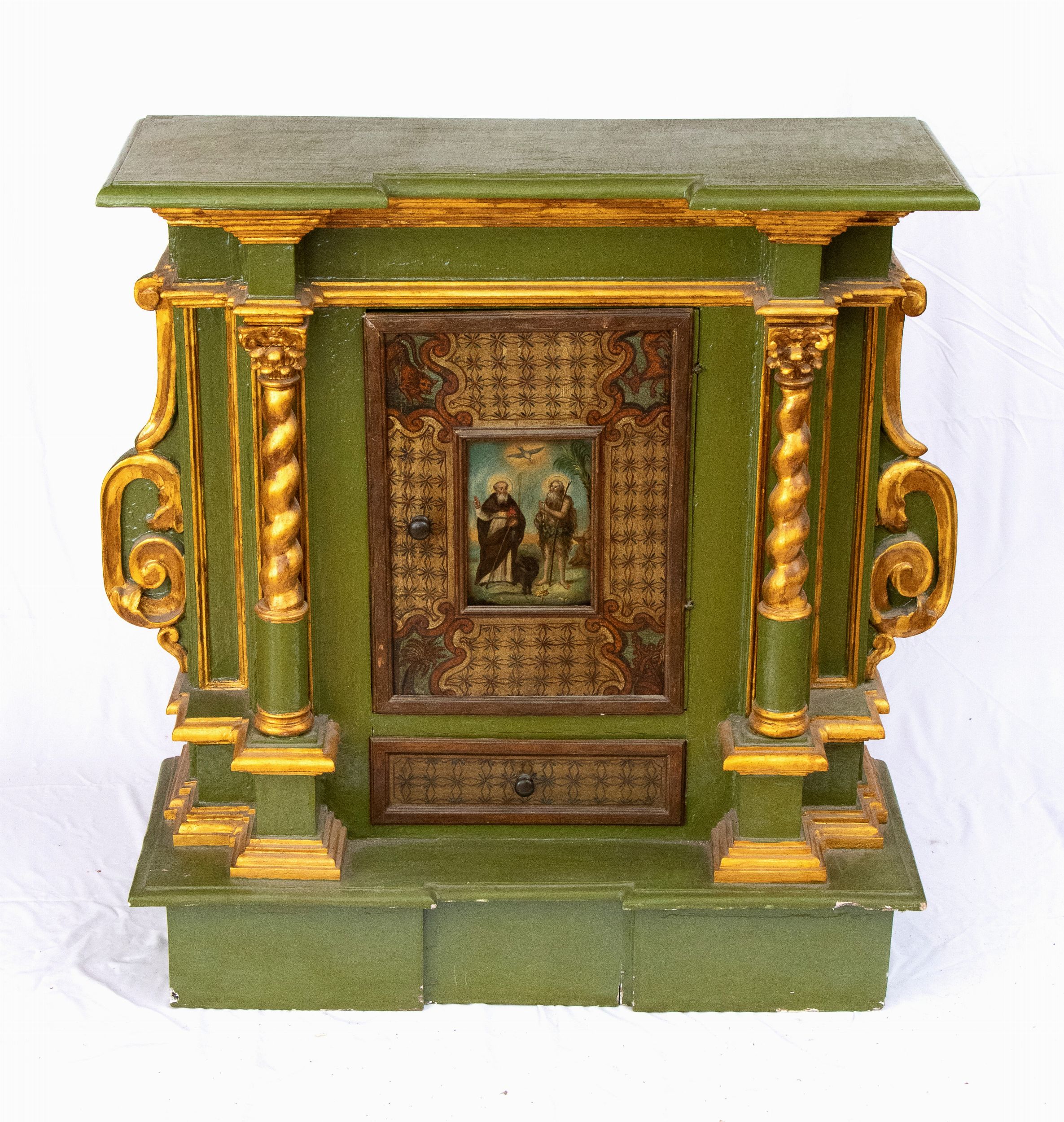 Altezza x larghezza x profondità : 107 x 100 x 37 cm Italia settentrionale, XVIII secolo struttura architettonica in legno laccato verde con colonne a tortiglione e fregi dorati, cassetto sottostante e anta centrale dipinta con Sant'Antonio Abate e Sant'Onofrio.
