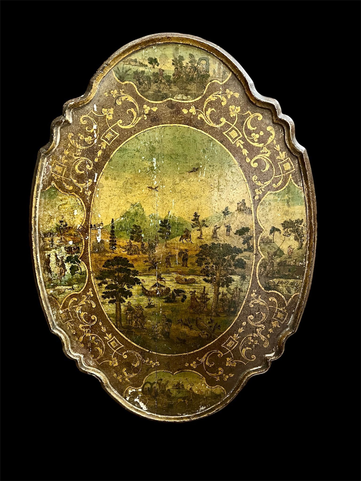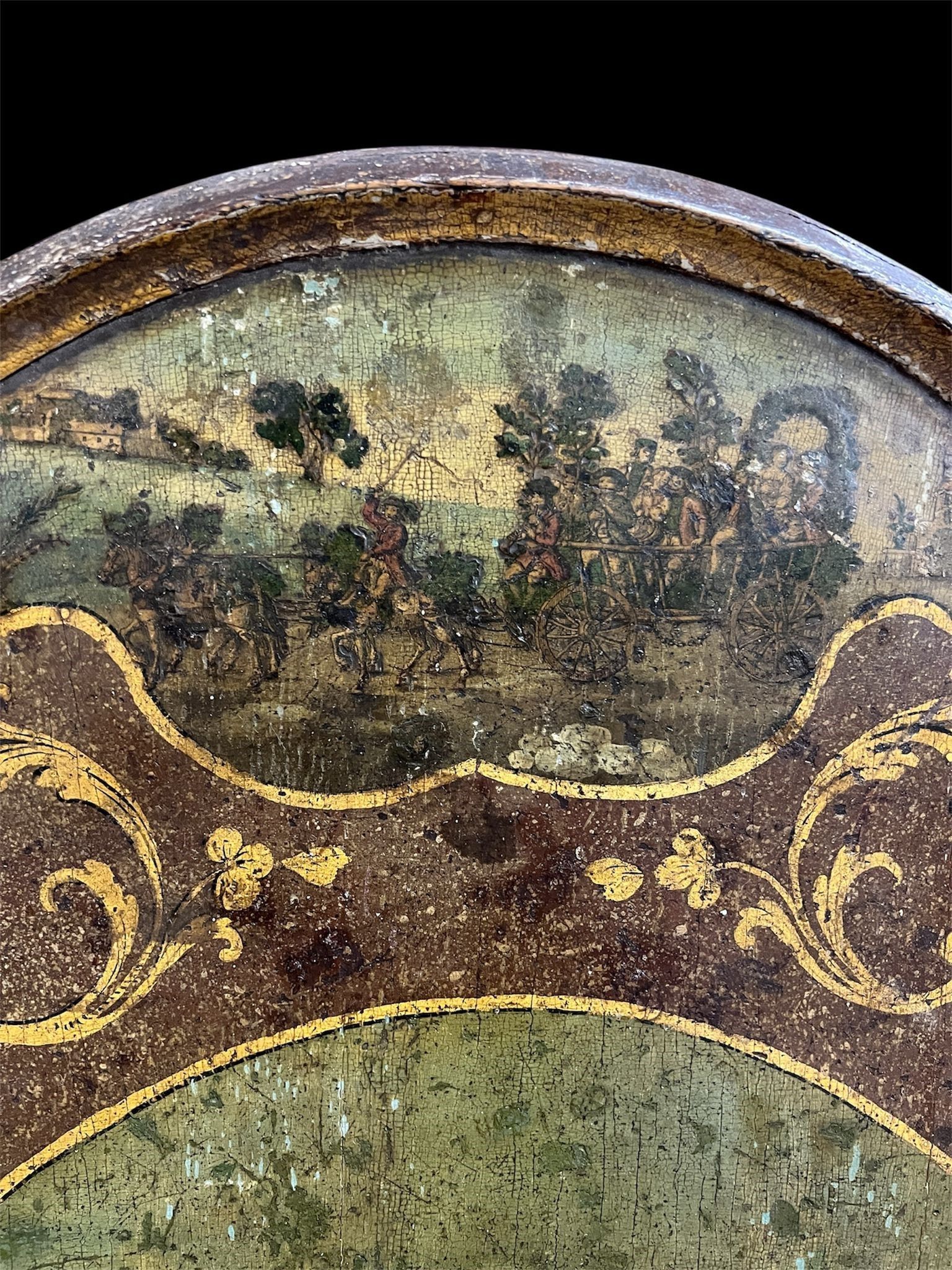 Venezia, XVIII secolo laccato e dipinto sui bordi a motivi floreali, sui quadro lati e al centro paesaggi e personaggi.
