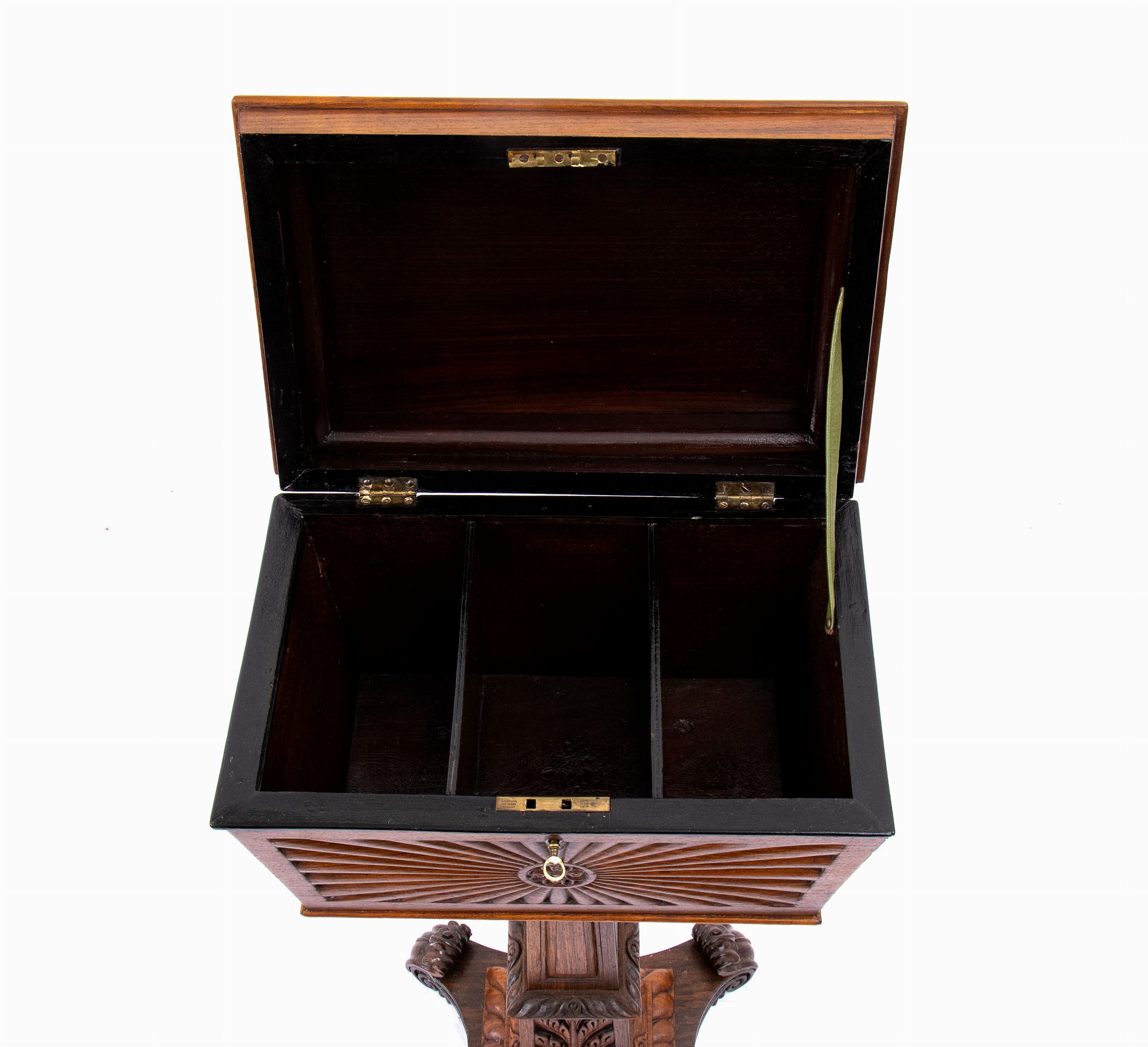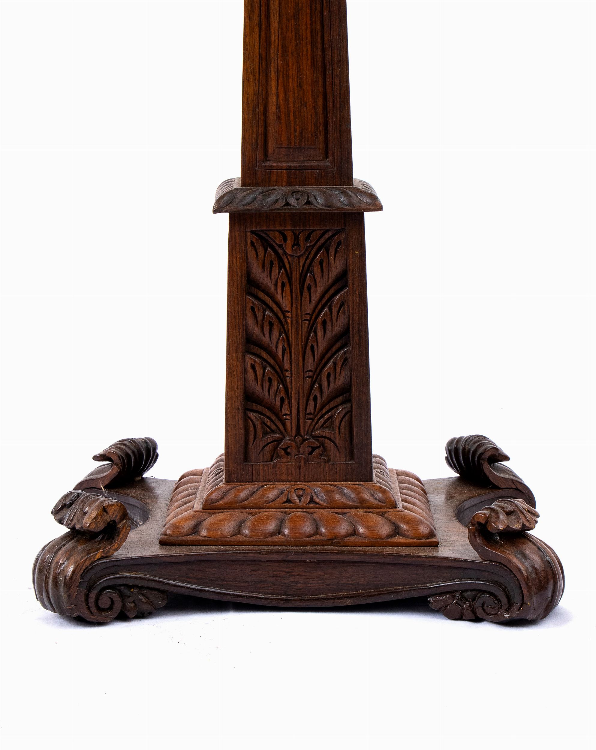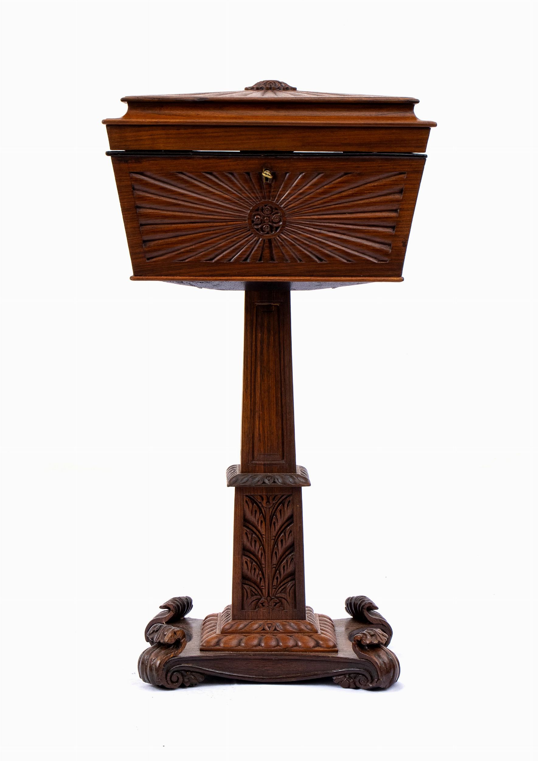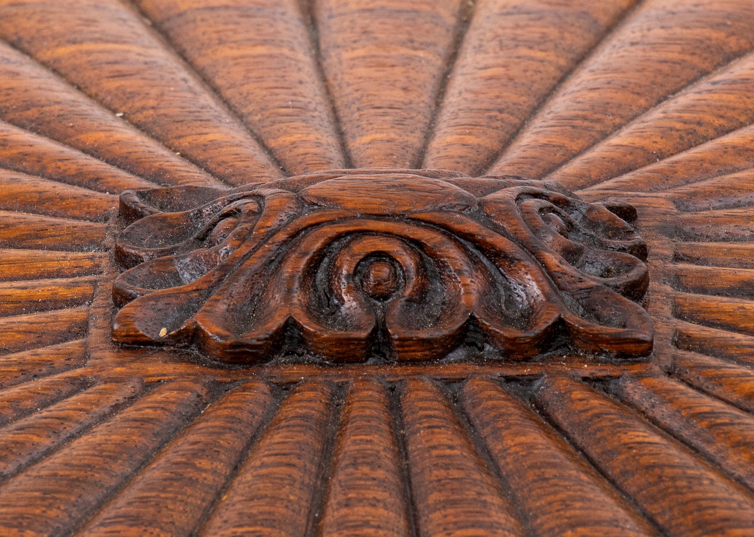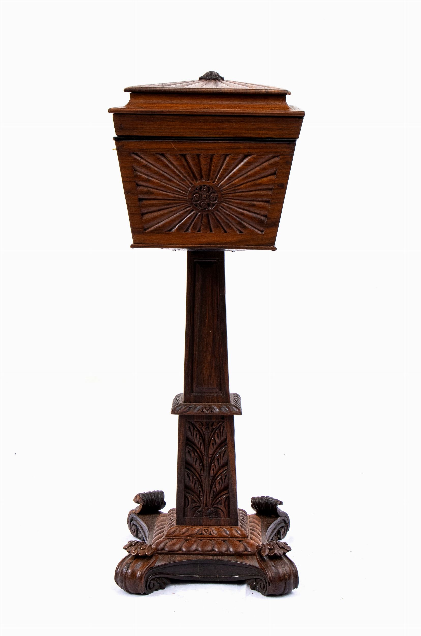 XIX secolo in legno di palissandro intagliato sul coperchio se sui fianchi con motivi a raggiera, gamba centrale su basamento rettangolare a motivi fogliati.