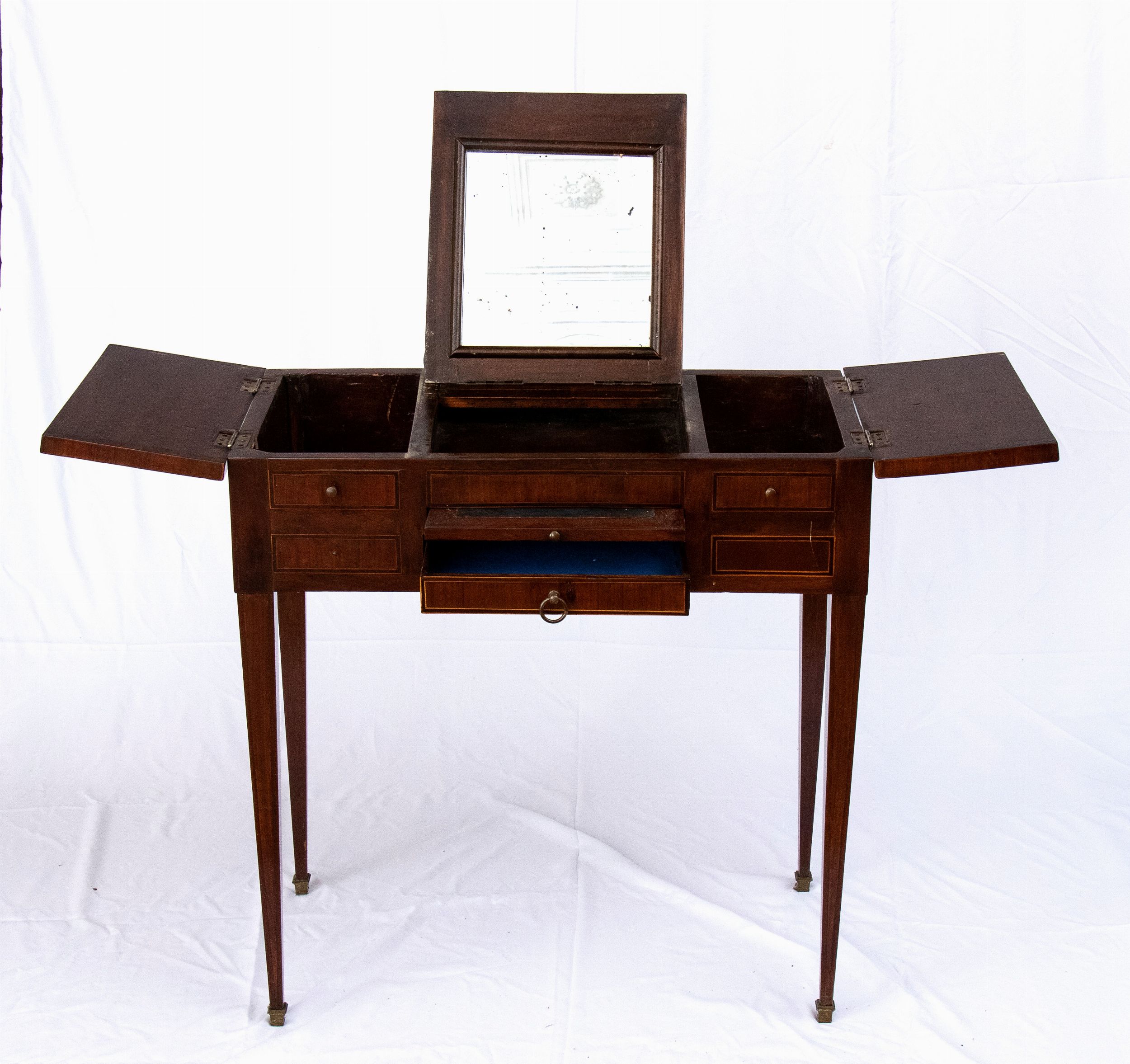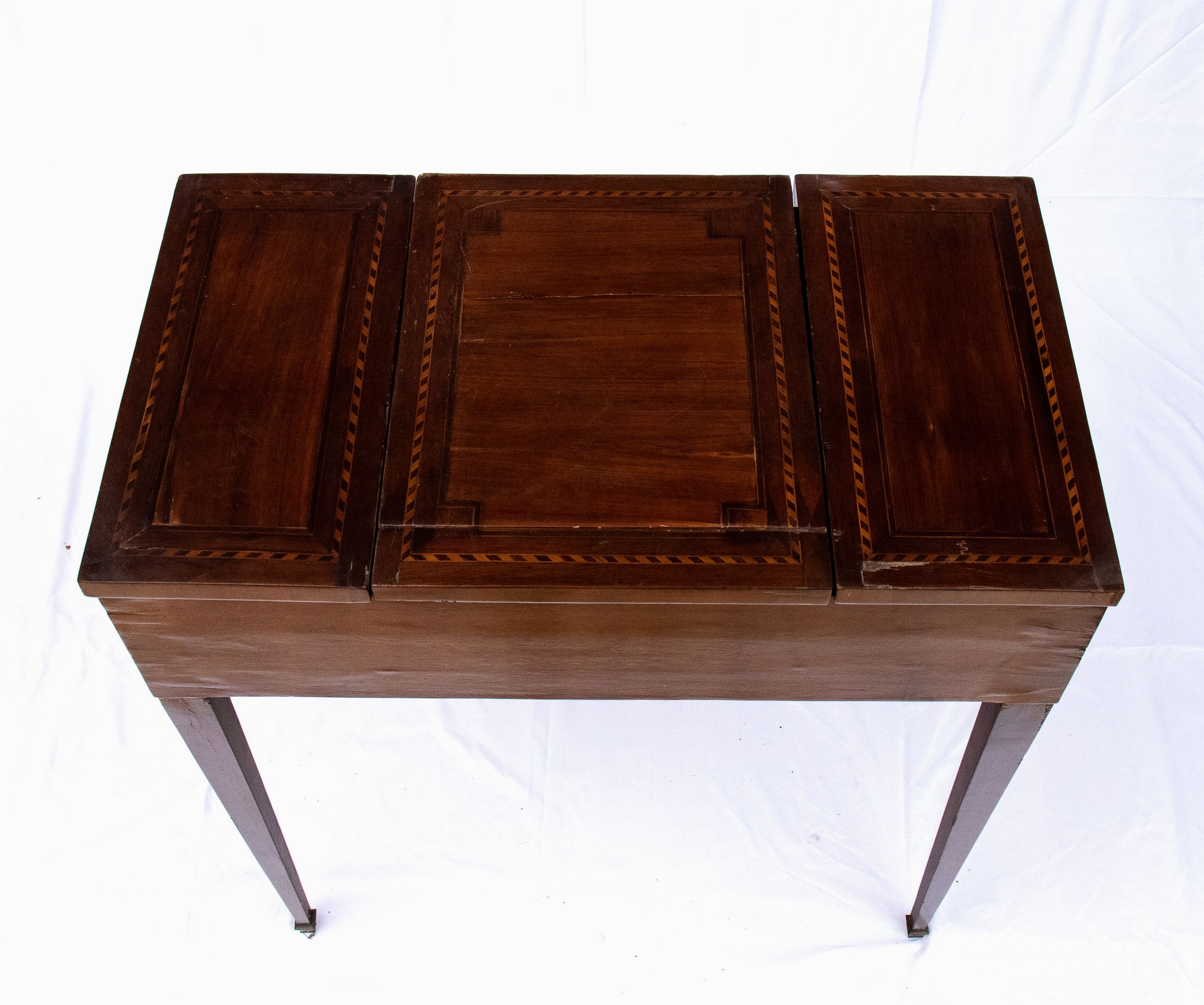 Altezza x larghezza x profondità : 74 x 73 x 41 cm XIX secolo in mogano intarsiata in legni di frutto, sportello centrale del piano ribaltabile con specchio e due laterali che coprono due vani porta oggetti. Tiretto scrittoio centrale ed un cassetto sottostante esso.