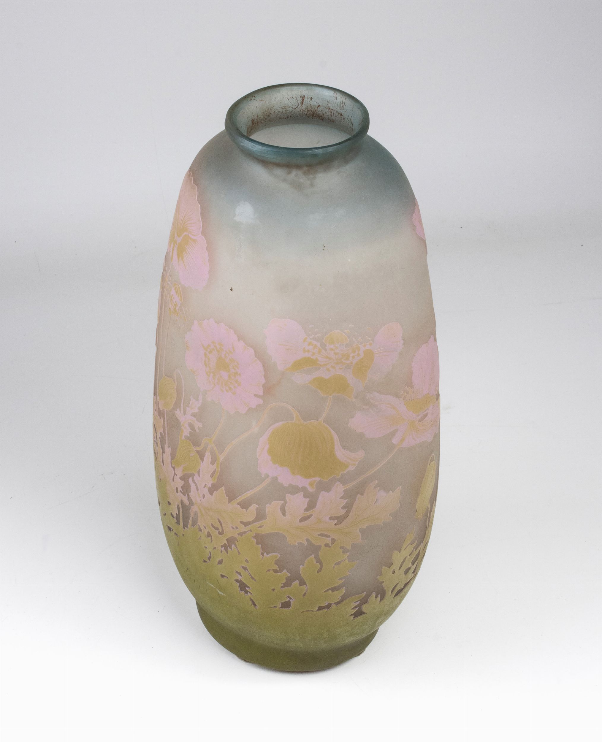 con collo strozzato, con stampa industriale in vetro con multistrato verde e rosa su fondo bianco con sfumature bluastre e decorazioni incise a cammeo con acido. Firmato.