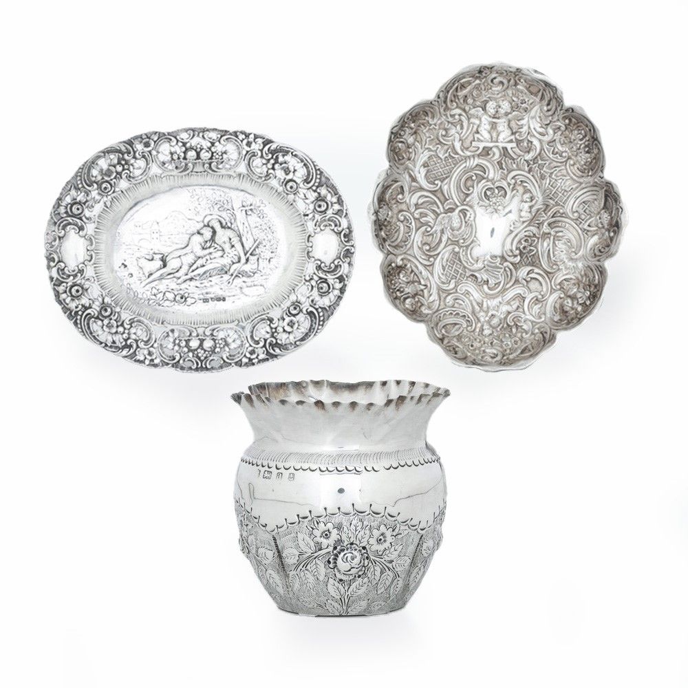 Insieme di vaso, Birmingham 1906, marchio dell'argentiere consunto e due vassoietti [..]