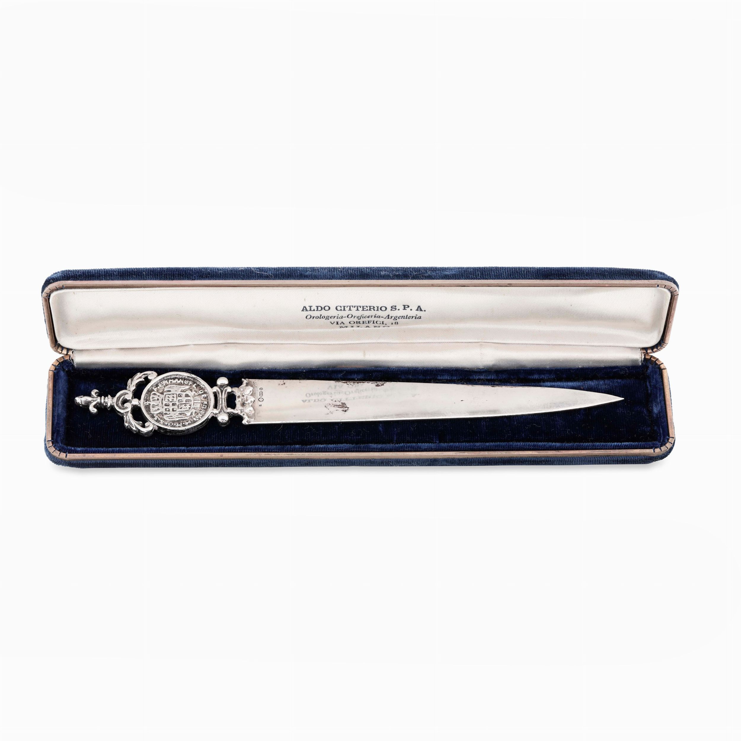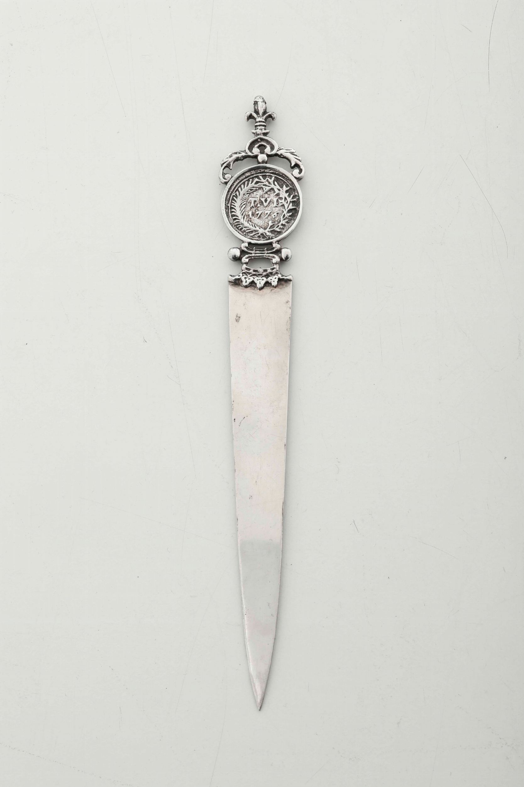 Tagliacarte. Argento fuso, traforato e cesellato. Marchio non identificato.