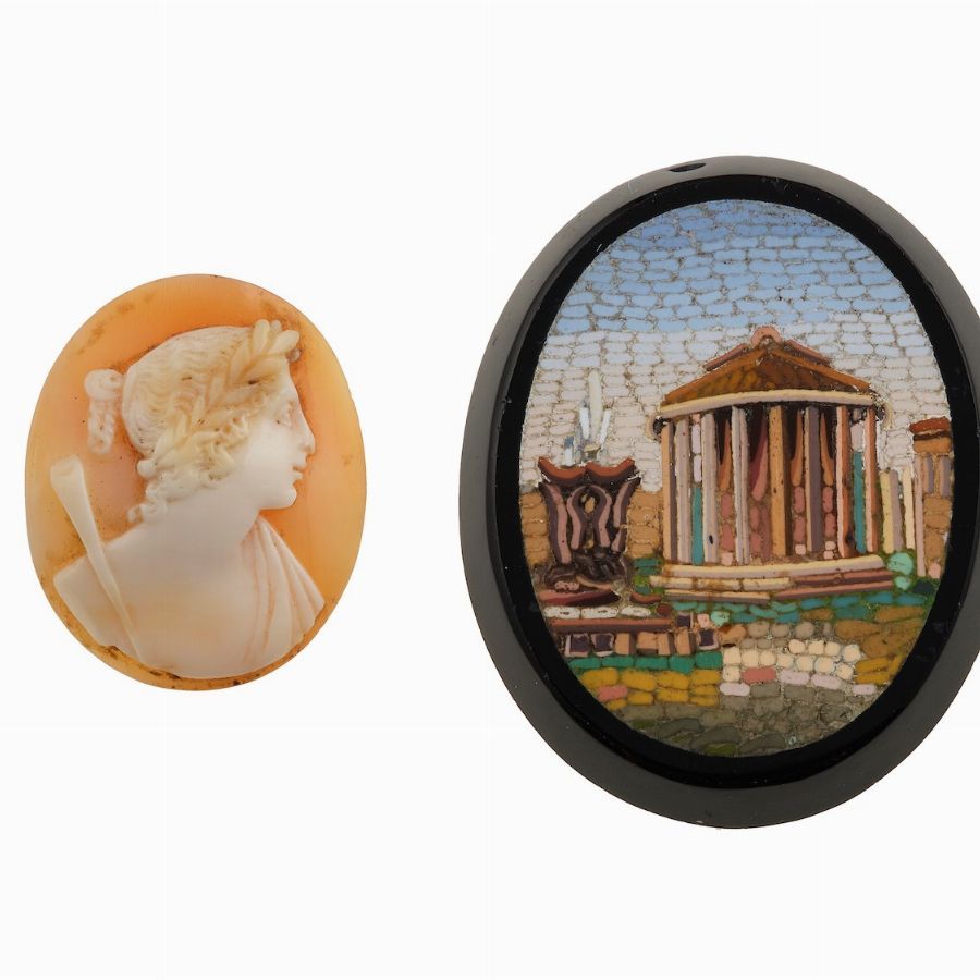 Lotto costituito da un cammeo su conchiglia e un micromosaico su pietra dura