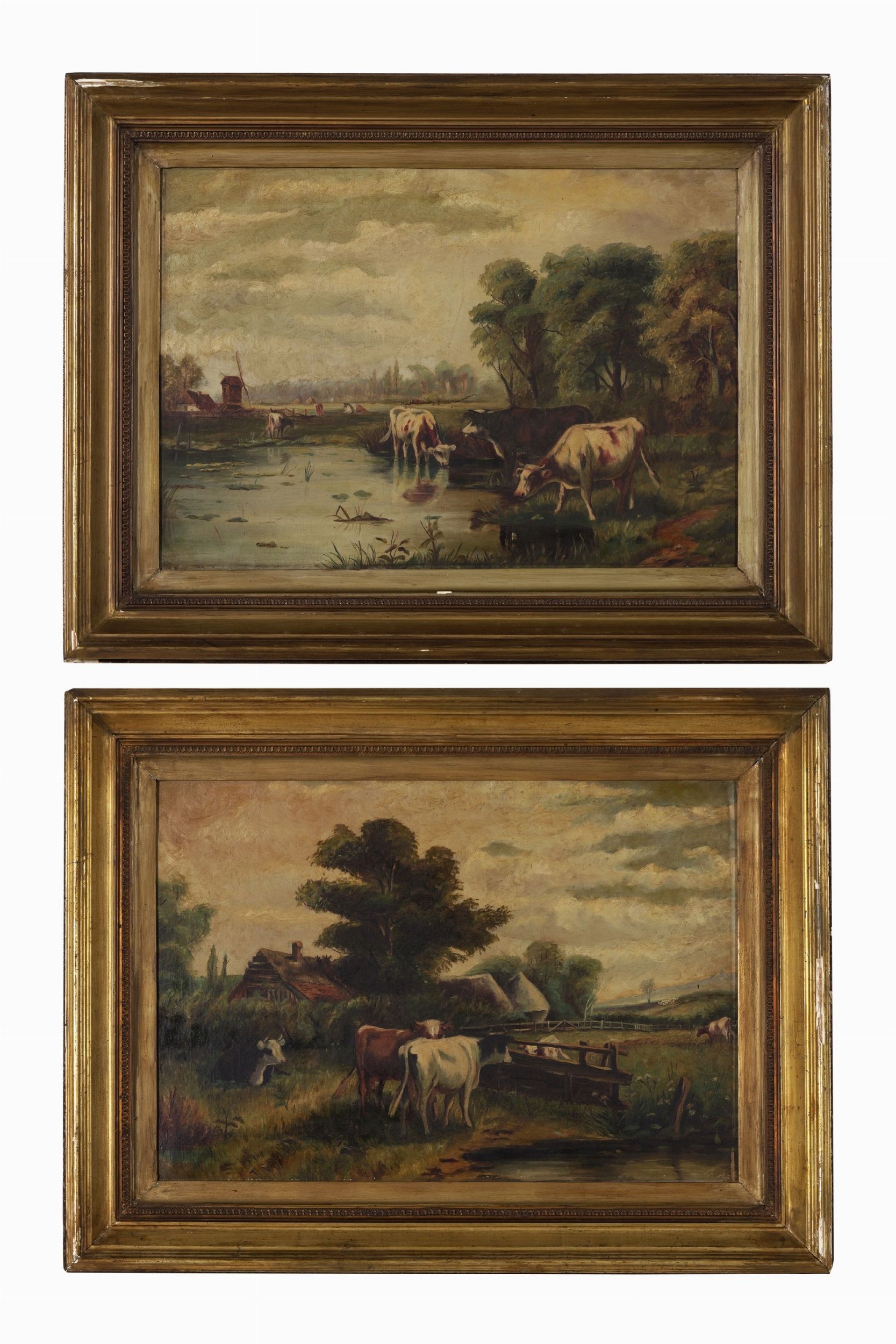 Pittore del XIX-XX secolo Coppia di paesaggi con mucche al pascolo