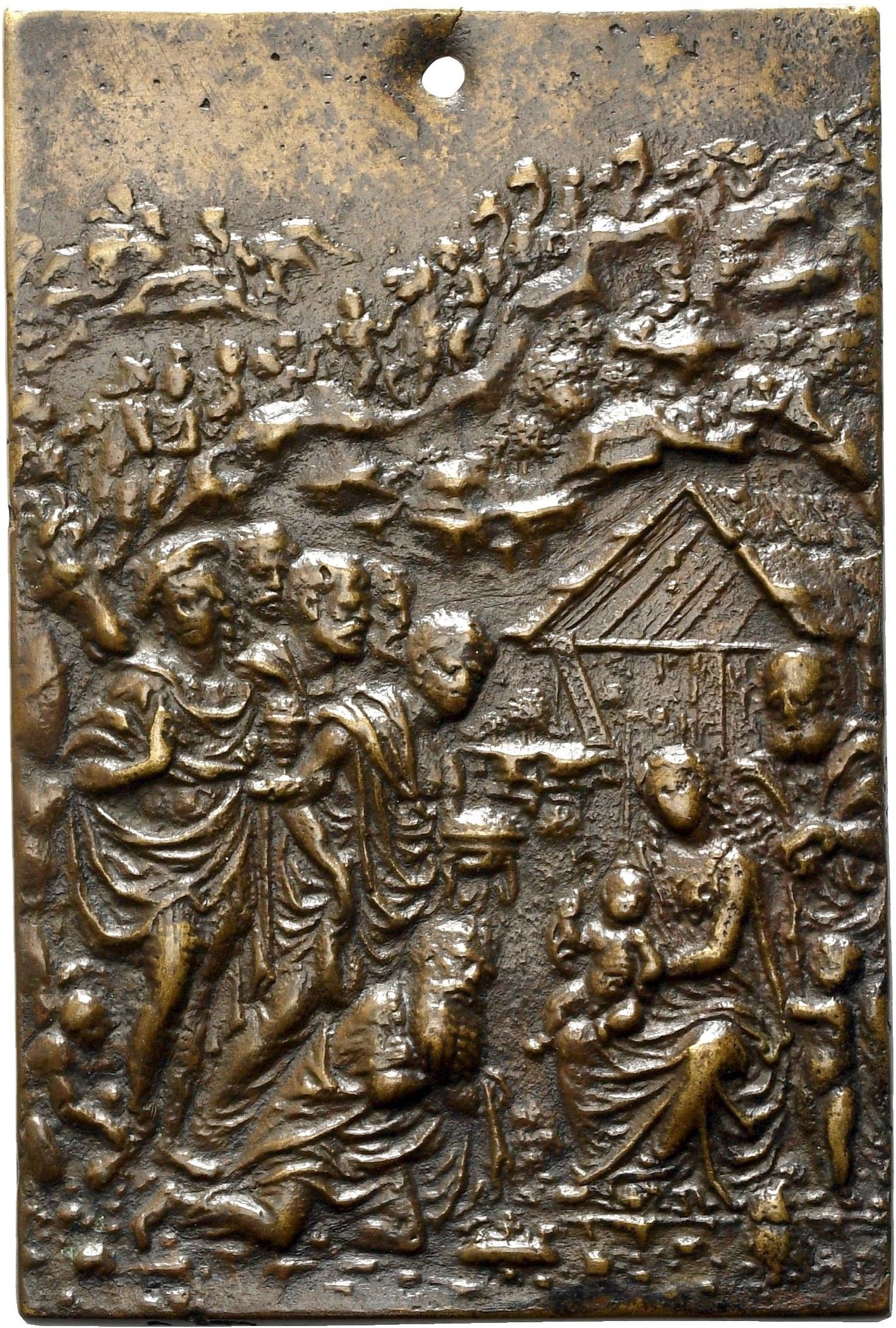 Placchetta rettangolare in bronzo, patina marrone, foro in alto al centro; mm 98,2 x 65,8; gr 134,2. Maria con San Giuseppe presenta Gesù Bambino ai Magi, seguiti da quattro pastori; sullo sfondo una capanna e corteo di persone che scendono dalla montagna. In alto a destra una stella. Bellissima fusione antica. R\ vecchia etichetta di inventario. Bibl. Rossi F. coll. Scaglia 2011 tipo prototipo p.177 V.8. Pope – Hennesy 1965, pp45\46, n. 144