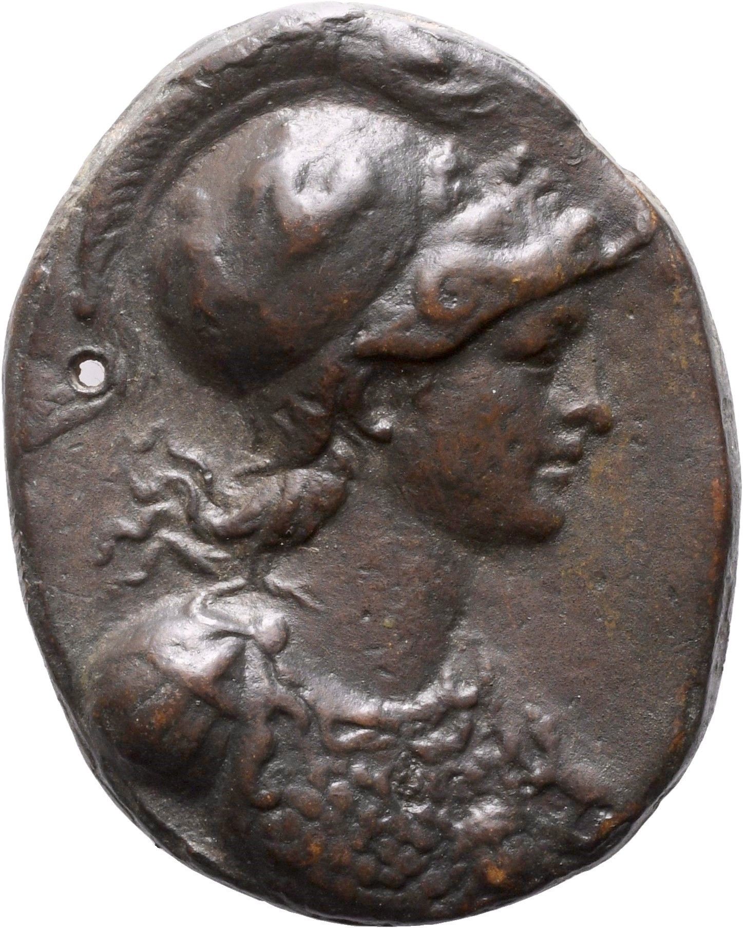 Italia XVII secolo Placchetta ovale in bronzo; mm 53,5; gr 66. Foro a destra. Busto di Alessandro Magno rivolto verso destra.