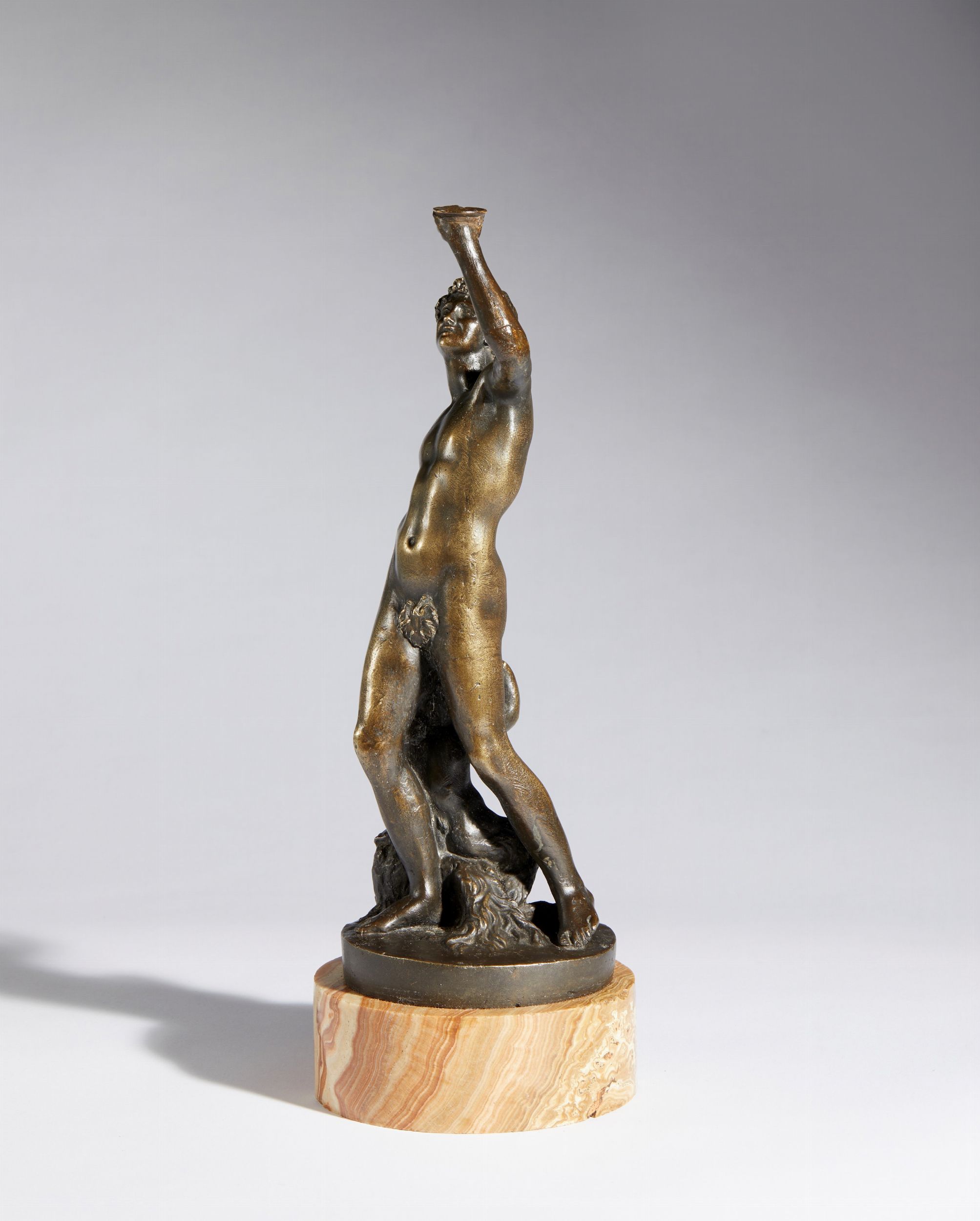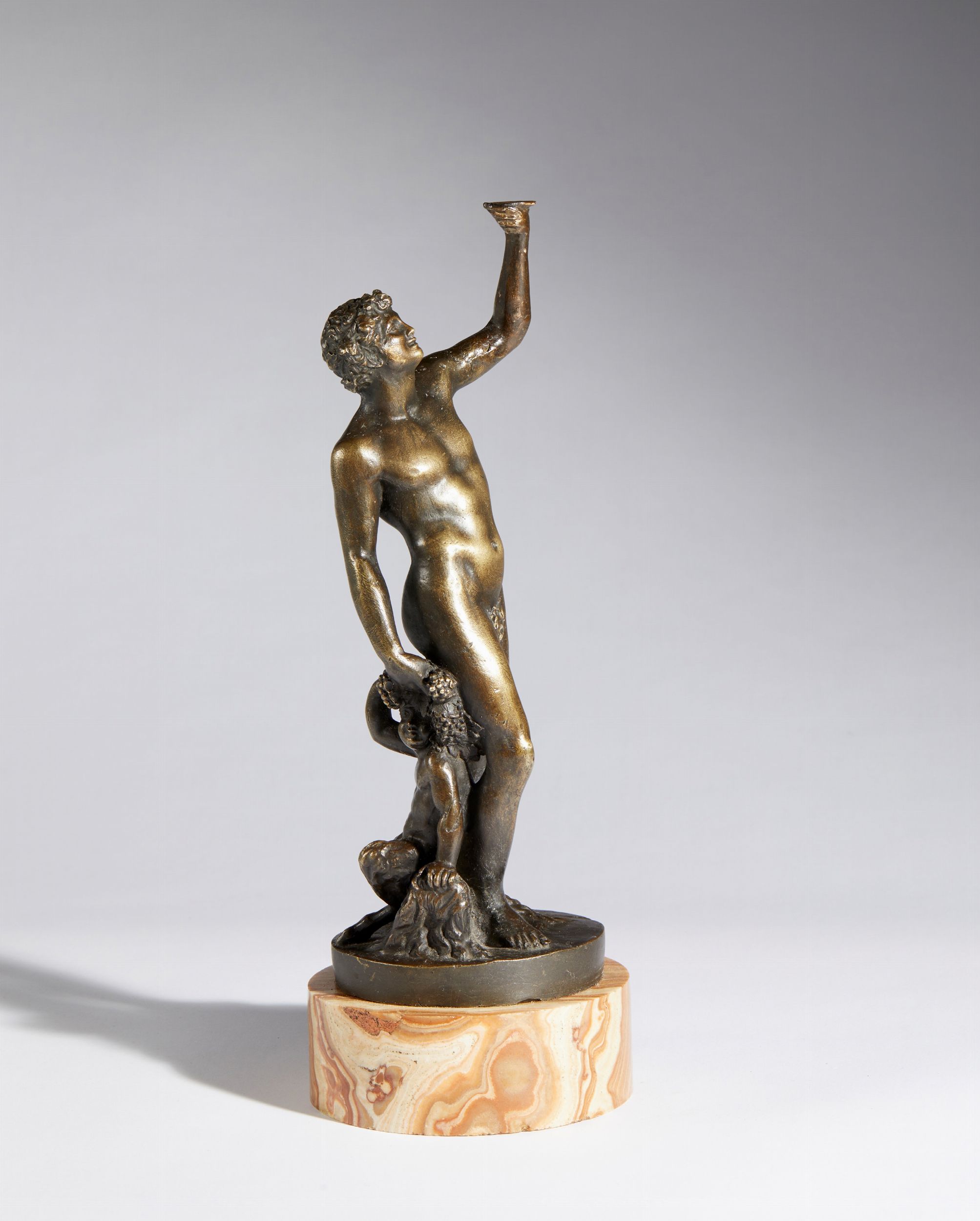 XVIII-XIX secolo Bronzo con patina bruna; Misure con base: 34,5x13xx13 cm. Misure senza base: 30x11x11 cm. Questo bel bronzetto si ispira alla cultura marmorea realizzata da Jacopo Sansovino nel 1515 per decorare o giardini di Giovanni Bartolini a Firenze. In seguito, fu donata a Cosimo I e collocata a Palazzo Vecchio, insieme ad opere di Michelangelo, Baccio Bandinelli e Benvenuto Cellini. La nostra scultura rientra nel gusto del Grand Tour della fine del XVIII secolo e degli inizi di quello successivo, periodo in cui grandi fonderie realizzarono copie delle più famose sculture classiche rinascimentali presenti nelle collezioni italiane. La scultura del nostro Bacco ebbe grande successo e fu tradotta in bronzo anche da grandi scultori; fra tutti ricordiamo Massimiliano Soldani Benzi (Montevarchi, 1656- 1740), che realizzò il bronzo ora conservato al Museo Nazionale del Bargello (Firenze) con la variante dell' esclusione del satiretto dalla composizione. Il nostro bronzetto riproduce fedelmente, in scala, tutta la composizione originale del Sansovino. Inoltre, presenta un modellato spigliato ed originale che, insieme ad una certa matericità non esente da piccoli difetti di fusione, lo colloca fra le copie antiche del soggetto probabilmente nel XVIII secolo. Bibli. Eike D. Shmidt, Sandro Bellesi, Riccardo Gennaioli, Plasmato dal Fuoco, catalogo della mostra, Le Sillabe ed., Livorno, 2019, pag. 72, fig. 7.