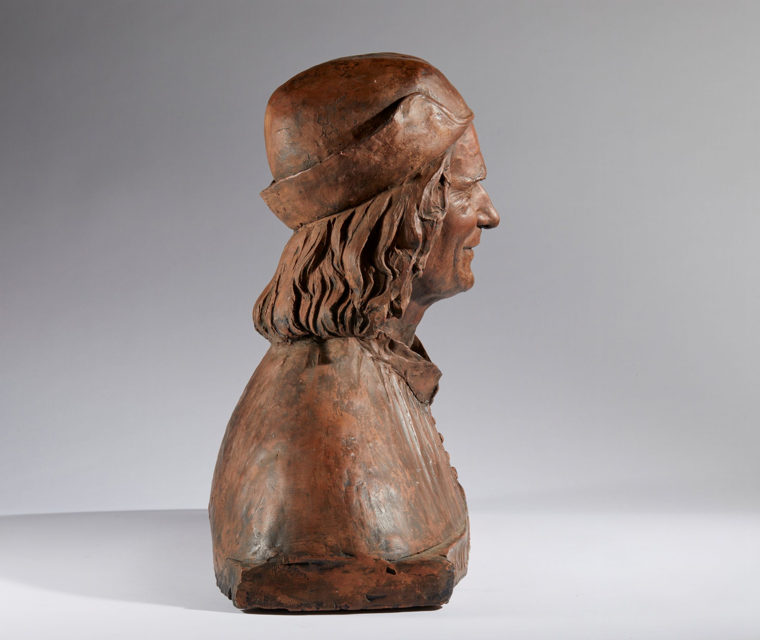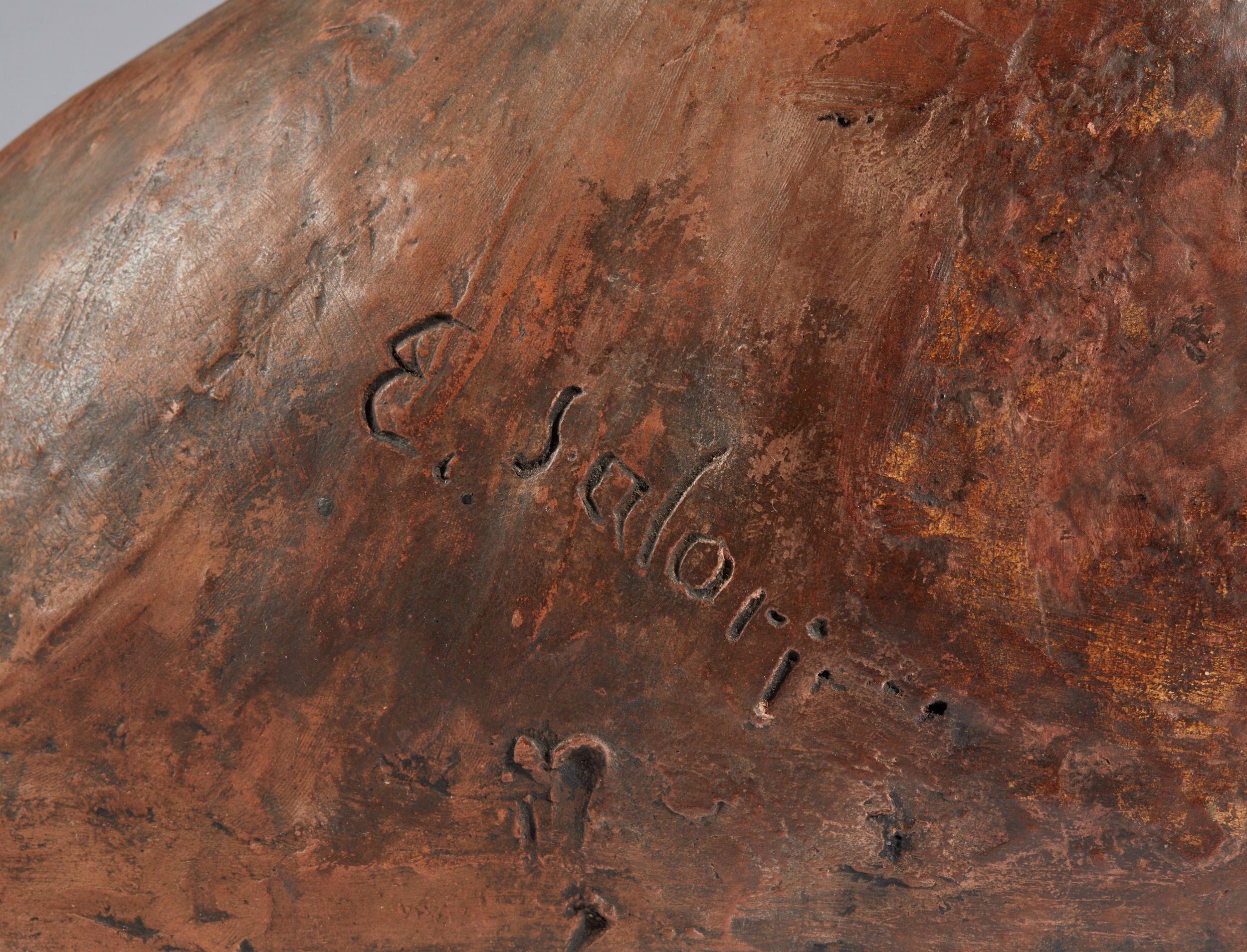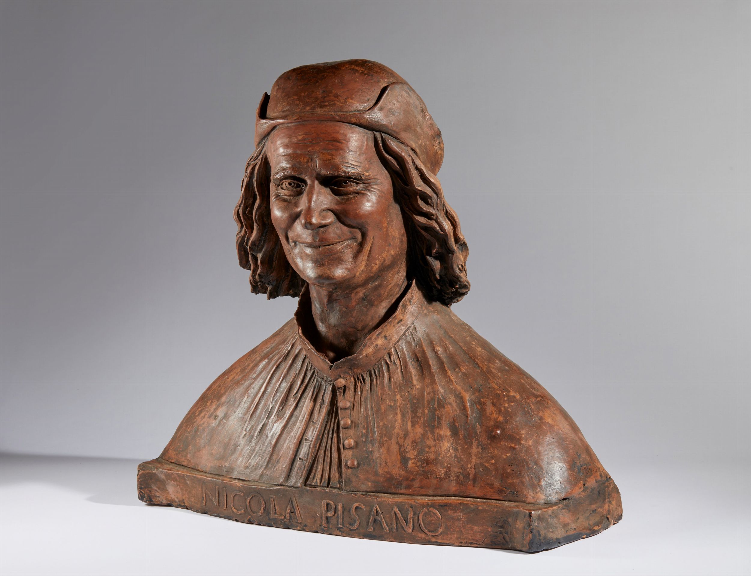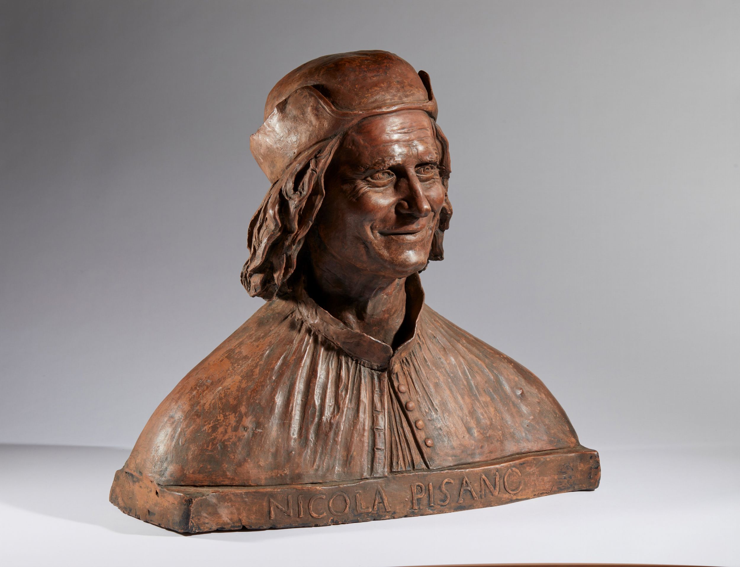 Toscana XIX secolo Firmato E. Salori Terracotta; 53x55x30 cm. Questo grande busto rientra nella produzione di gusto neo-rinascimentale tardo ottocentesca. Ci sembra di trovarci davanti ad un ritratto del Verrocchio, ma siamo invece nel XIX secolo. Si tratta di una terracotta modellata a stecca, e quindi realizzata a stampo, cavo all'intero. La firma E. Salori, almeno così sembra leggibile, al momento non trova riscontri nei testi in mio possesso. Senz'altro, lo scultore che ha realizzato questo splendido ritratto di Nicola Pisano era dotato di grande capacità tecnica, in quanto la resa naturalistica è grandiosa. Inoltre, la realizzazione di una terracotta di queste dimensioni comporta difficoltà tecniche, in quanto riguarda la fase di cottura. Non esistendo ritratti analoghi del grande scultore-architetto toscano, il nostro artista si è ispirato alla xilografia stampata nel frontespizio 'Vite' del Vasari.