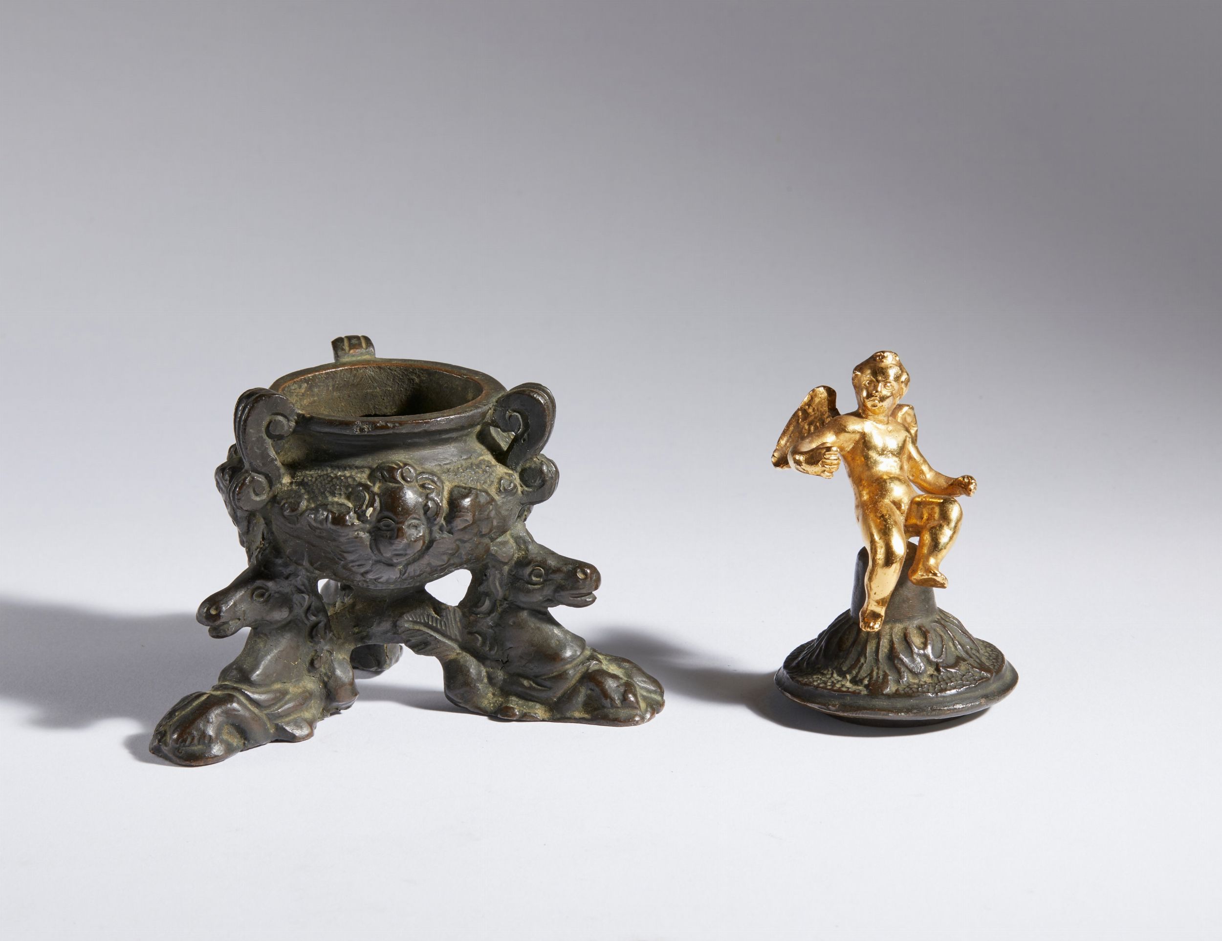 Bronzo patinato nero e dorato; 15x11x10,5 cm. Questo calamaio viene attribuito alla fonderia di Giuseppe de Levis, fonditore ebreo veronese. Un modello pressoché identico appartiene alla collezione Thyssen Bornemisza, schedato da Anthony Radcliffe come bottega di De Levis. Il corpo centrale presenta tre facce d' angelo divise da volute in aggetto e sorretto da altrettanti ippocampi. Sul tappo un amorino dorato al mercurio in perfette condizioni. La fusione ha poca lavorazione a freddo ed è piuttosto materica, ricoperta da una lacca nera, elemento distintivo dell' epoca a cui appartiene, il secolo XVII. Bibl. Charles Avery, Joseph de Levis & Company, Philip Wilson Publishers, London, 2016, p. 177. Anthony Radcliffe-Malcolm Baker-Michael Maek-Gerard, The Thissen Bornemitsza Collection Renaissance and Later Sculpture, Philip Wilson Publishers, London, 1992, pp. 234-237.