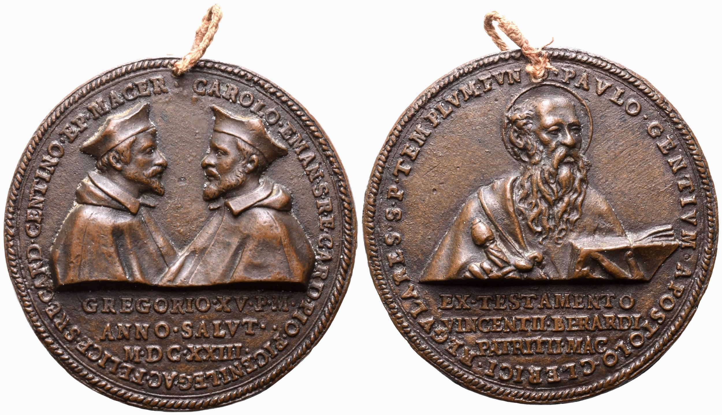 Medaglia in bronzo; mm 73,3; gr 161. Foro in alto. Fusione coeva D/ PAVLO GENTIVM APOSTOLO CLERICI REGULARES S. P. TEMPLUMENTIUM San Pietro con spada e libro EX TESTAMENTO VINCENTII BERARDI PATRITII MAC R/ CARLO EMANS S.R.E. CARD. PIO PICENI. LEGA C. FELICE S.R.E. CARD. CENTINO. EP. MACER due cardinali posti uno difronte all'altro. GREGORIO XV P.M. ANNO. SALVT. M.DC.XXIII Molto rara, inedita.