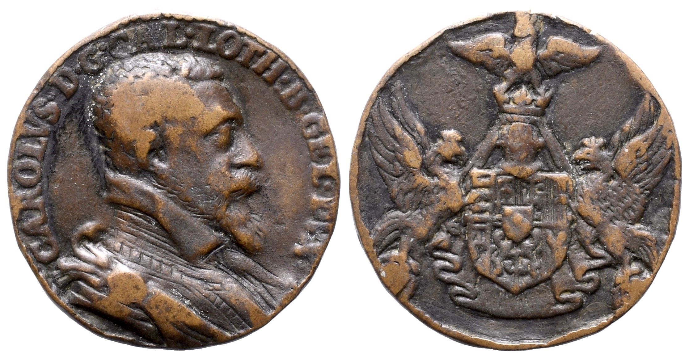 Medaglia in bronzo; mm 35; gr 13. Fusione antica D/ CAROLVS D G CAL LOTH B GEL DVX Figura maschile rivolta verso destra R/ Stemma