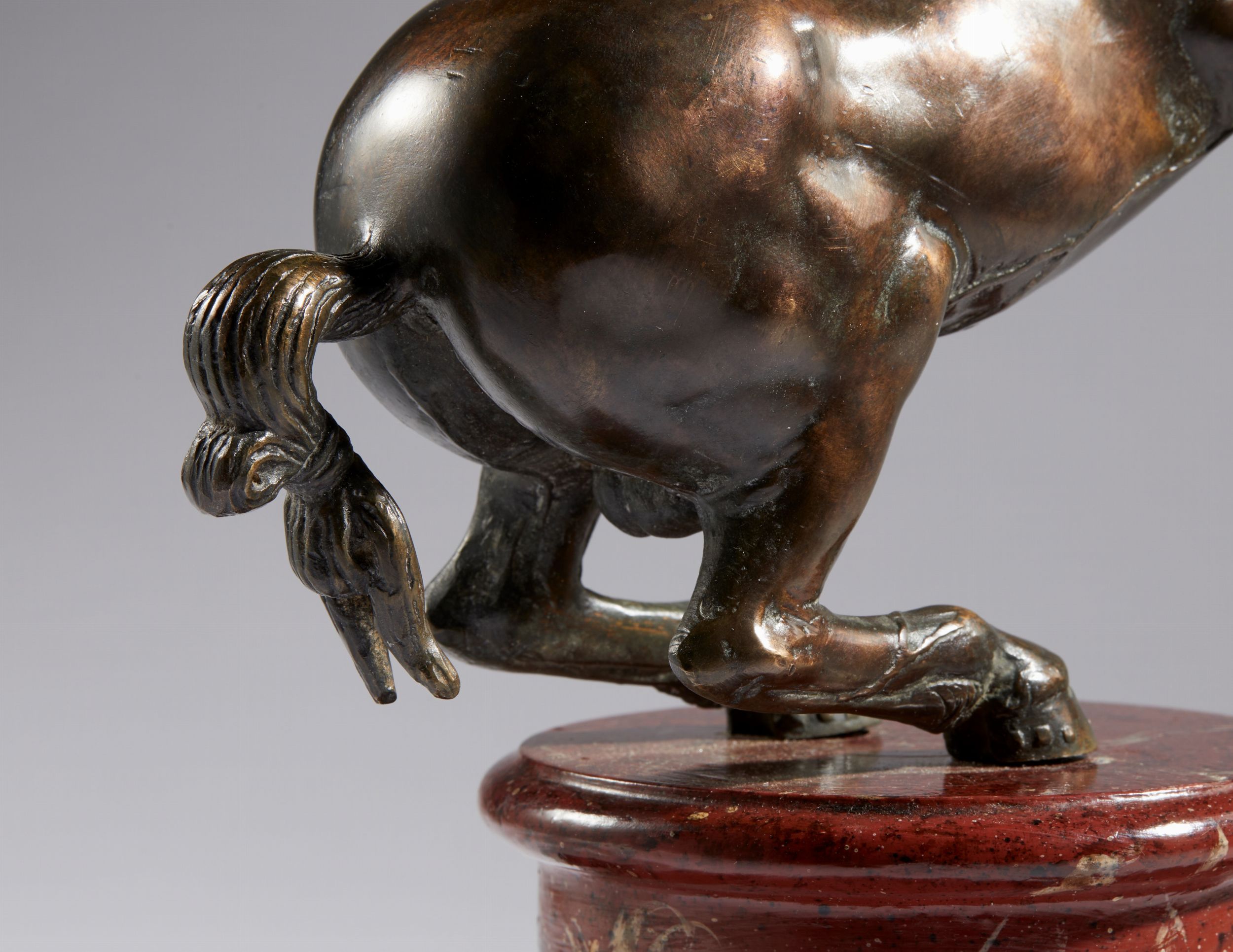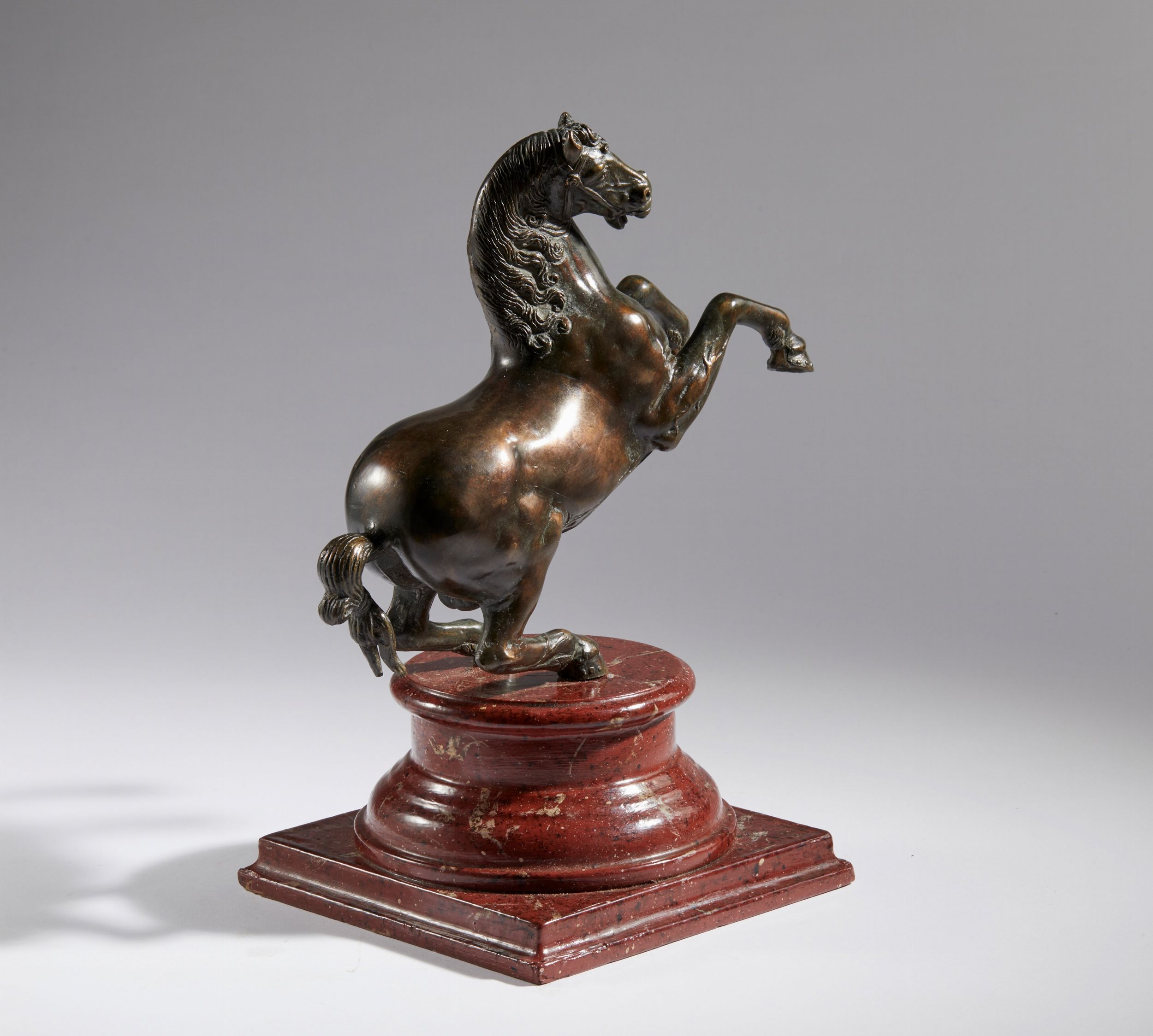 XVII-XVIII secolo Bronzo con patina trasparente rossastra; 32x25x8 cm Questo bel cavallo impennato deriva dai modelli dello scultore Francesco Fanelli. Nato a Firenze lavorò a Genova ed in seguito a Londra dove le sue opere furono molto apprezzate da Carlo I. Morì forse a Parigi. Bella fusione con patina trasparente rossastra tipica delle migliori produzioni fiorentine dal Rinascimento in poi. Il corpo è molto lavorato e lucido e presenta in evidenza le ramificazioni venose dell'animale. Il muso è ben modellato ed espressivo, stretto dai finimenti del morso che gli fanno spalancare la bocca e mostrare i denti. La criniera, poi, un capolavoro di cesello dove le lunghe ciocche si inseguono a formare nidi a vortice. La coda annodata con un fiocco alla maniera del monumento equestre del Gattamelata a Padova.