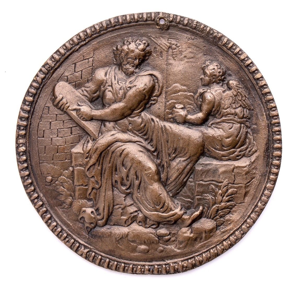 Scuola olandese XVI secolo Placchetta tonda in bronzo con patina marrone chiaro; mm 77,2; gr 51,5. San Matteo, seduto sopra un muretto, indica la tavola ad un angelo seduto a destra; sfondo con torri e mura; contorno perlinato. Fusione antica. Rif. Weber 1975 n. 708,1; Braun 1918 n. 146.
