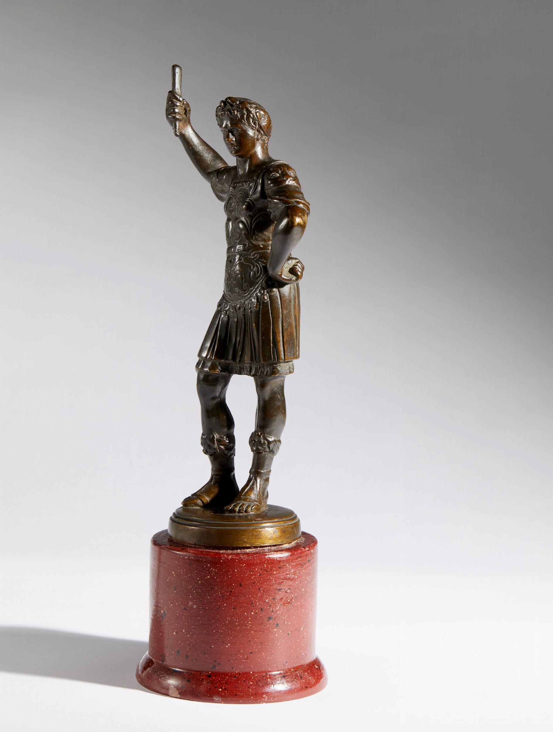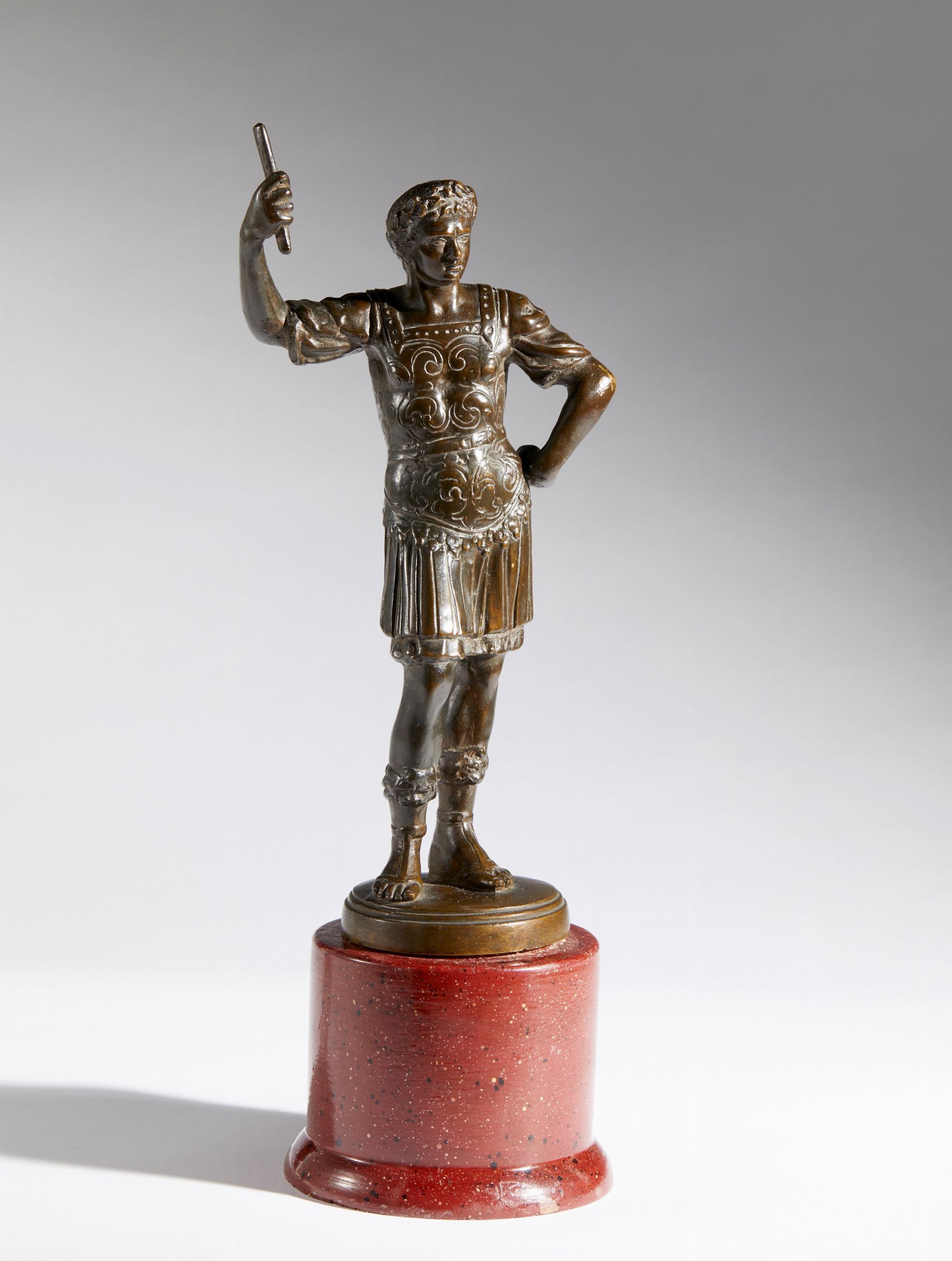 Scuola veneta?; XVI-XVII secolo Bronzo patinato, b ase in legno non coeva Misure con base: 36x14x8 Misure bronzo: 30x15x8 cm Questa bella statuetta raffigura un imperatore romano in lorica con un serto di alloro che gli cinge la testa. L'armatura è decorata a bulino con girali fogliacee simmetriche, sulle spalle due teste di leone. Riguardo a questo bronzo, si può fare un riferimento ad una statuetta conservata al Museo dell'Ermitage, che raffigura un imperatore romano, appunto, in lorica e con il serto di alloro in capo. Misure pressoché identiche e facente parte di una serie di imperatori giudicati rinascimentali. Si notino le somiglianze fra i due armigeri nell'armatura, nella postura e nella matericità della fusione. Oggetto di interesse particolare per la splendida patina traslucida naturale che emerge da quella artificiale originaria, più scura e bituminosa. Bella l'espressione volitiva e realistica del viso. Bibl. Sergej Androsov, Museo Statale Ermitage, La Scultura Italiana dal XIV al XVI secolo, Skira, Milano 2008, p.98.