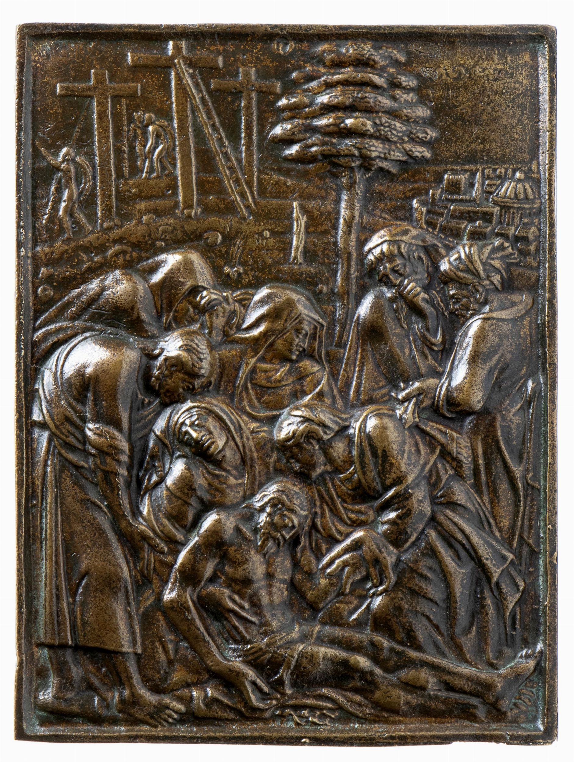 Scuola Emiliana XVI secolo Placchetta rettangolare in bronzo, patina marrone; mm 193 x 141,5; gr 677,1. In primo piano il Cristo morto seduto a terra, dietro la Vergine Maria sorretta da San Giovanni Battista e Maria Maddalena inginocchiata che gli tiene un braccio sollevato. Dietro, tre Pie Donne e San Giuseppe d'Arimatea. Sullo sfondo un albero e la città di Gerusalemme a destra, a sinistra il Monte del Calvario con tre croci, una scala e tre uomini di cui uno con lancia. Bordo rialzato. Bella fusione antica Bibli. Rossi F. coll. Scaglia 2011, IX-17 var. c; Calveri, 2003, n.62.